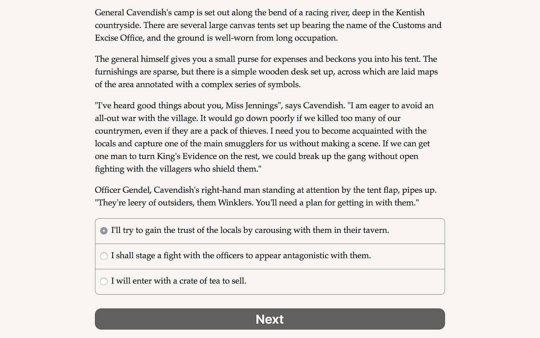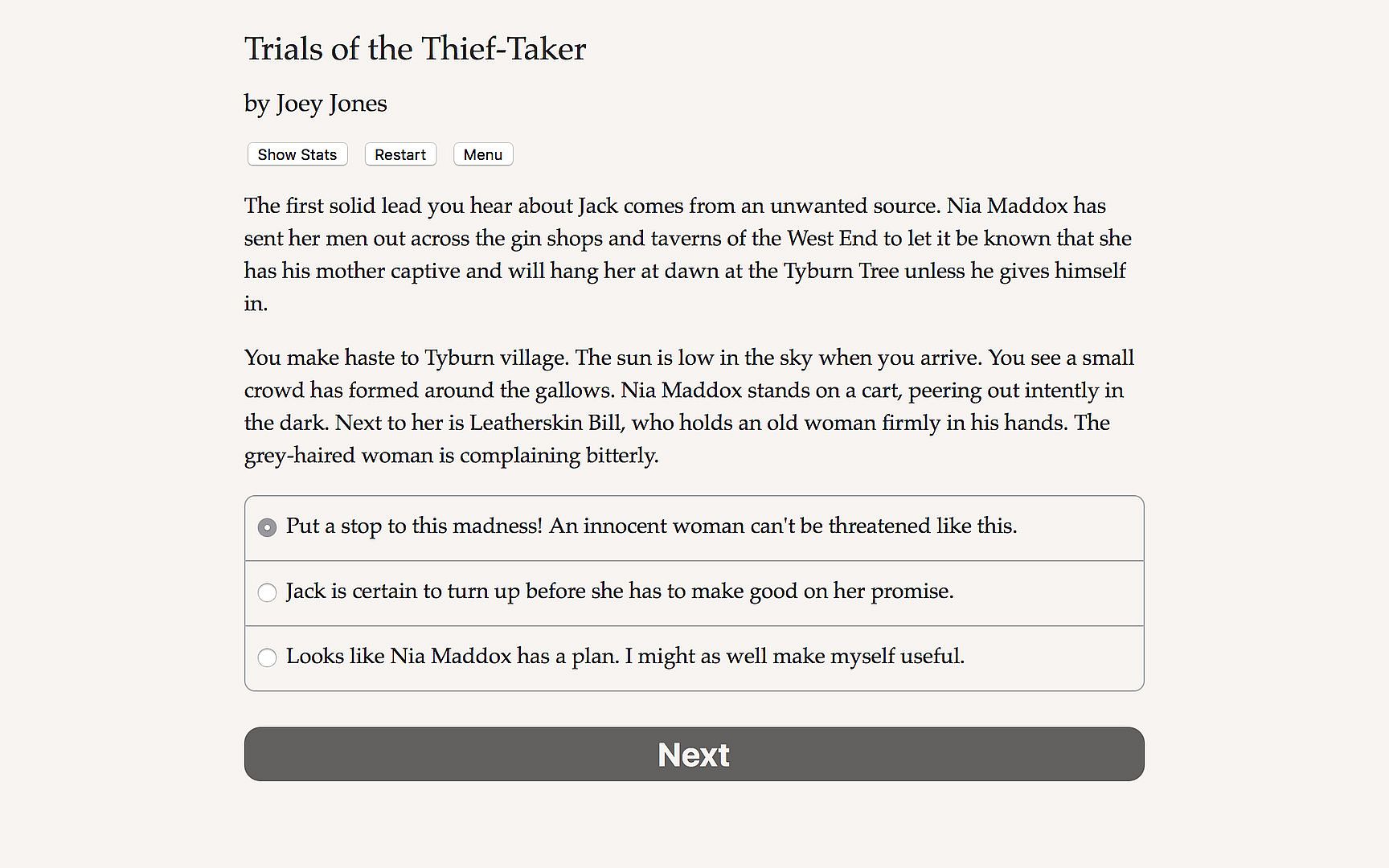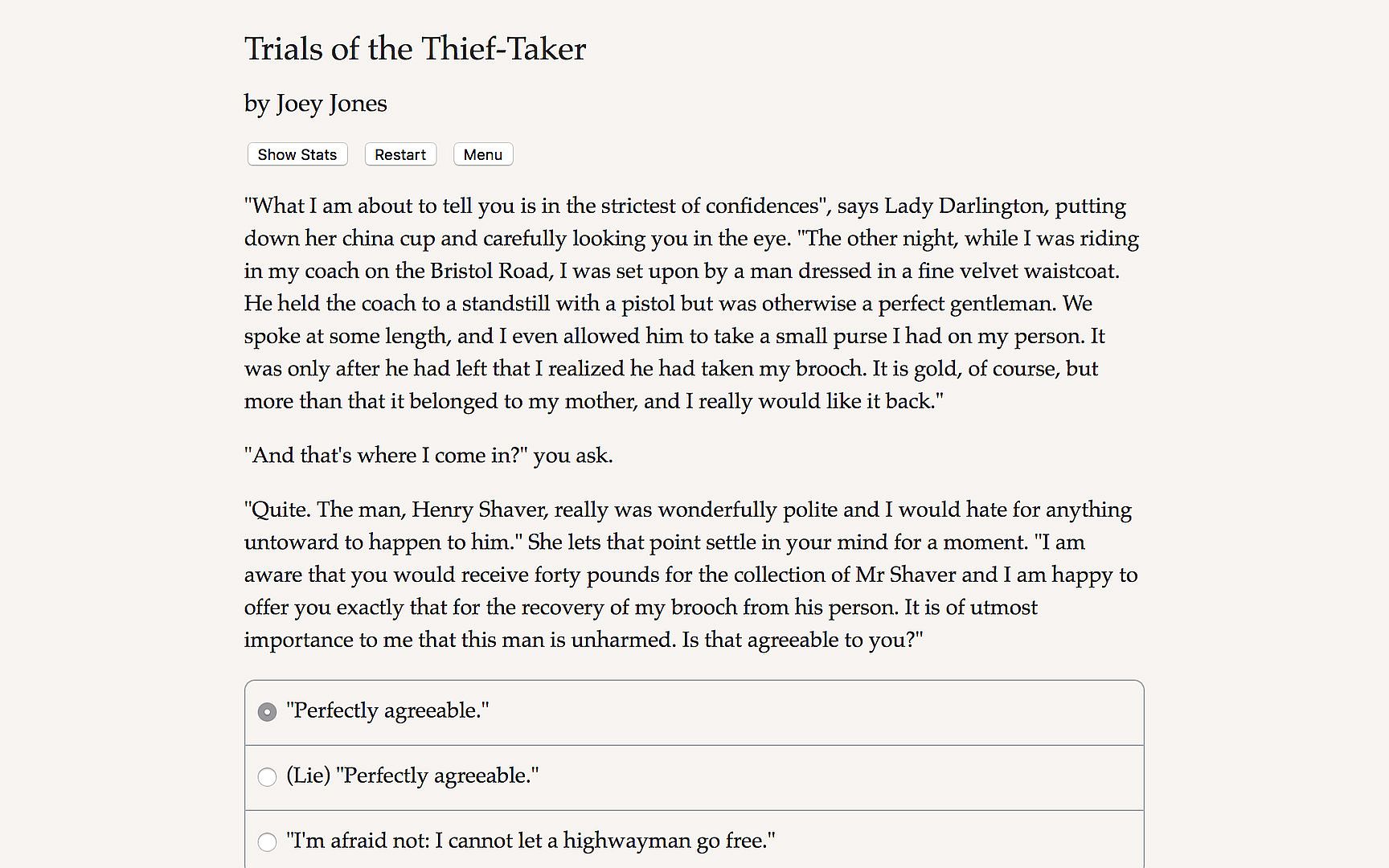 Trials of the Thief-Taker is a 140,000-word interactive historical adventure novel by Joey Jones, where your choices control the story. It's entirely text-based, without graphics or sound effects, and fueled by the vast, unstoppable power of your imagination.
