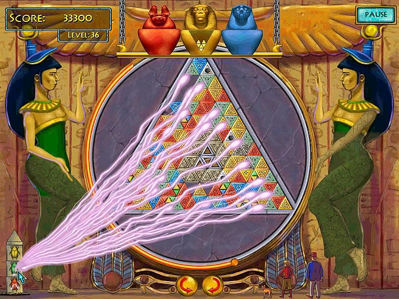 - Earn scarabs and use them strategically to clear all triangles of a single color from the chamber.