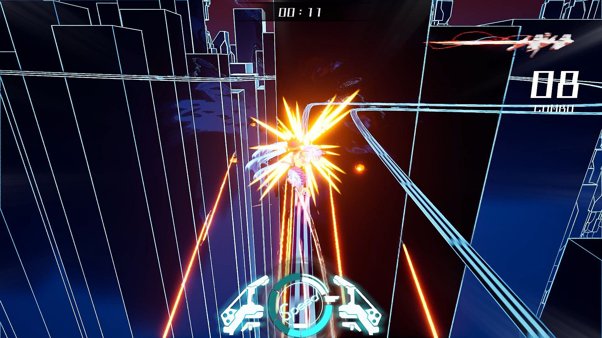 Take control of TRIUM, a humanoid antivirus program racing through a digital world to chase down the massive Intruder virus threatening the core. This on-rails action racing game tasks you with blasting minor viruses that clog your path, absorbing their energy to ramp up speed and close the gap. Players master a straightforward three-button setup: kick to smash foes ahead, and shift lanes to slam enemies from the sides. Rack up points through rapid destruction for branching endings, including a secret one at top ranks. The simple controls deliver authentic, fast-paced virus-killing action perfect for quick sessions. Free-to-play on PC, it hooks fans of on-rails racers craving score-driven challenges.