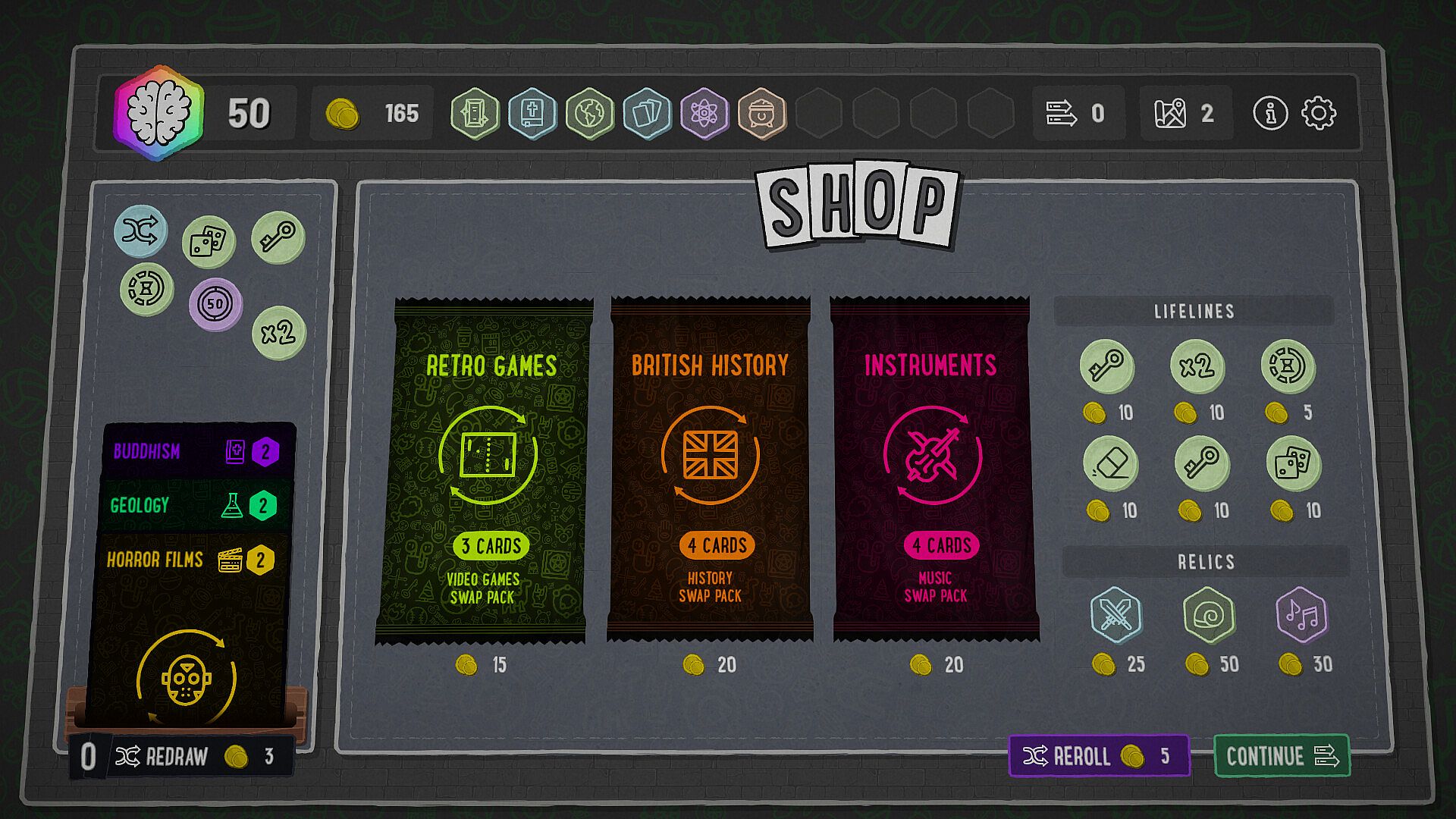 Between rounds, spend earned gold on lifelines, relics, and swap cards.