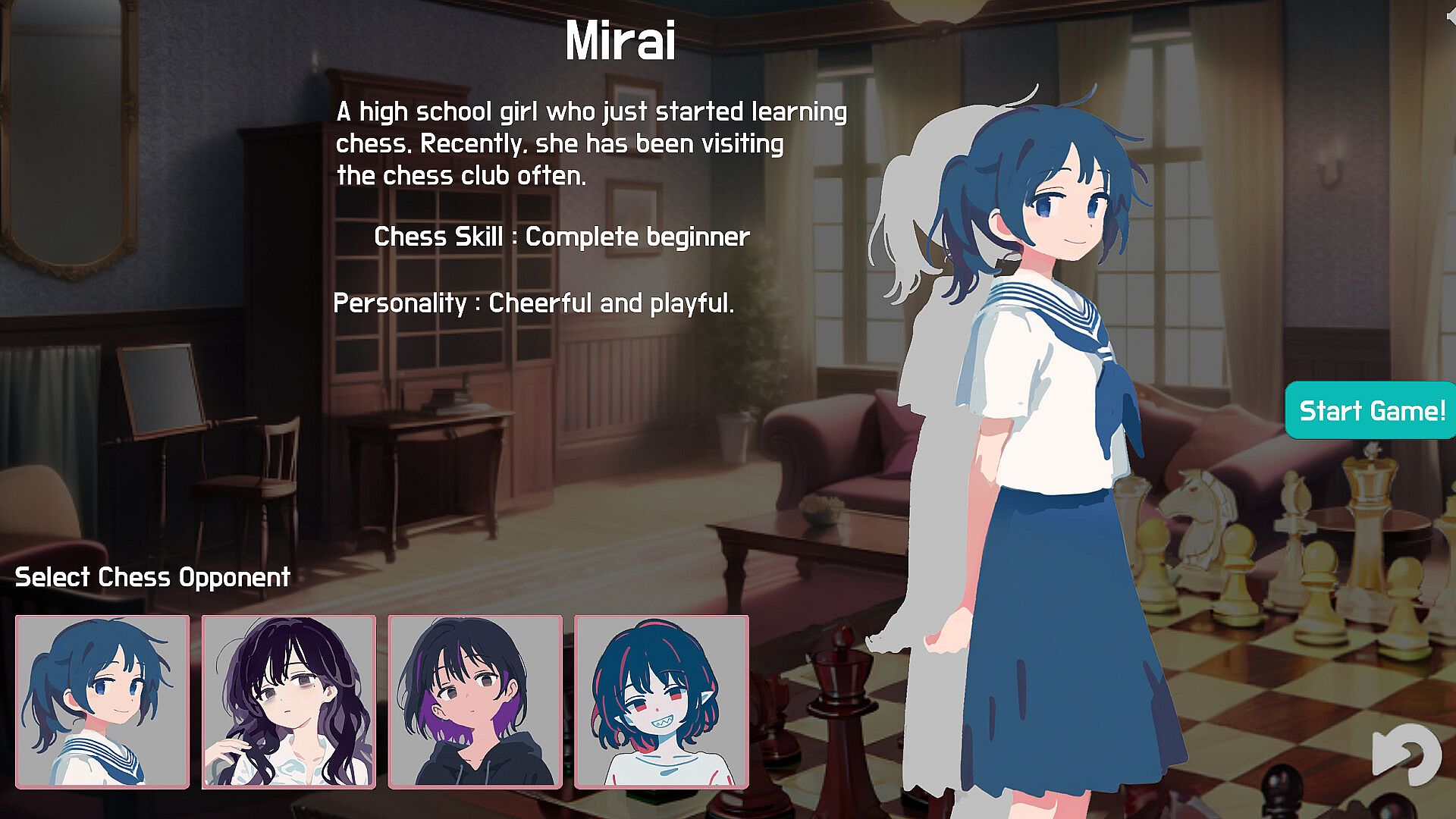Determined to try out your new powers at the local chess club, you’ll face four opponents ranging from Mirai, a beginner, to the mysterious club owner who surpasses human skill.