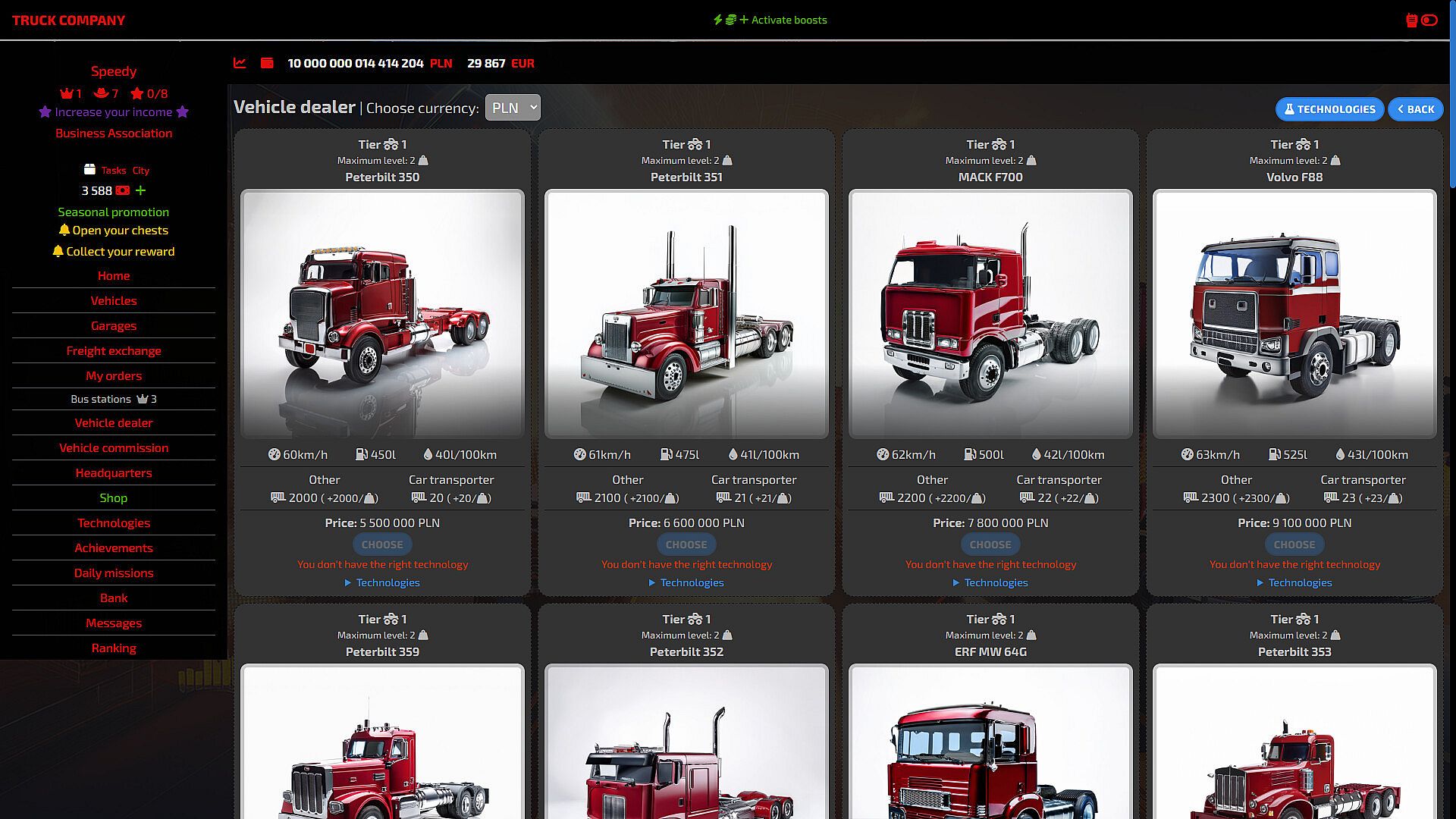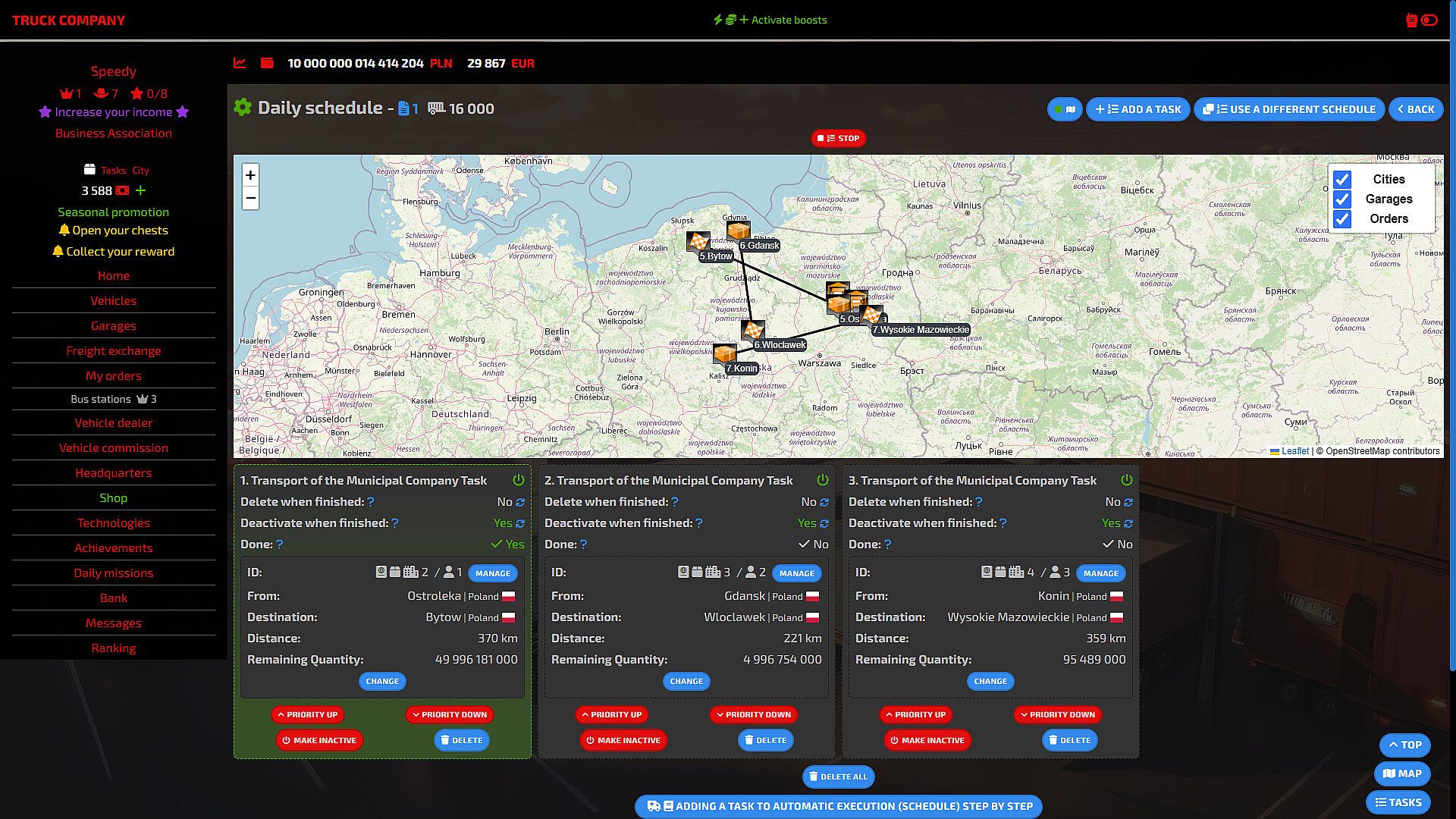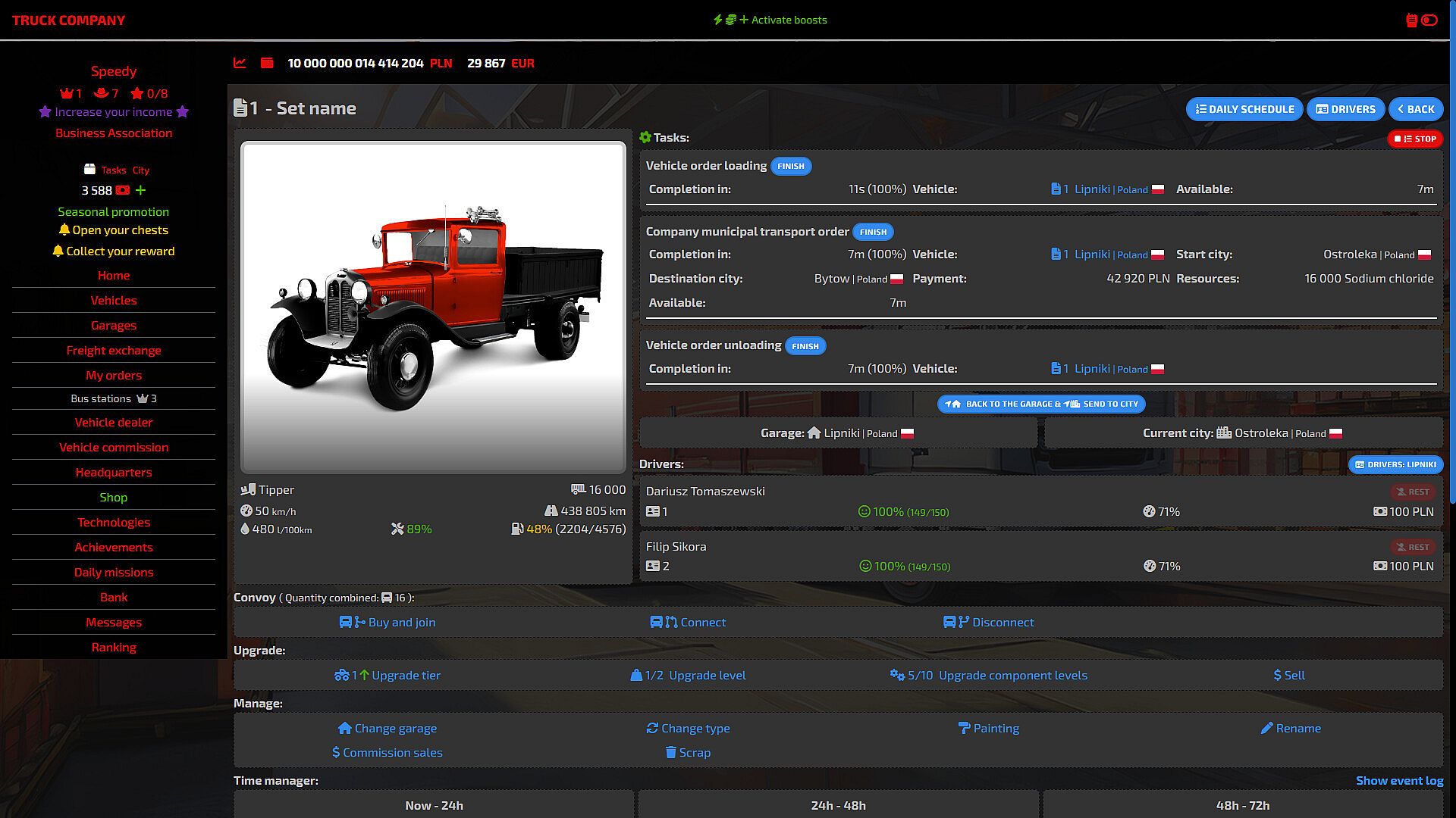 Truck Company is a real-time strategy game in which you and other players strive to gain the widest possible market share for your orders. You start by purchasing your first vehicle and searching for the most profitable orders for it, ensuring your truck operates 24/7 without wasting time on free flights. You also need to take care of your drivers, as a well-rested and experienced driver is key to ensuring your truck completes its tasks quickly and efficiently. Trucks require repairs over time, otherwise their speed decreases. Later, once you earn more money, you can build bus stations or shops to which you will have to deliver goods, either by purchasing them in advance or by producing them in your own factories. The direction of your company depends on you. The game is based on a natural system of supply and demand, so other players influence the profits you earn.
