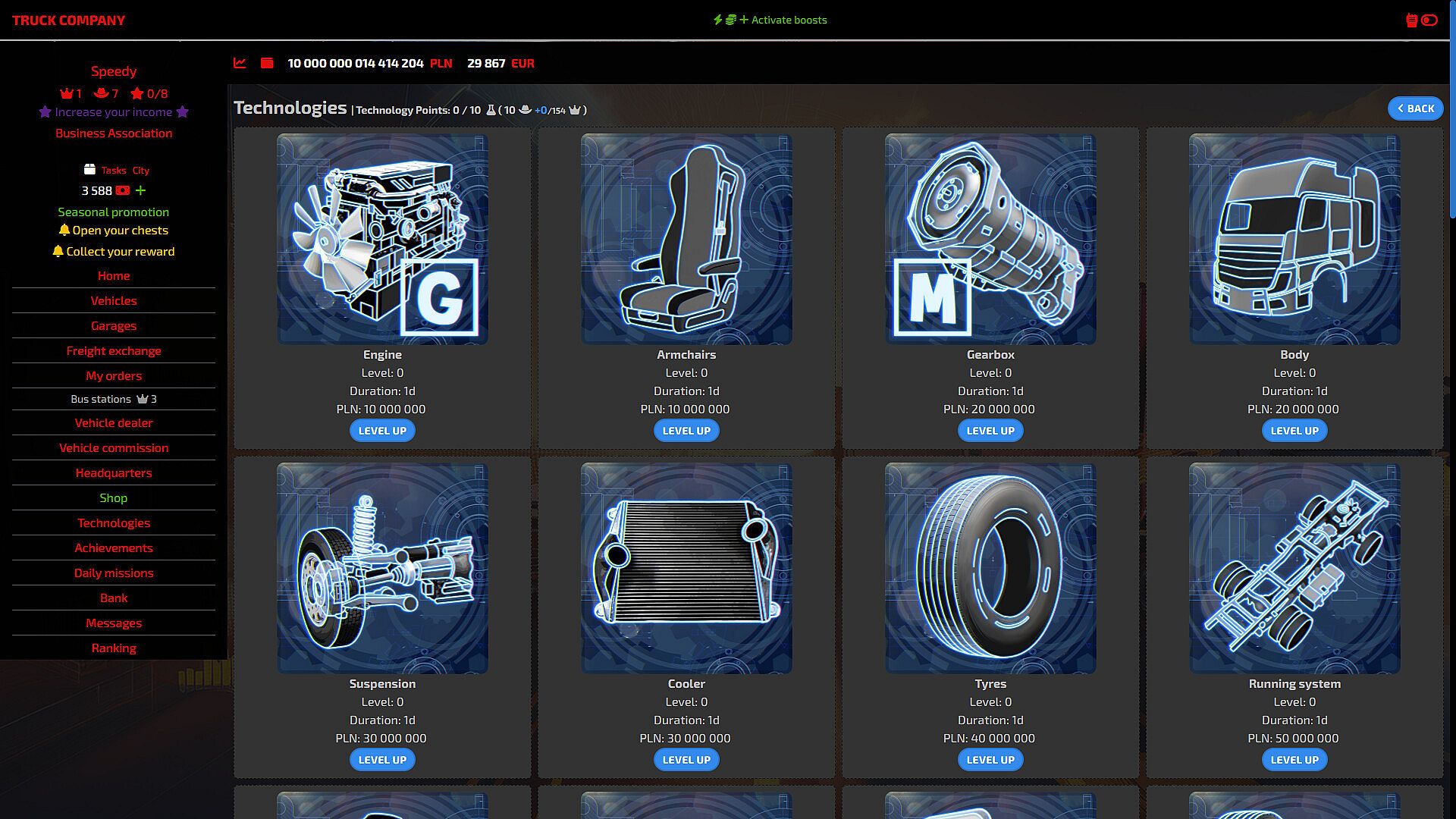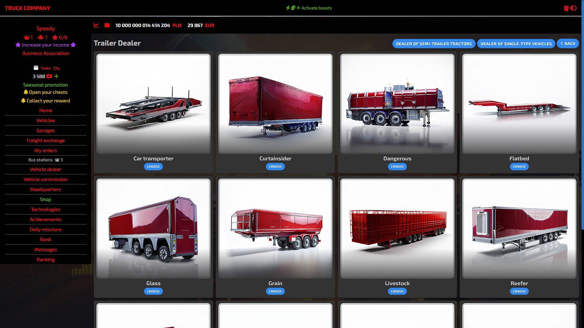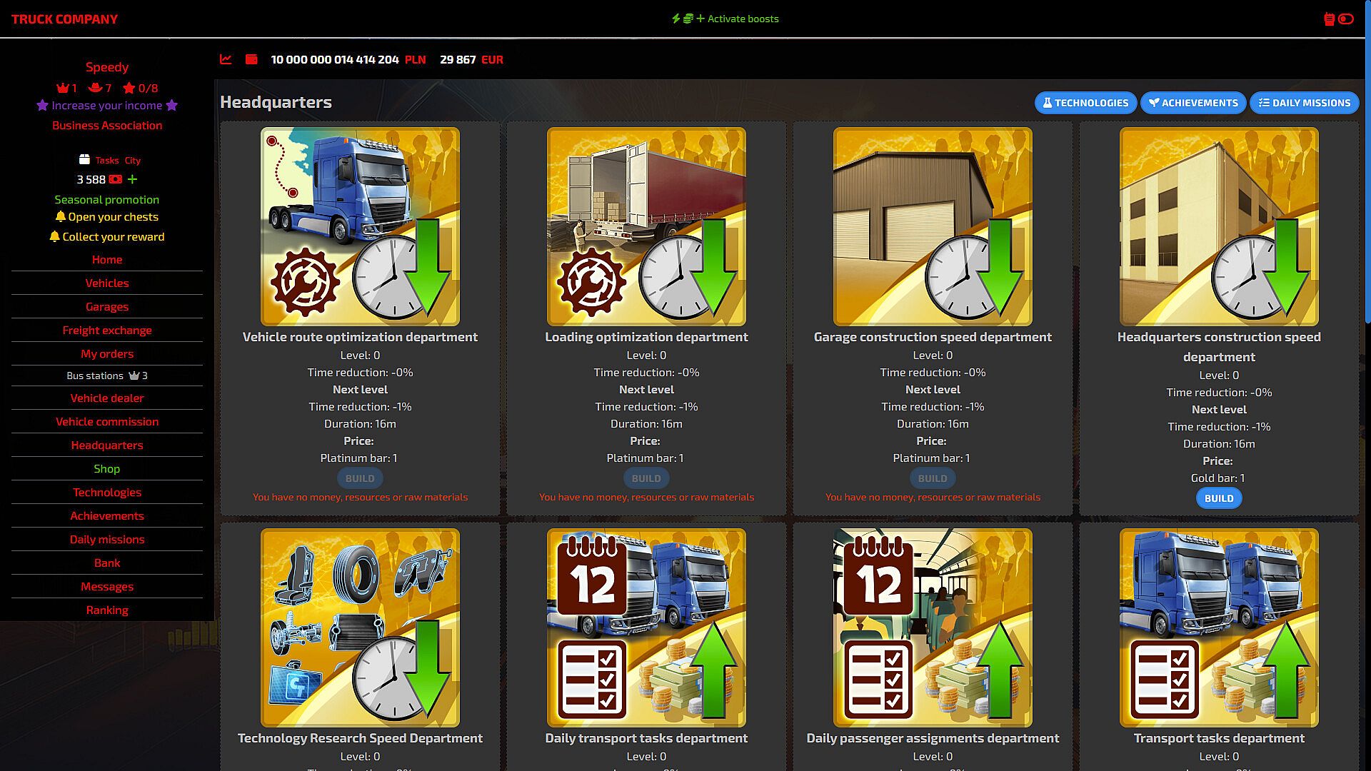 Truck Company is a real-time strategy game in which you and other players strive to gain the widest possible market share for your orders. You start by purchasing your first vehicle and searching for the most profitable orders for it, ensuring your truck operates 24/7 without wasting time on free flights. You also need to take care of your drivers, as a well-rested and experienced driver is key to ensuring your truck completes its tasks quickly and efficiently. Trucks require repairs over time, otherwise their speed decreases. Later, once you earn more money, you can build bus stations or shops to which you will have to deliver goods, either by purchasing them in advance or by producing them in your own factories. The direction of your company depends on you. The game is based on a natural system of supply and demand, so other players influence the profits you earn.
