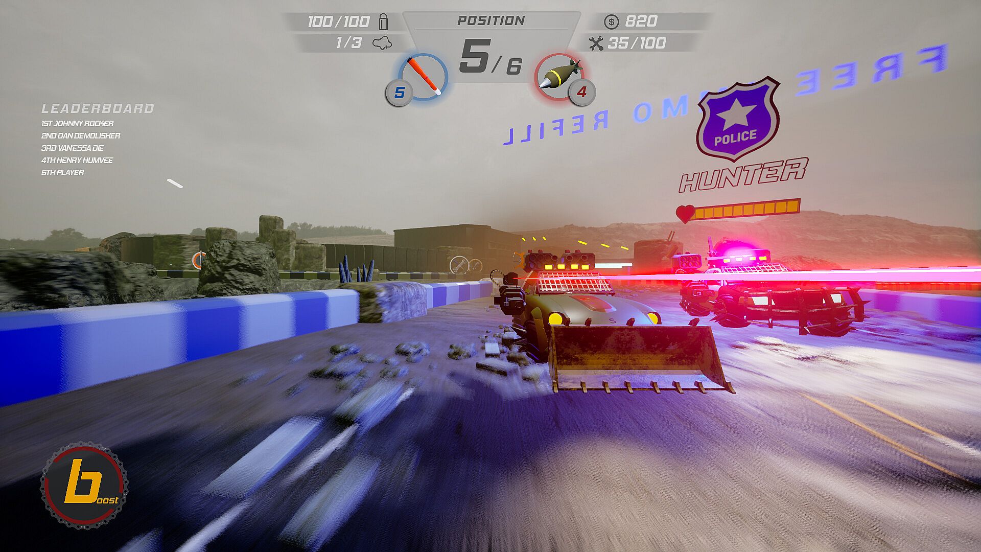 Race around dangerous circuits and shoot your opponents to death or get first to the finish line in this dynamic tactical combat racer inspired by Death Rally, Borderlands and Mario Kart. Win races to earn glorious prizes, spend your money to buy faster cars, deadlier weapons and upgraded equipment.