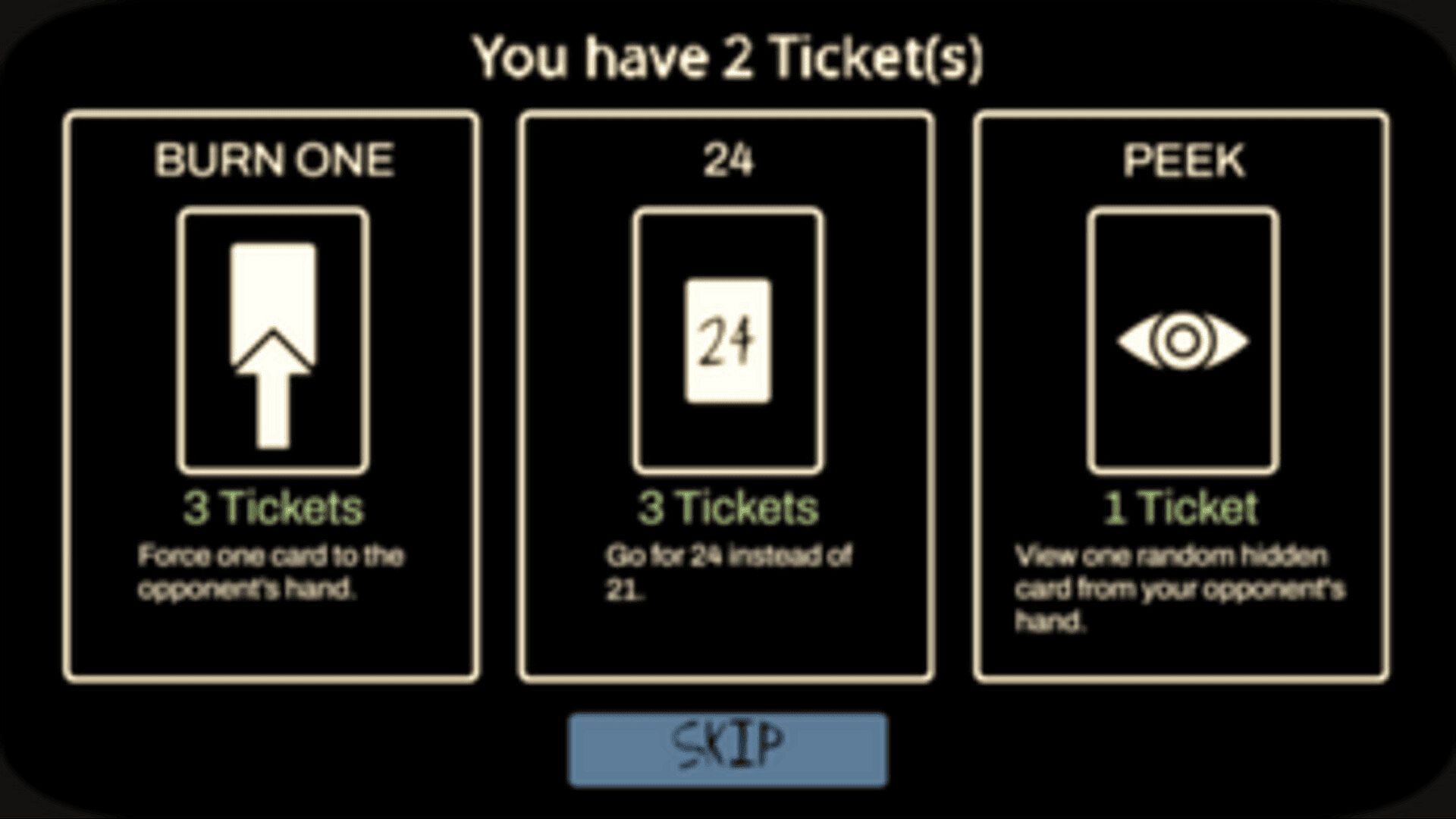 Every player gets access to Trump Cards — single-use twists that bend or break the rules of 21. Trump Cards can be bought, earned through riskier plays, or awarded after surviving intense matches.
