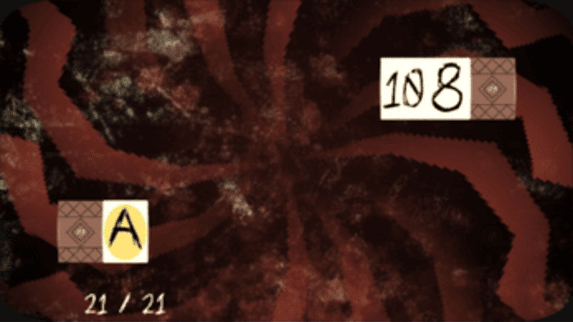 Each round, you are matched with an NPC to play "21", a dark variant of Blackjack.