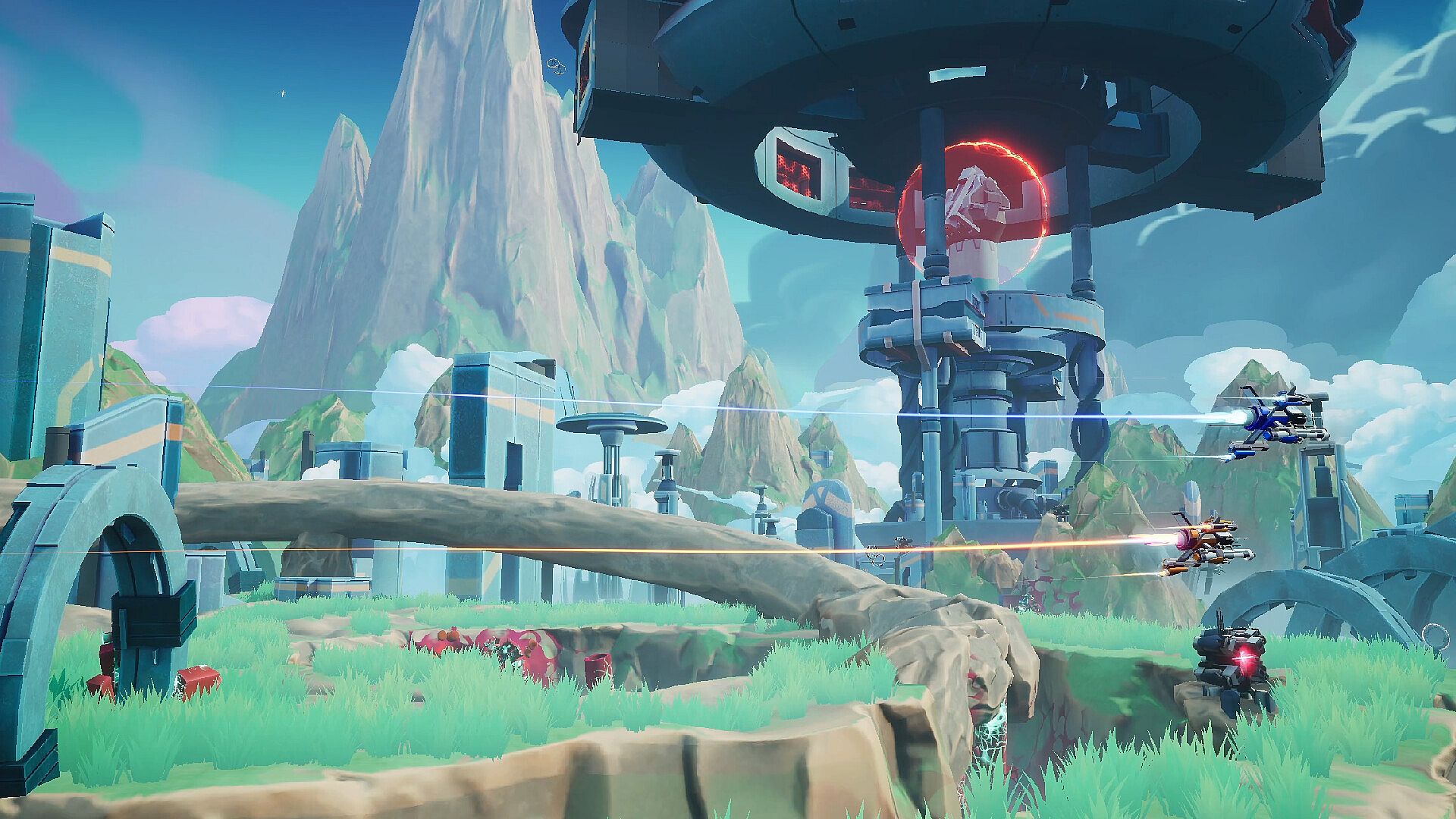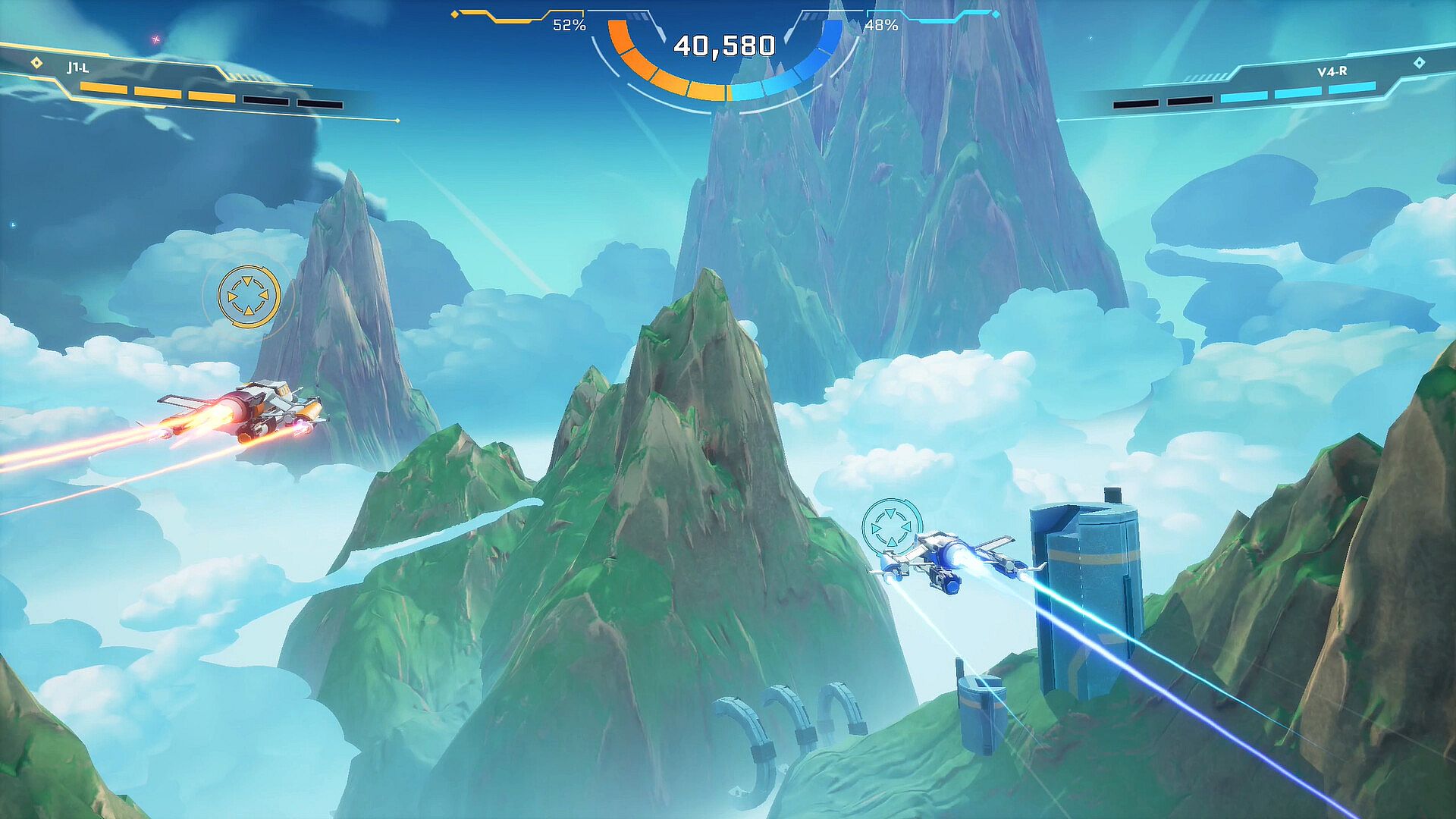 The pinnacle of Atmos Tech is the Twin Cores' ability to merge into a super-powered mega-drone! While in fusion-mode, players share controls: one pilots the drone, while the other controls its cannons.