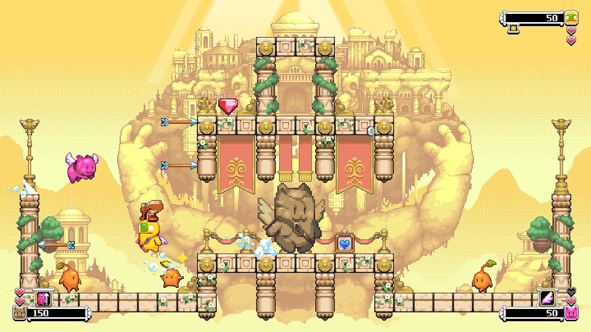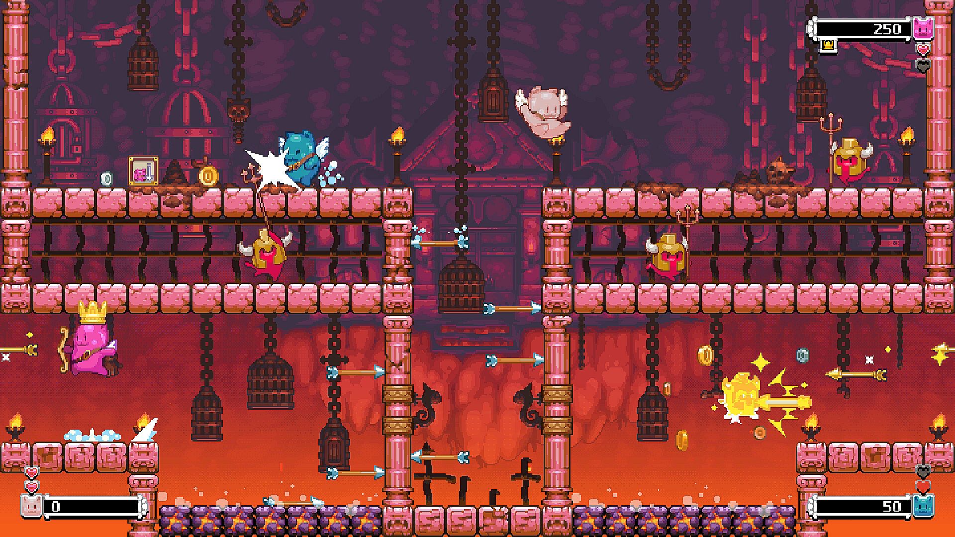 Introducing HATS! Battle amongst your friends or alone to see who will be crowned champion. Hats aren't just hilariously cosmetic but also come with additional buffs. Ditch the crown for new headwear and new powers... the twisted hat lets you shoot backwards, jump off enemies' heads with the old boot or turn yourself to stone with the Medusa Headdress.