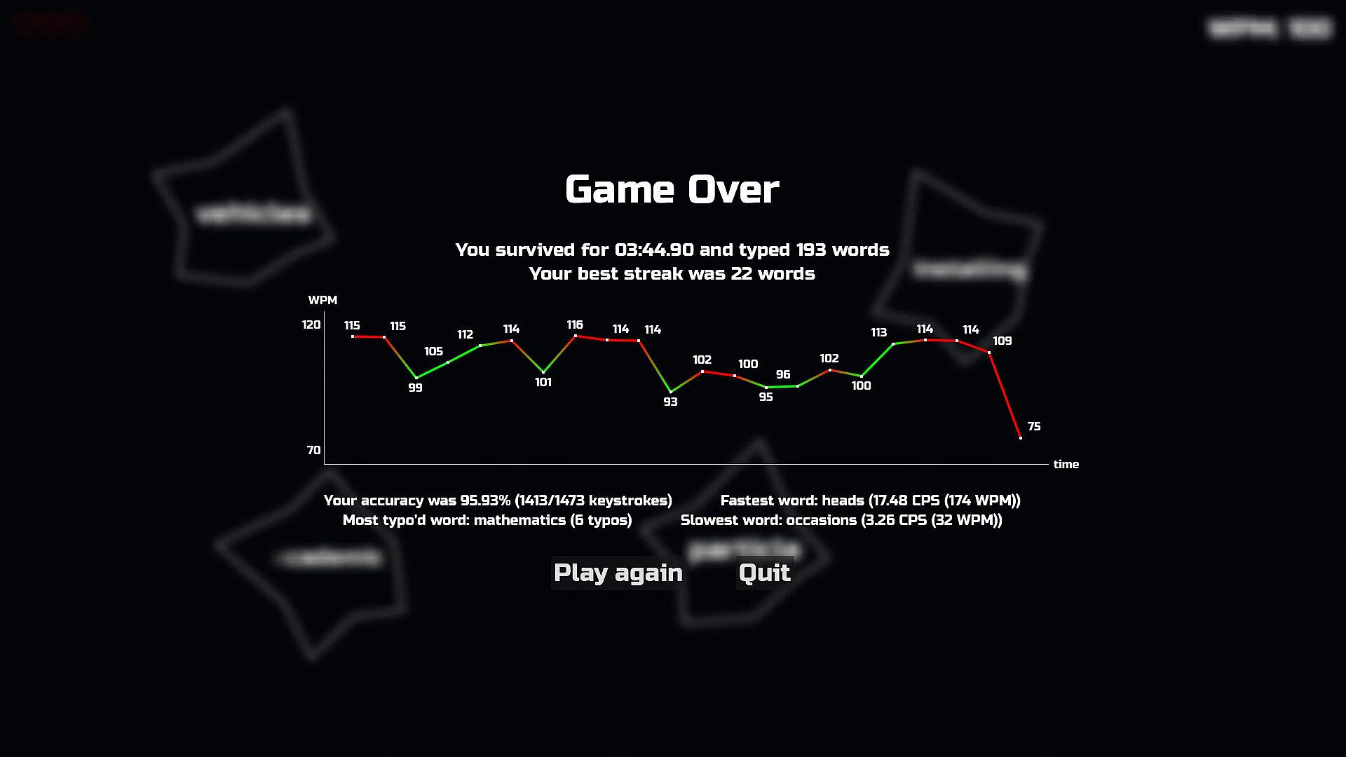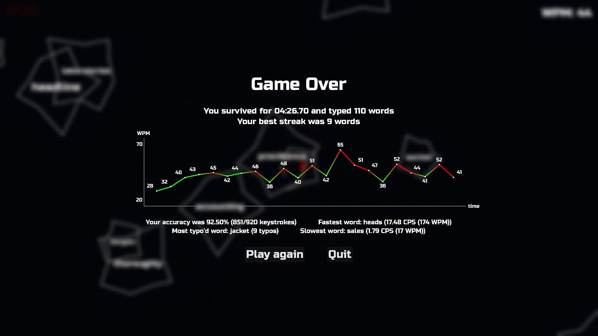 Dynamic difficulty will let you type away at the speed that's comfortable to you -- or why not challenge yourself by typing one-handed or with the keyboard upside down, or maybe you're trying to learn a new keyboard layout!