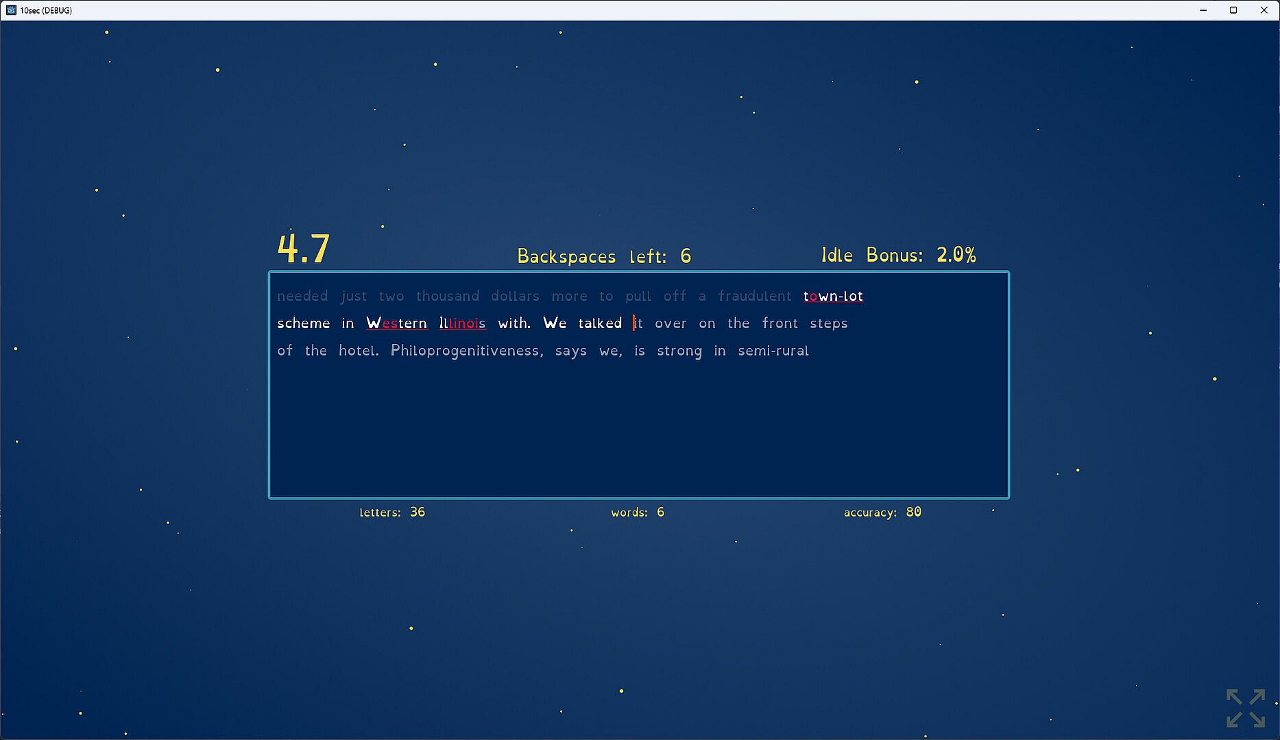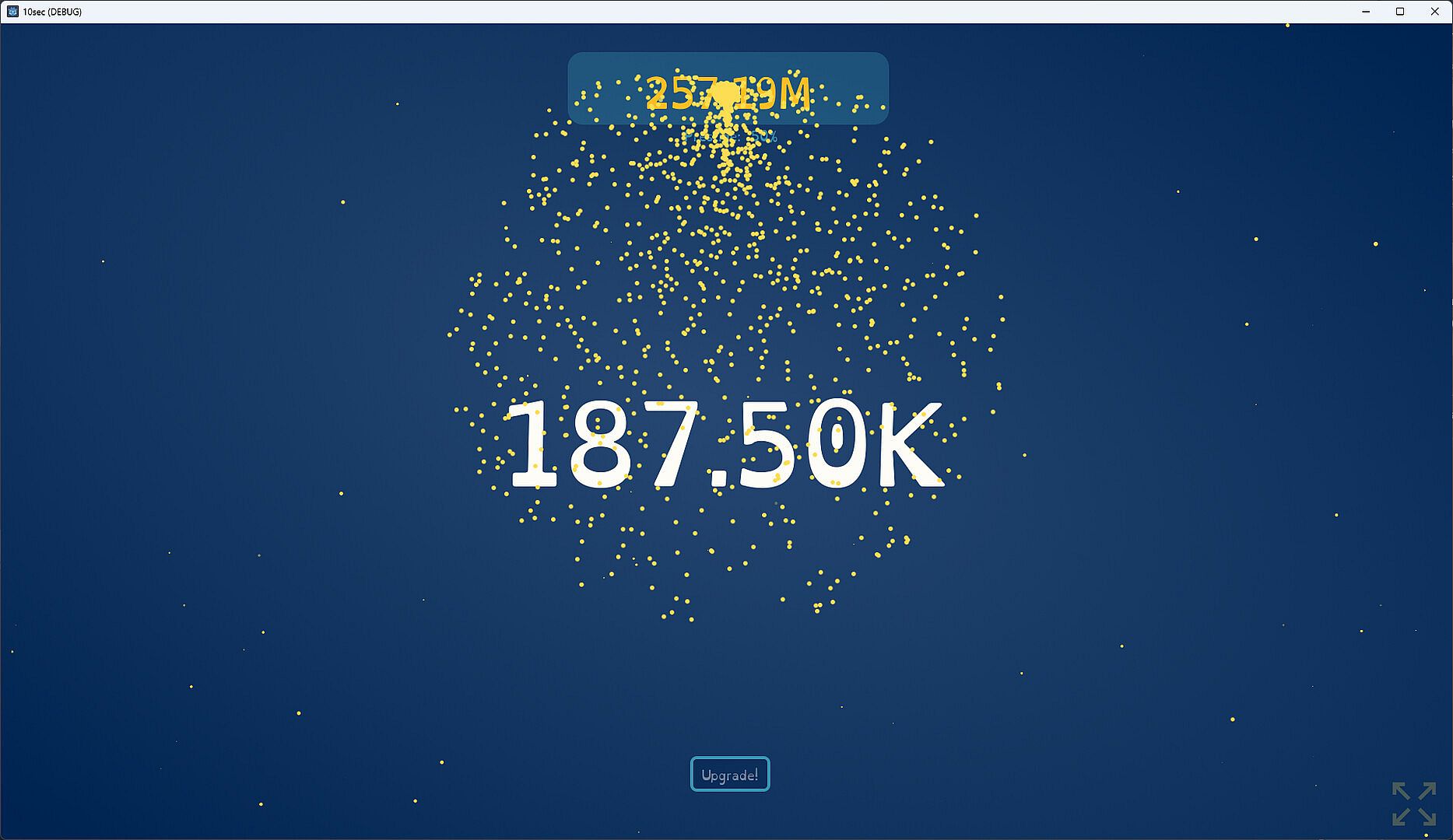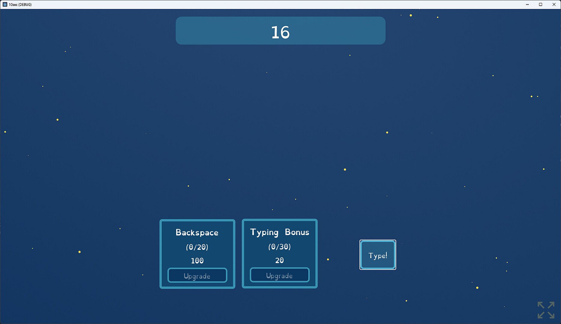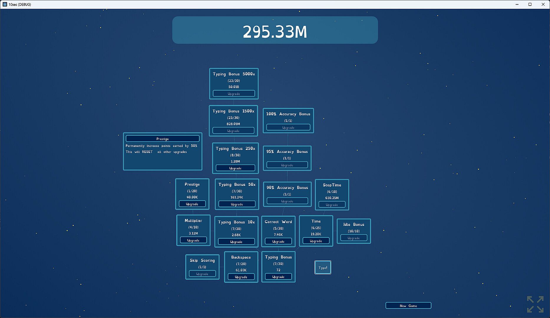 You start by typing as fast as you can for 5 seconds. Then you get a point for each correct letter you typed. These points can be used to buy upgrades. Upgrades can give you additional points, more typing time, accuracy bonuses, and other improvements. Then you type again, earning more points. Soon you’ll be earning hundreds, thousands, or even billions of points.