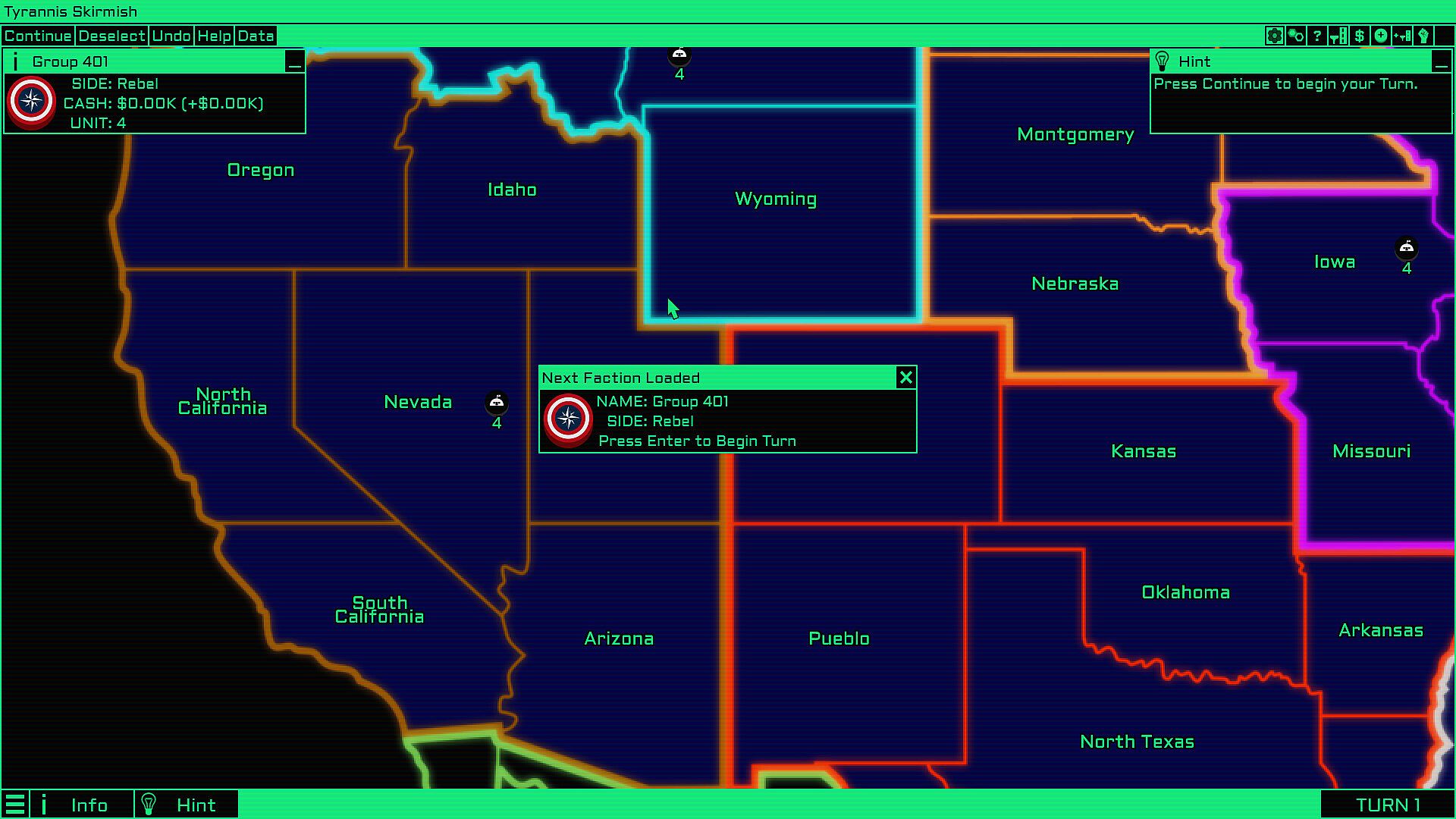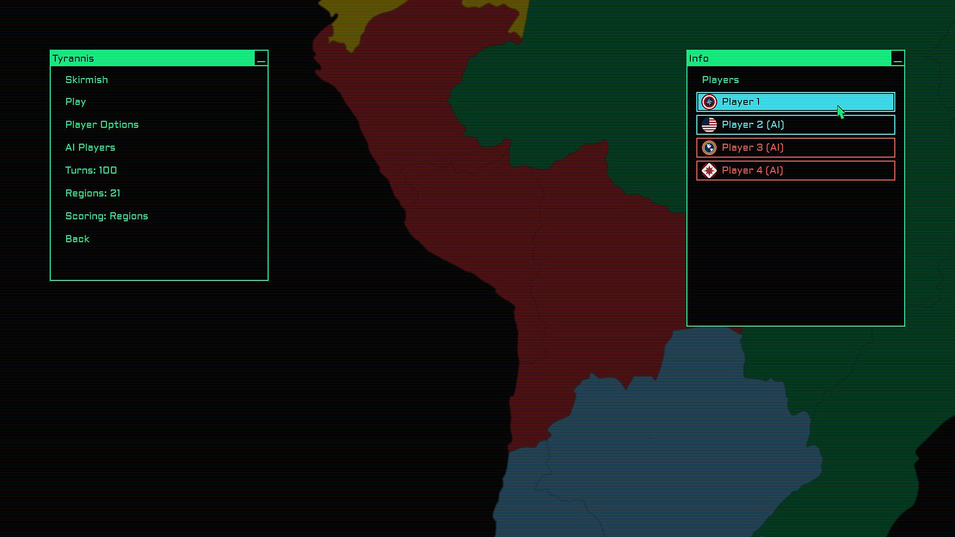 Tyrannis features twenty-one regions for you to defend or liberate, twenty-eight different factions with different abilities to encourage different strategies, as well as an AI with a modifiable aggression, offensiveness, and randomness on a per-player basis.