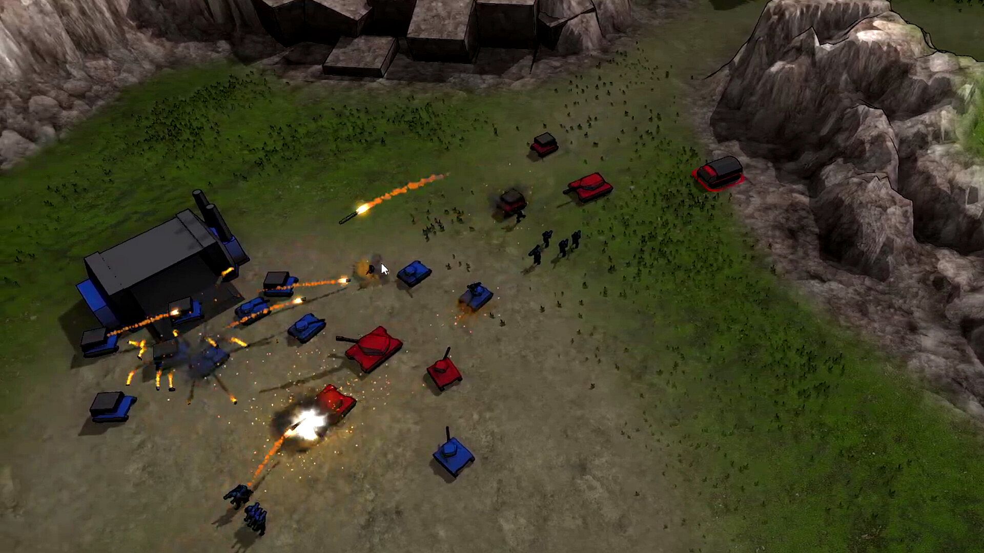 Your objective: Build a powerful force of tanks, rocket launchers, and infantry units to attack the enemy base and take control of the map. Victory is achieved by destroying either the enemy headquarters or all opposing units.