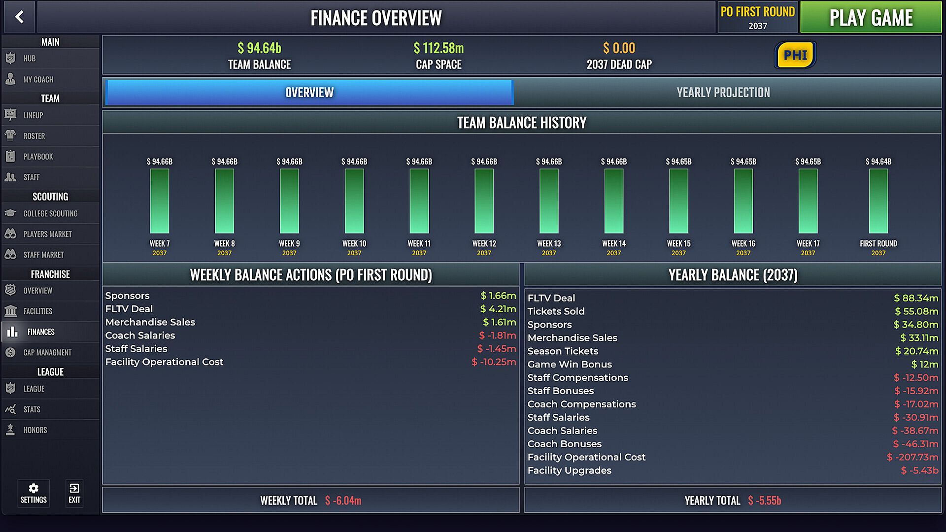 Sign franchise sponsorship deals to increase income and athletic gear contracts to boost player abilities.