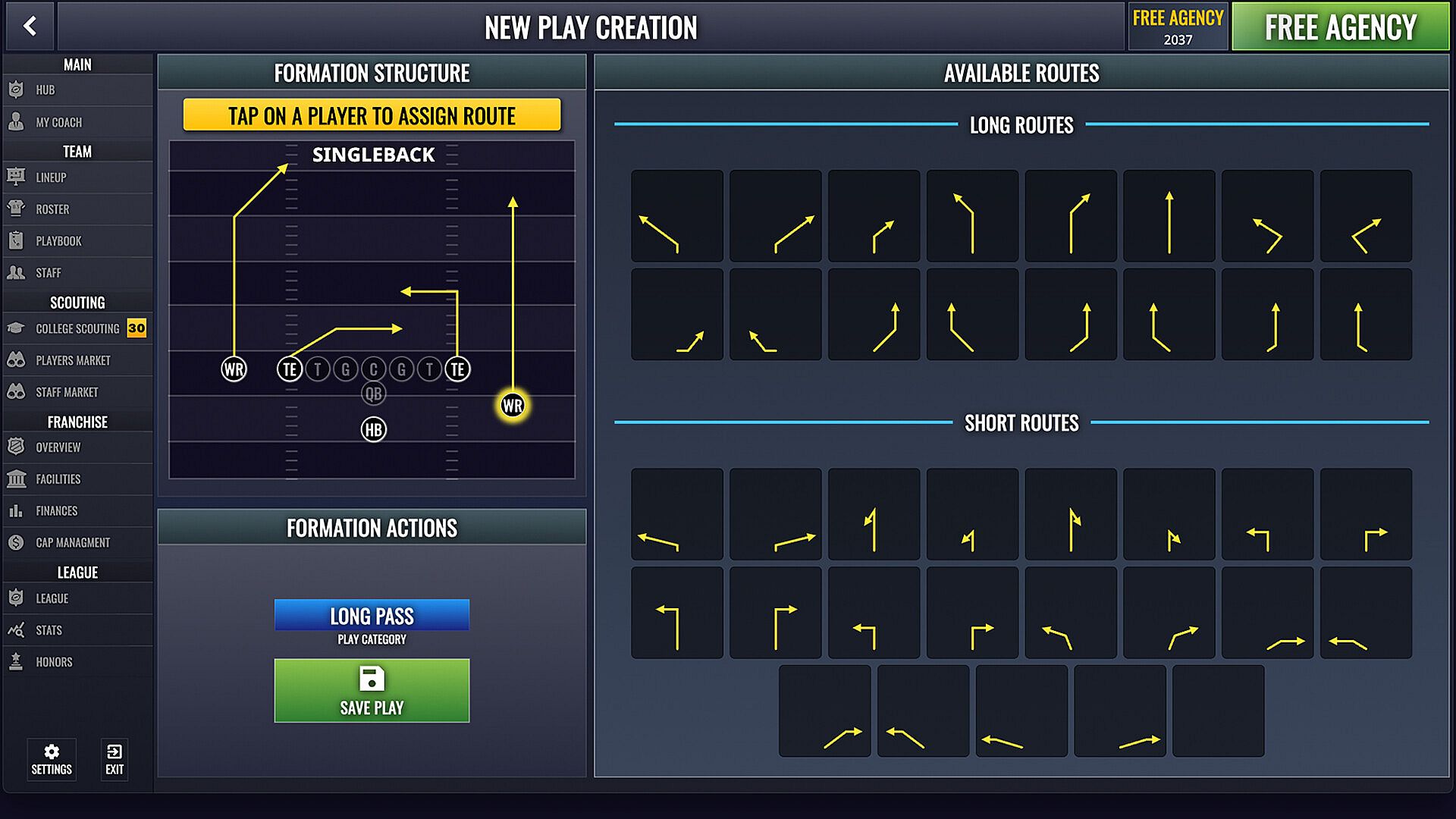 Custom Play Creator: Design your own plays from scratch — assign routes, player roles, and timing with intuitive playbook tools.