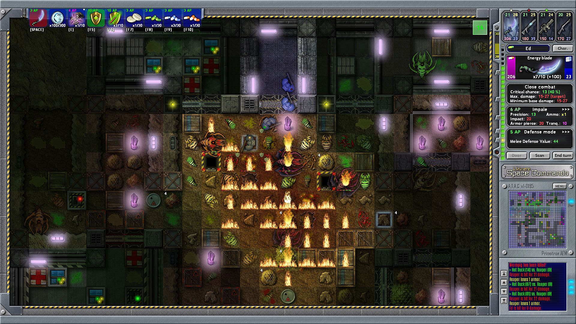 Ultimate Space Commando (USC) is a turn-based sci-fi tactics game with strategy and role-playing elements, inspired by many "old-school" top-down view classics, featuring a semi-randomized Campaign mode with real multiple ending possibilities, fully interactive random maps, a detailed combat system with 18 distinct weapons and in-depth mechanics, a lot of unique gadgets, customizable squads with craftable goodies and lootable weapon prototypes, TCP/IP-based and hot-seat multiplayer modes, and an alien horde not stopped even by walls to fulfill its terrifying agenda...