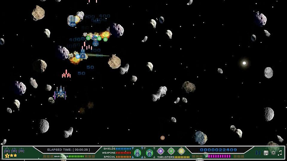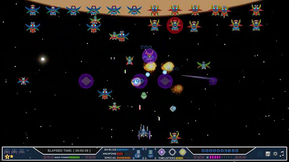 An unknown alien race regroups near Mars after failing to overrun Earth Station Alpha. Sensors detect multiple enemy fleets entering the system, overwhelming the station's defenses. Pilots take command to repel these waves, locate enemy ship production sites, and strike decisively to secure humanity's survival. Players navigate 22 levels across three acts, each with six stages plus boss fights, and a final showdown. Face 14 unique foes including asteroids, armed variants, weapon platforms, fighters, rifters, and bosses in asteroid and platform levels that support horizontal and vertical flight. Collect bonus items like special weapons, passive tech upgrades, and powerups that boost shot accuracy for multipliers. This indie action adventure suits fans of intense space combat and structured progression.