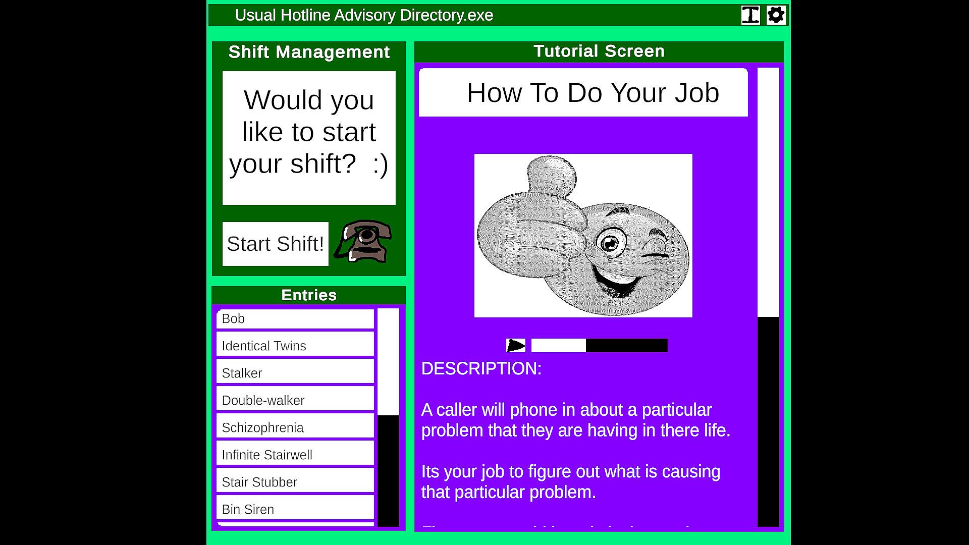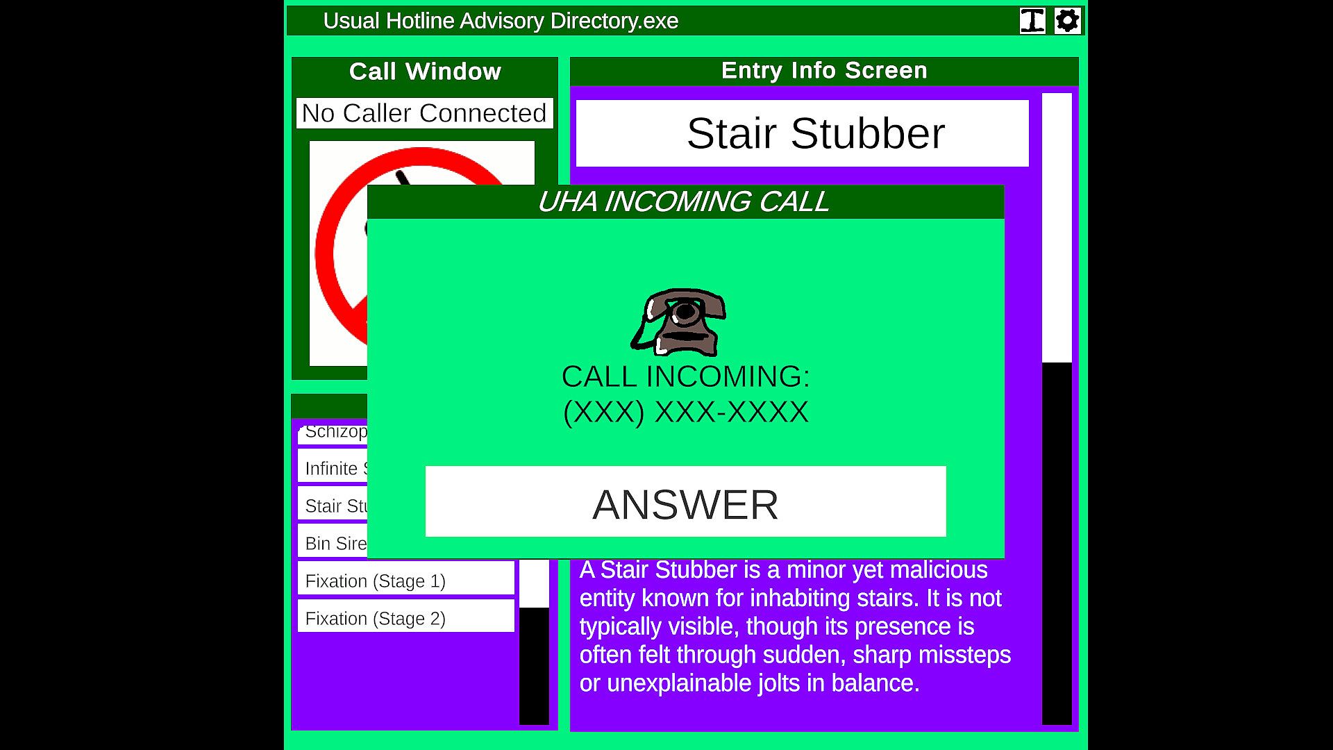 Un-Usual Hotline is an analog horror-inspired telephone operator simulator where you field calls from concerned callers, helping them identify entities and send helpful information. Dive into an extensive catalogue of information and strive to become a trusted expert in usual protection. Your advice could be the difference between life and death.