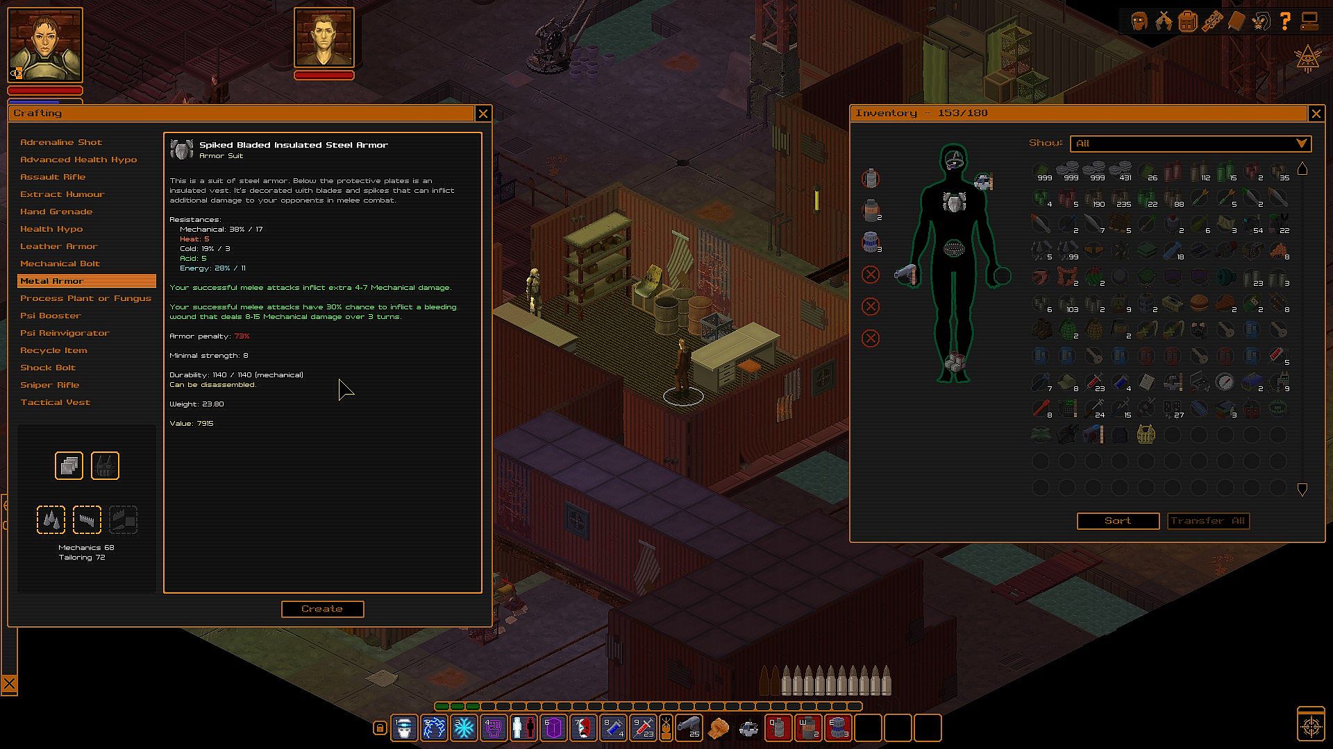 Underrail features an elaborate item crafting system. A vast majority of the armor, weapons and some other items encountered in the game can be crafted, and some are exclusively acquired through it. Crafted equipment tends to be superior to that which is scavenged or purchased in terms of raw numbers, provided you are investing in your crafting skills.