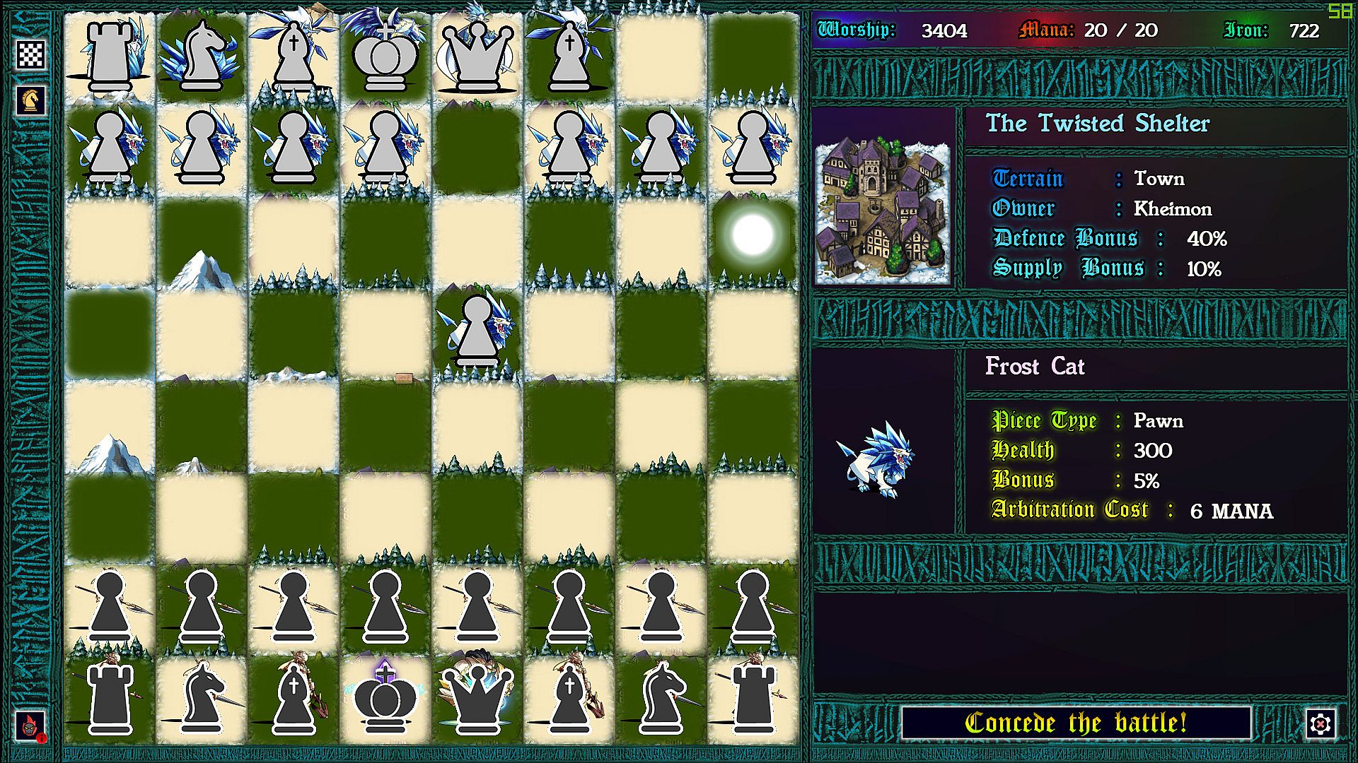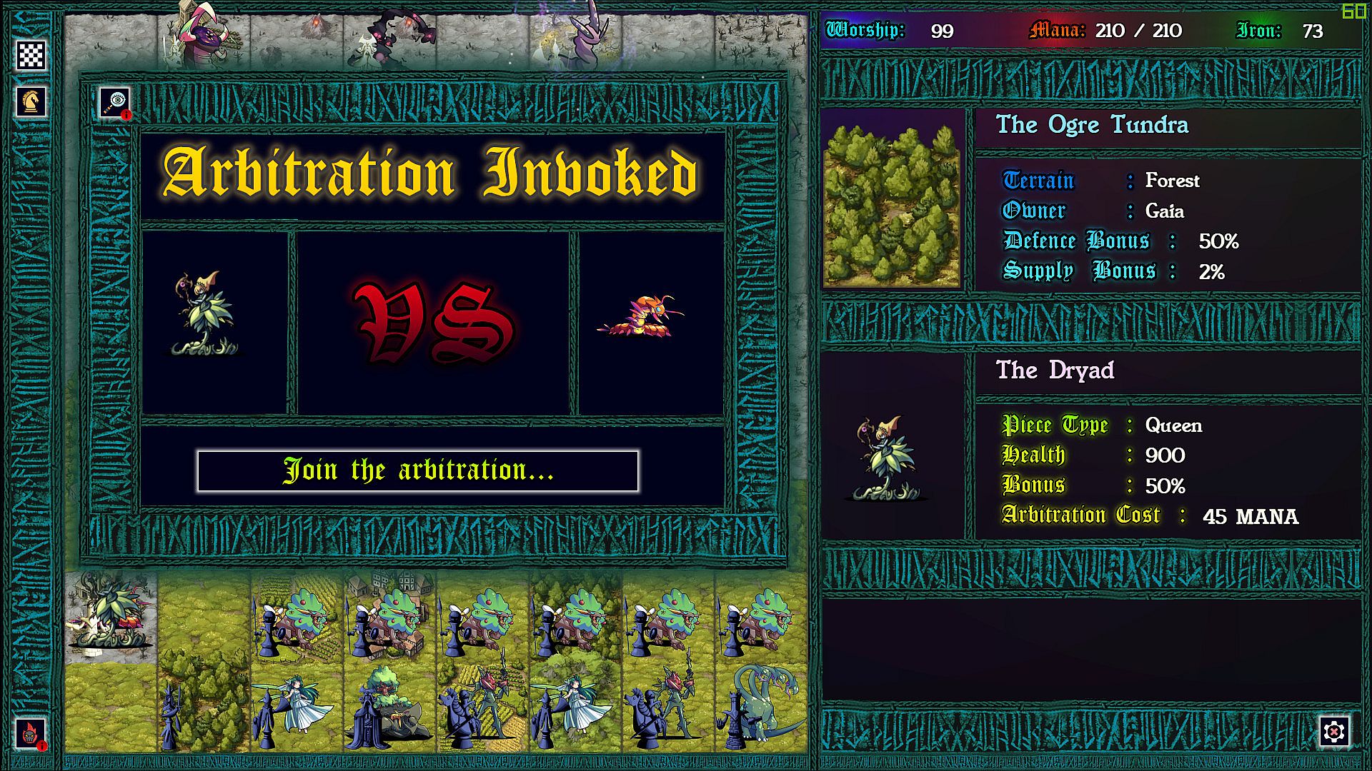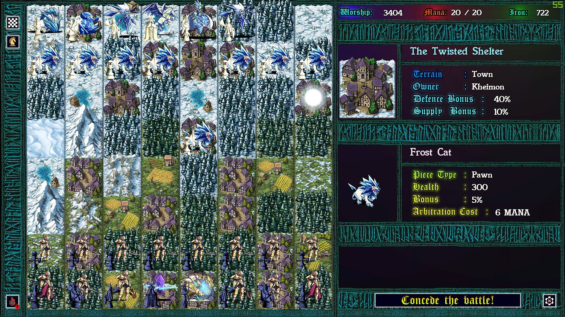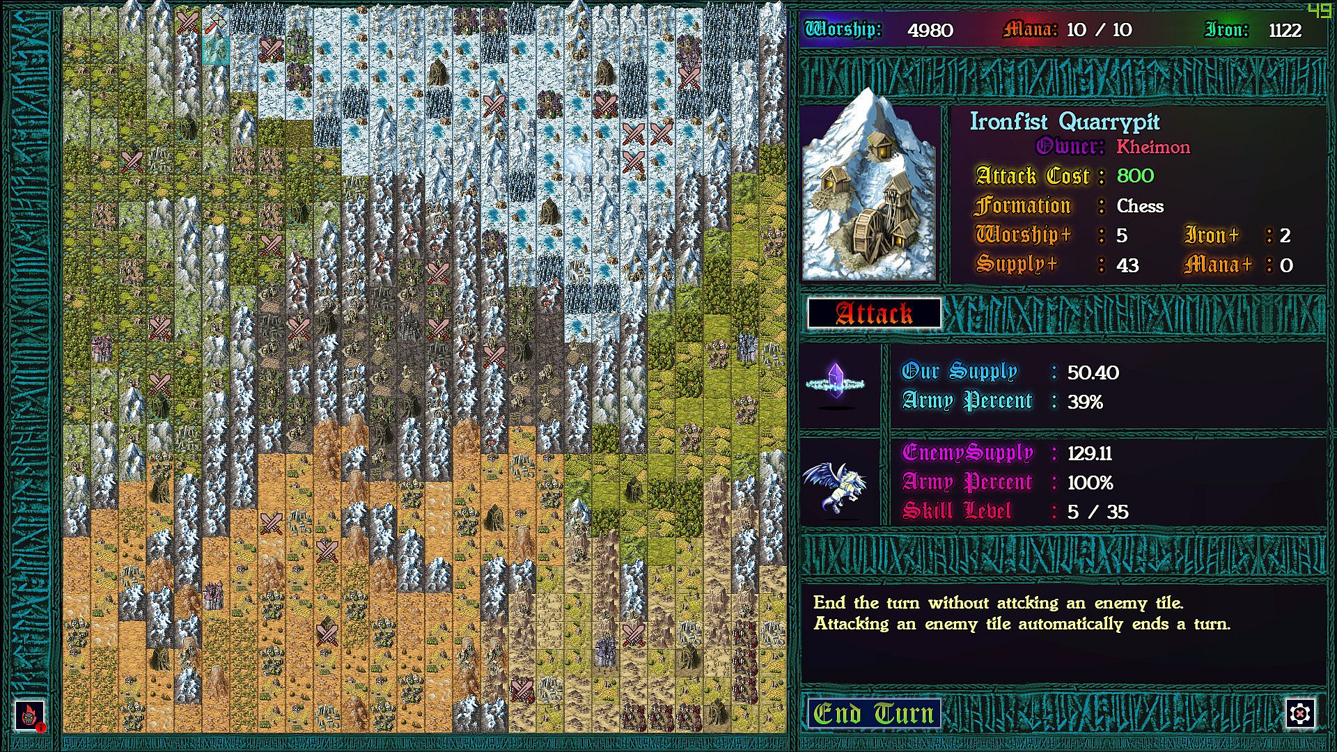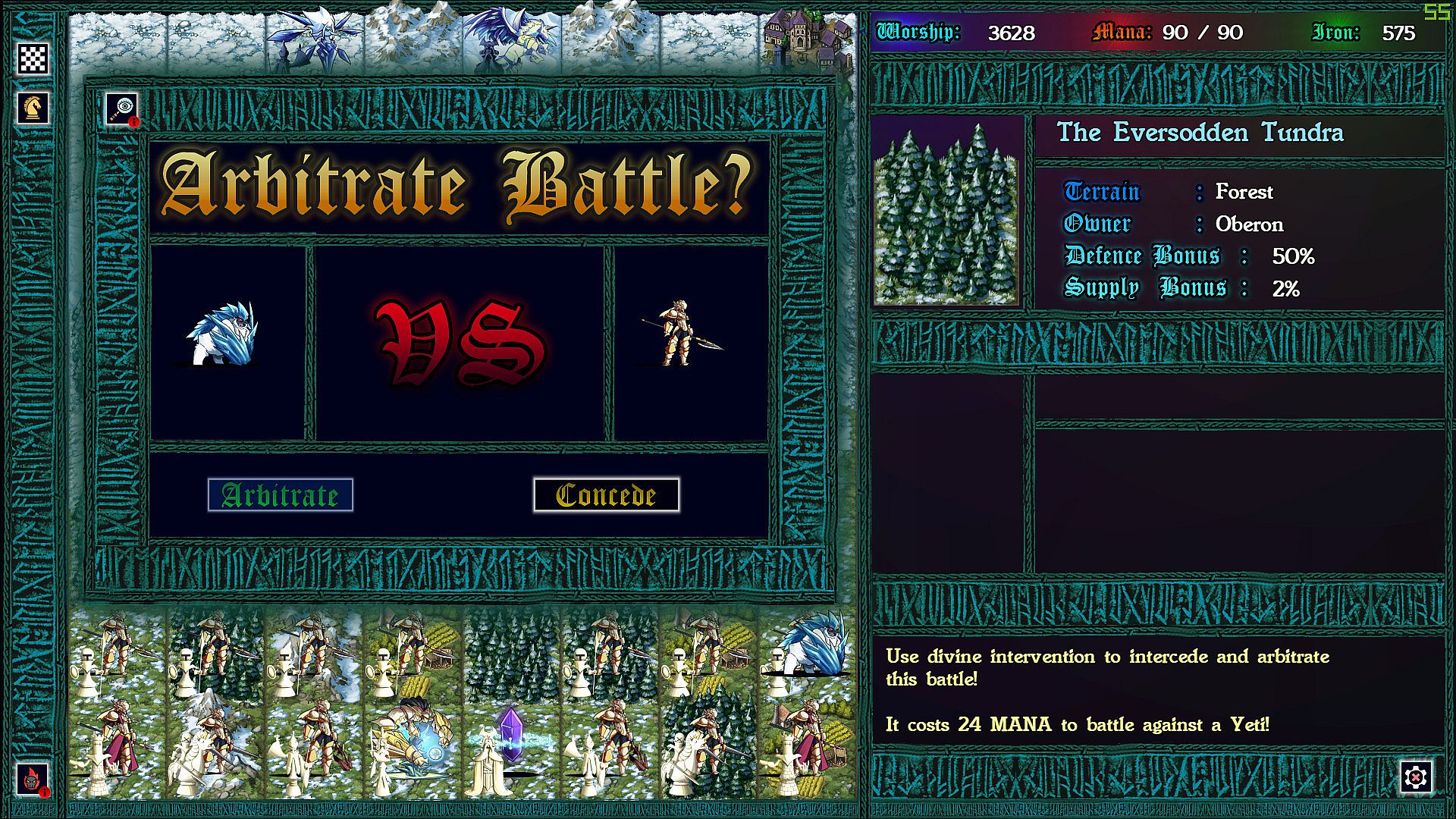 Each province taken requires a chess battle, but as you’ve never played before. Supply lines determine the size of your army so that battles can be vastly uneven. More dramatic still: each time pieces collide on the board, the defending god can intercede with an arbitration, causing an rpg style battle to ensue. In these battles strategic resources can be used to devastating effect, and with enough mana, iron, and worship, a pawn might even turn back a queen!