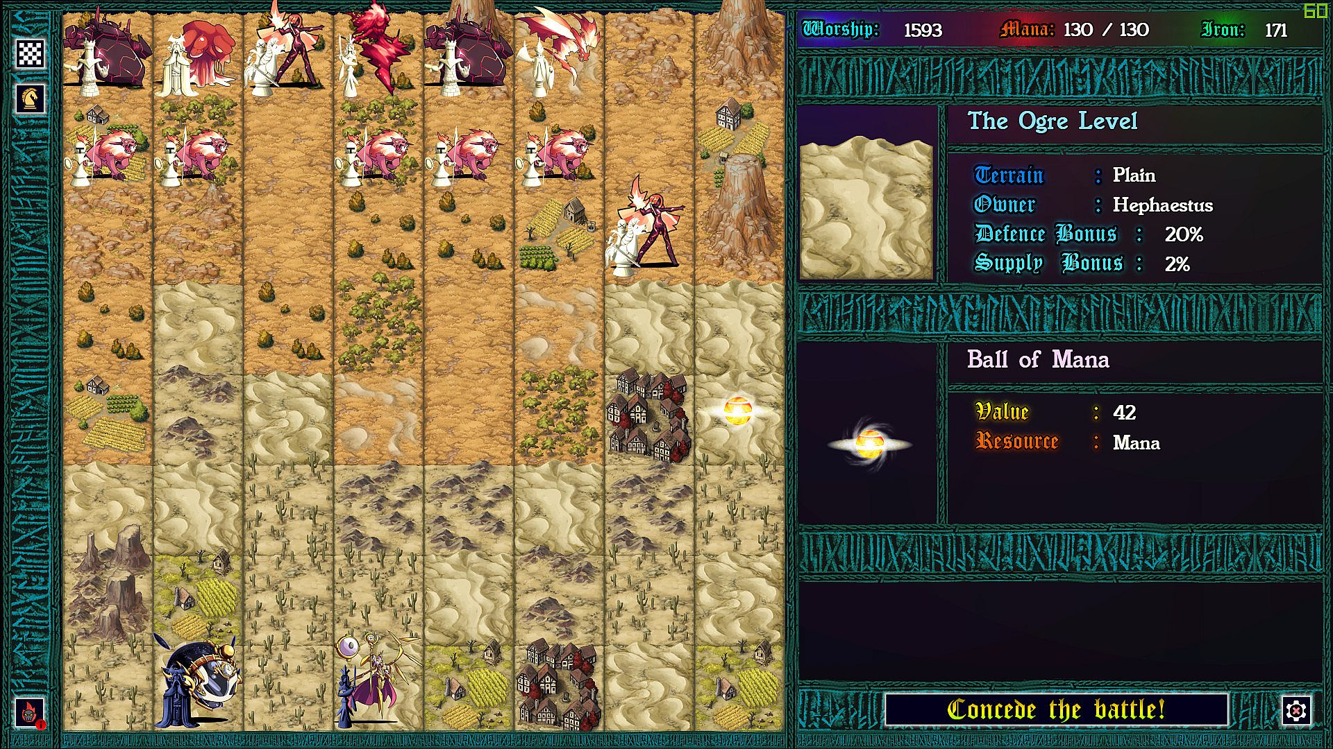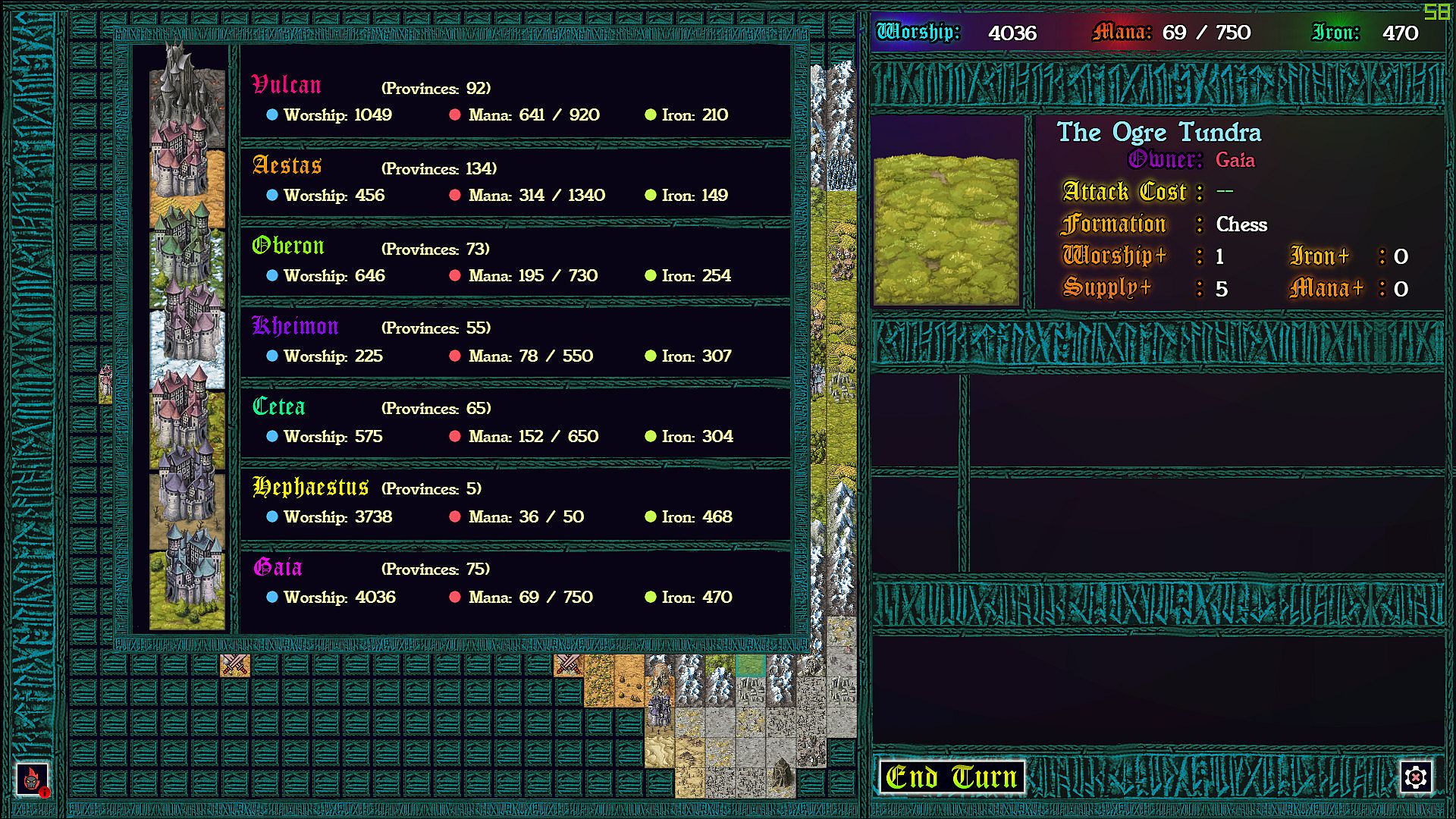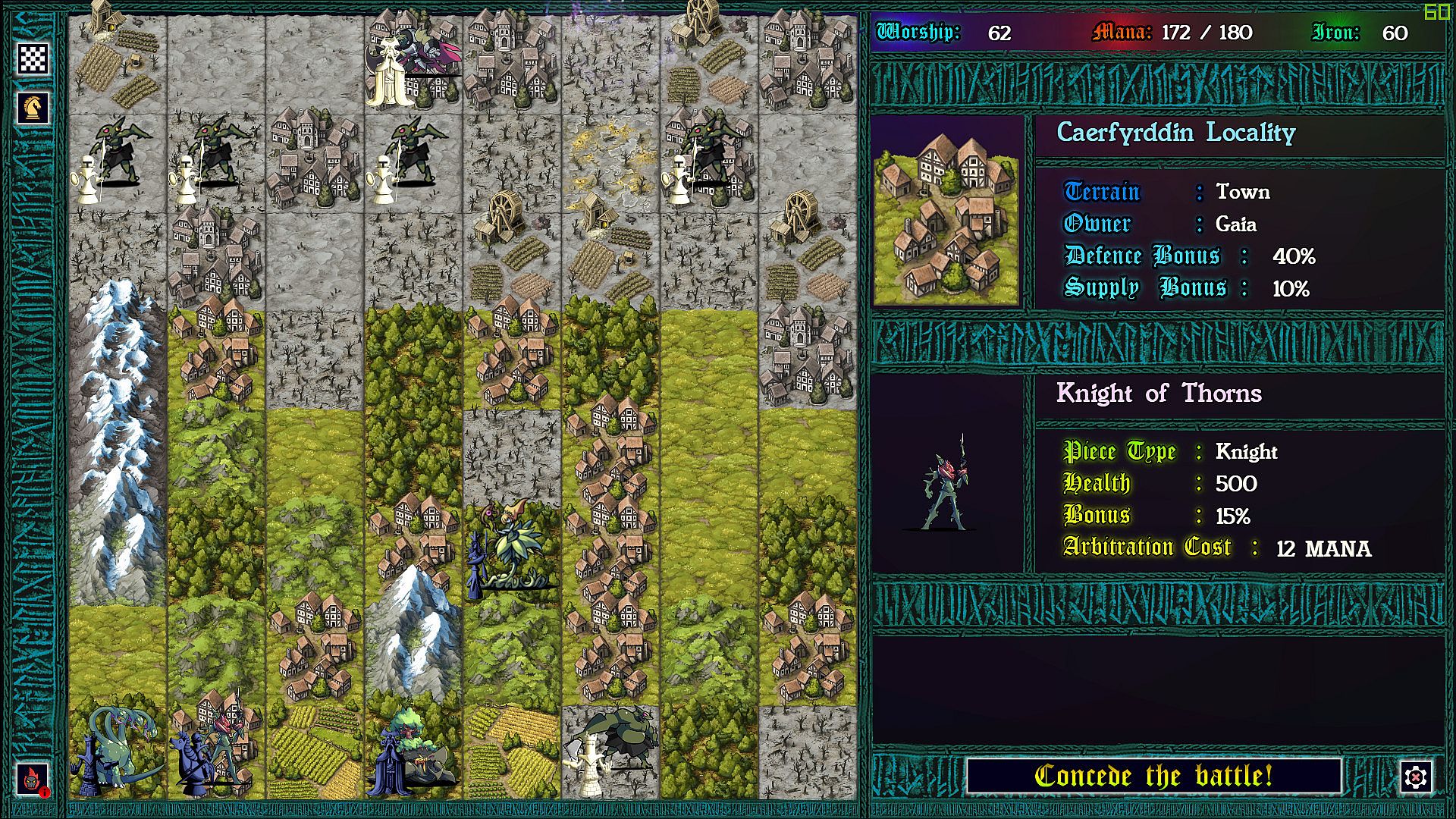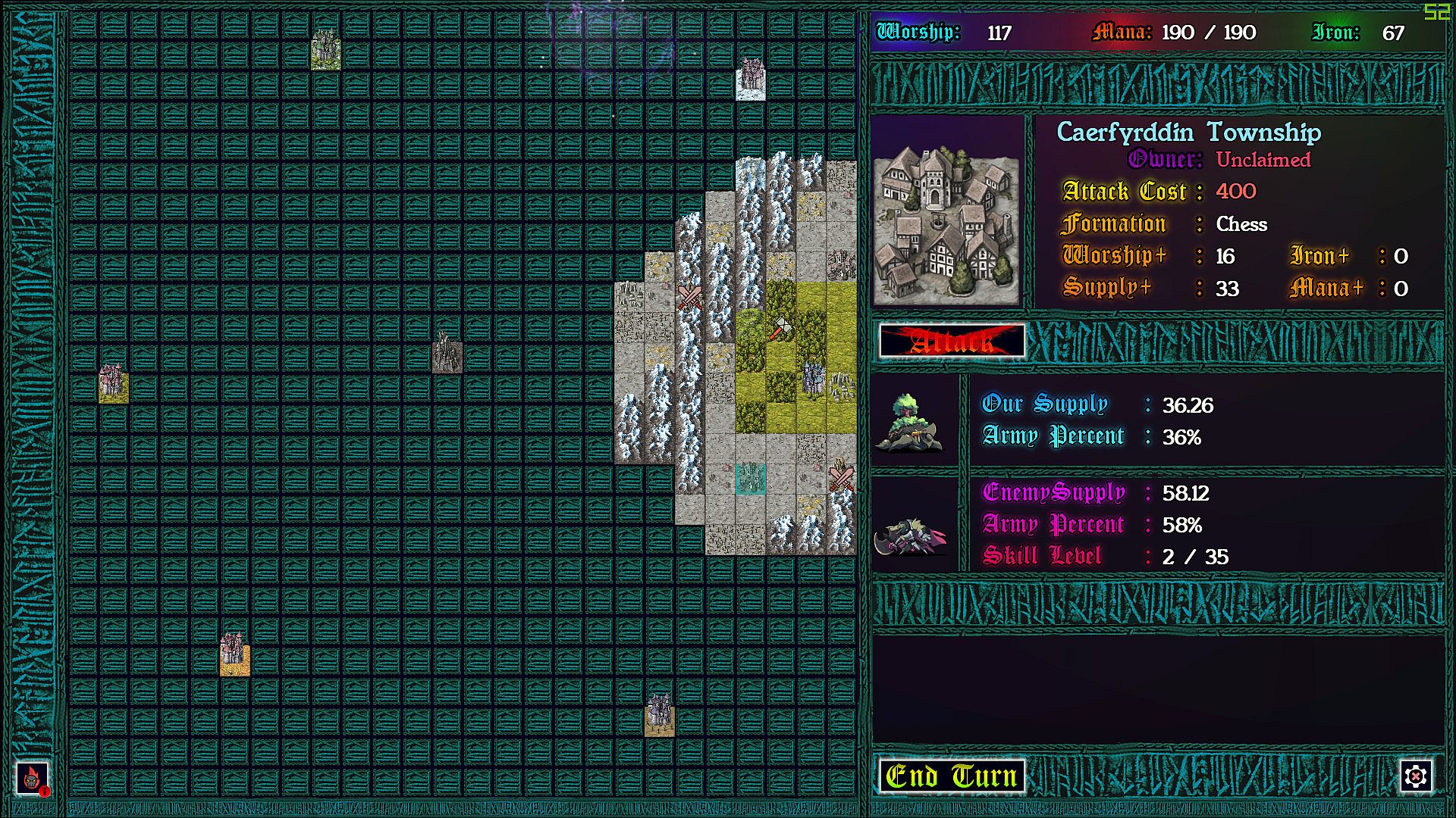 Each province taken requires a chess battle, but as you’ve never played before. Supply lines determine the size of your army so that battles can be vastly uneven. More dramatic still: each time pieces collide on the board, the defending god can intercede with an arbitration, causing an rpg style battle to ensue. In these battles strategic resources can be used to devastating effect, and with enough mana, iron, and worship, a pawn might even turn back a queen!