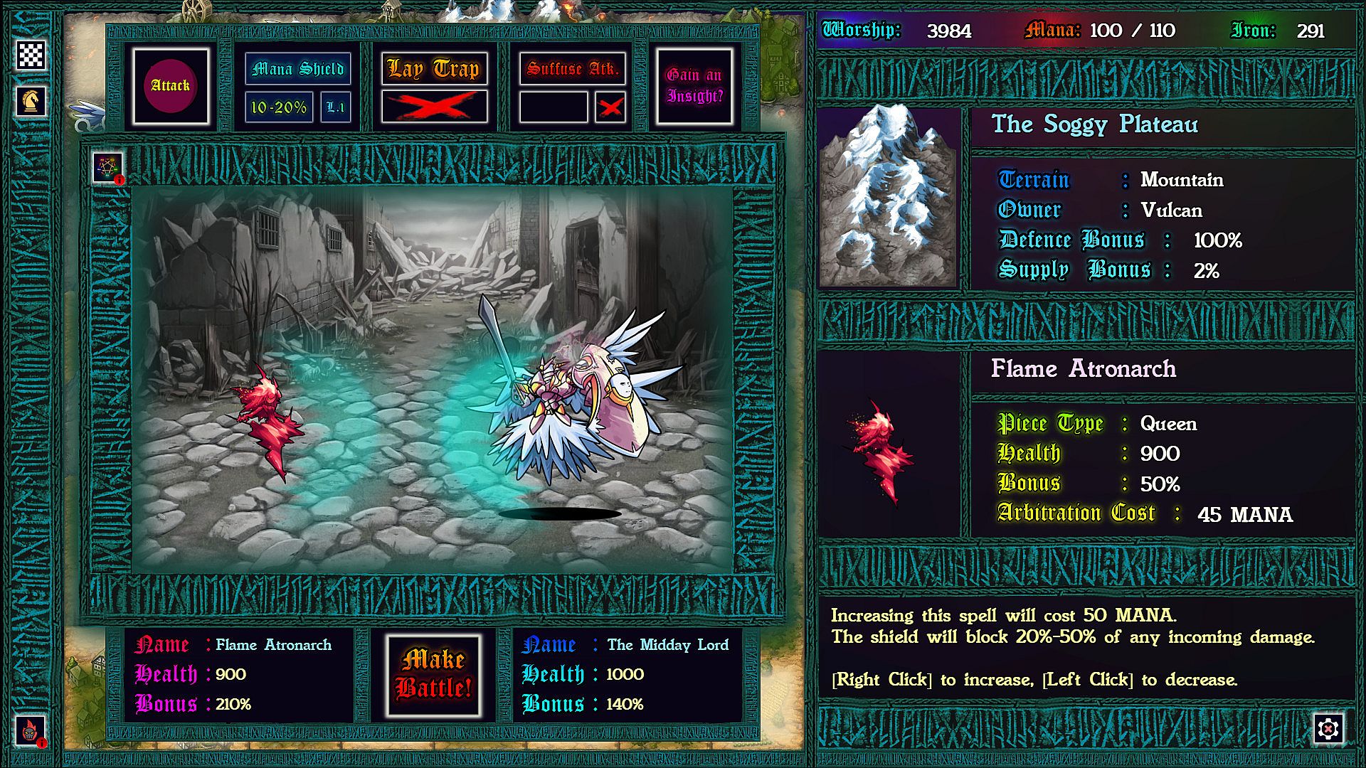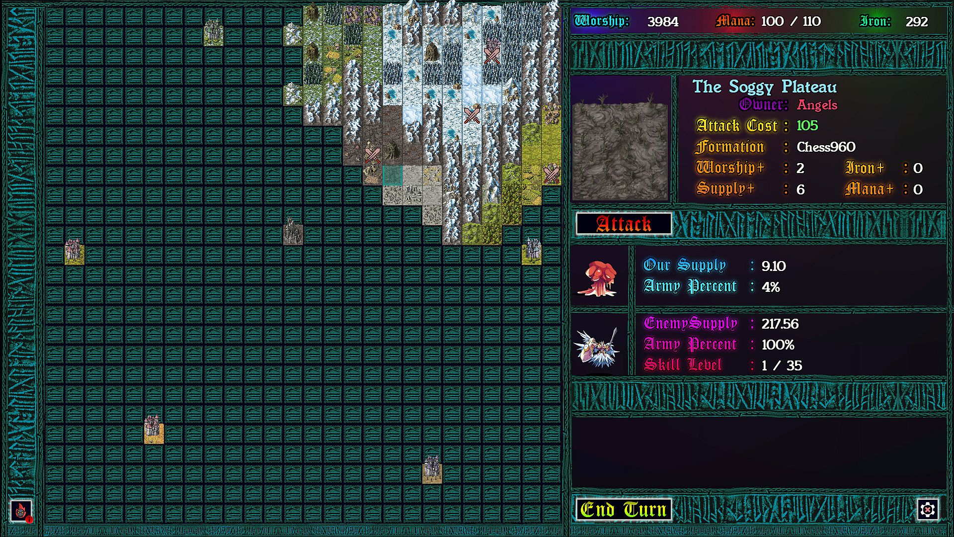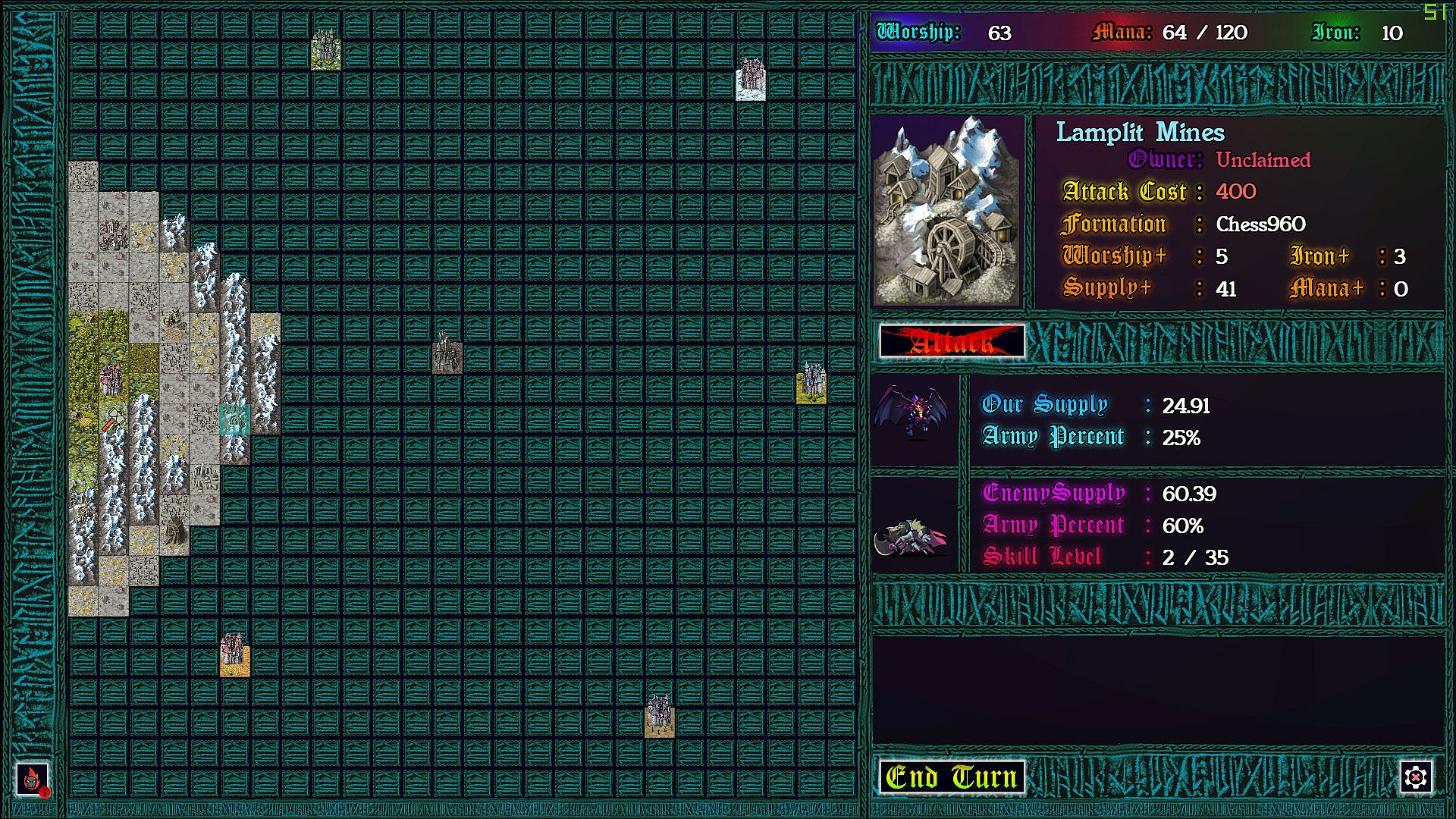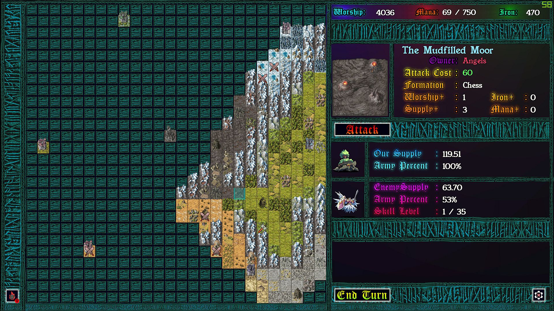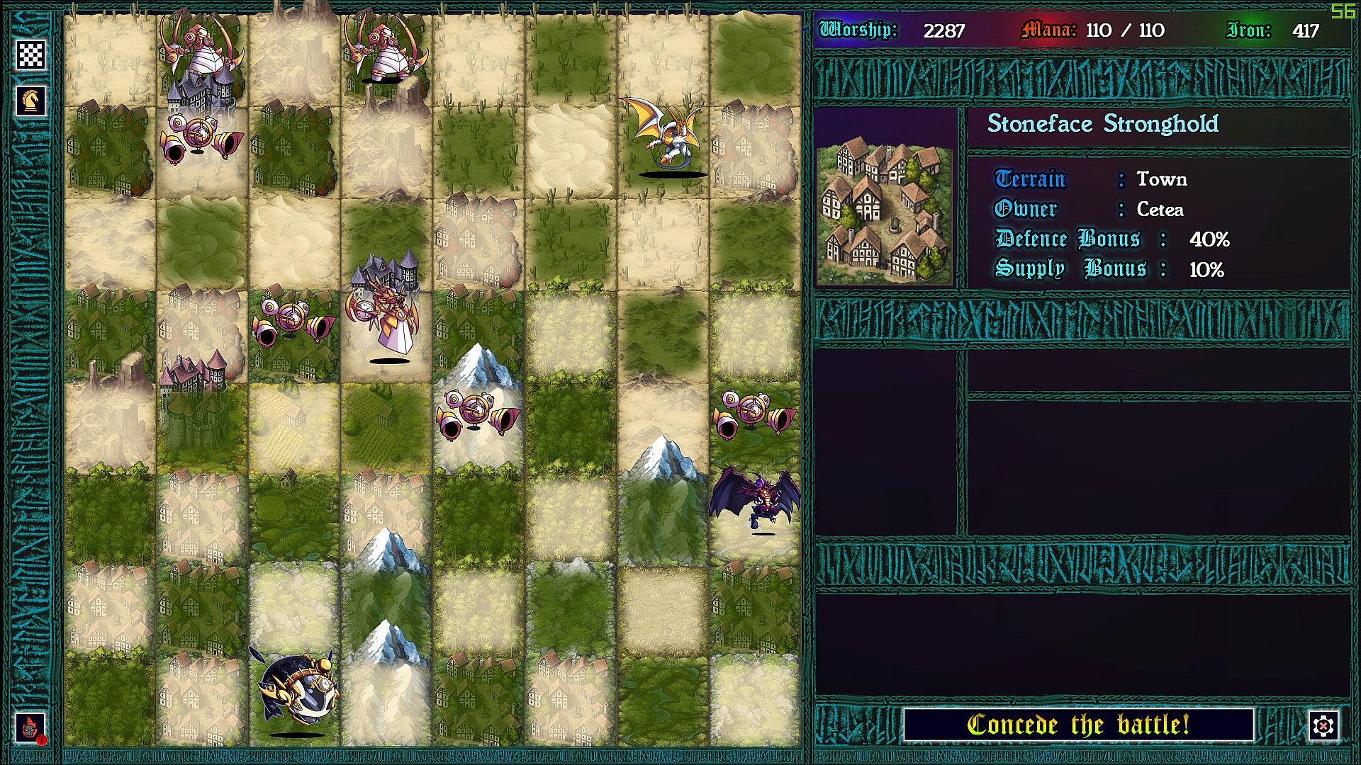 Each province taken requires a chess battle, but as you’ve never played before. Supply lines determine the size of your army so that battles can be vastly uneven. More dramatic still: each time pieces collide on the board, the defending god can intercede with an arbitration, causing an rpg style battle to ensue. In these battles strategic resources can be used to devastating effect, and with enough mana, iron, and worship, a pawn might even turn back a queen!