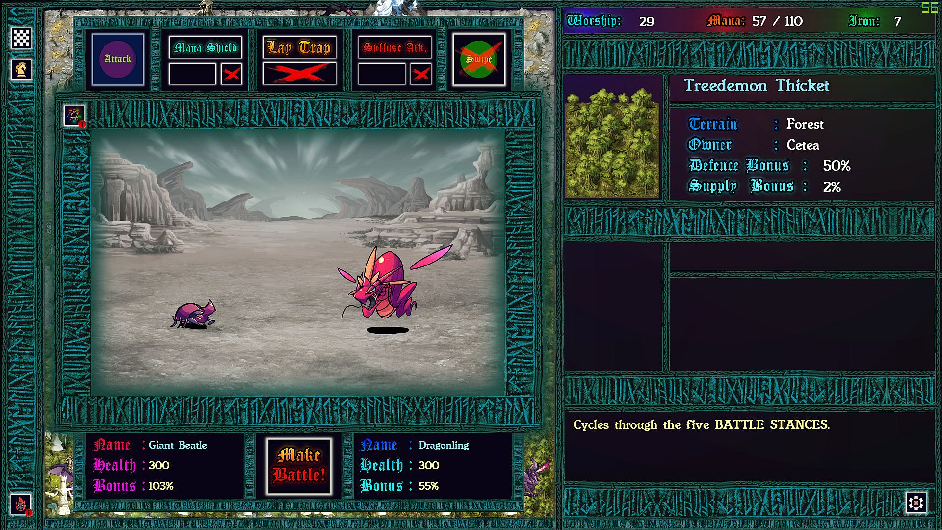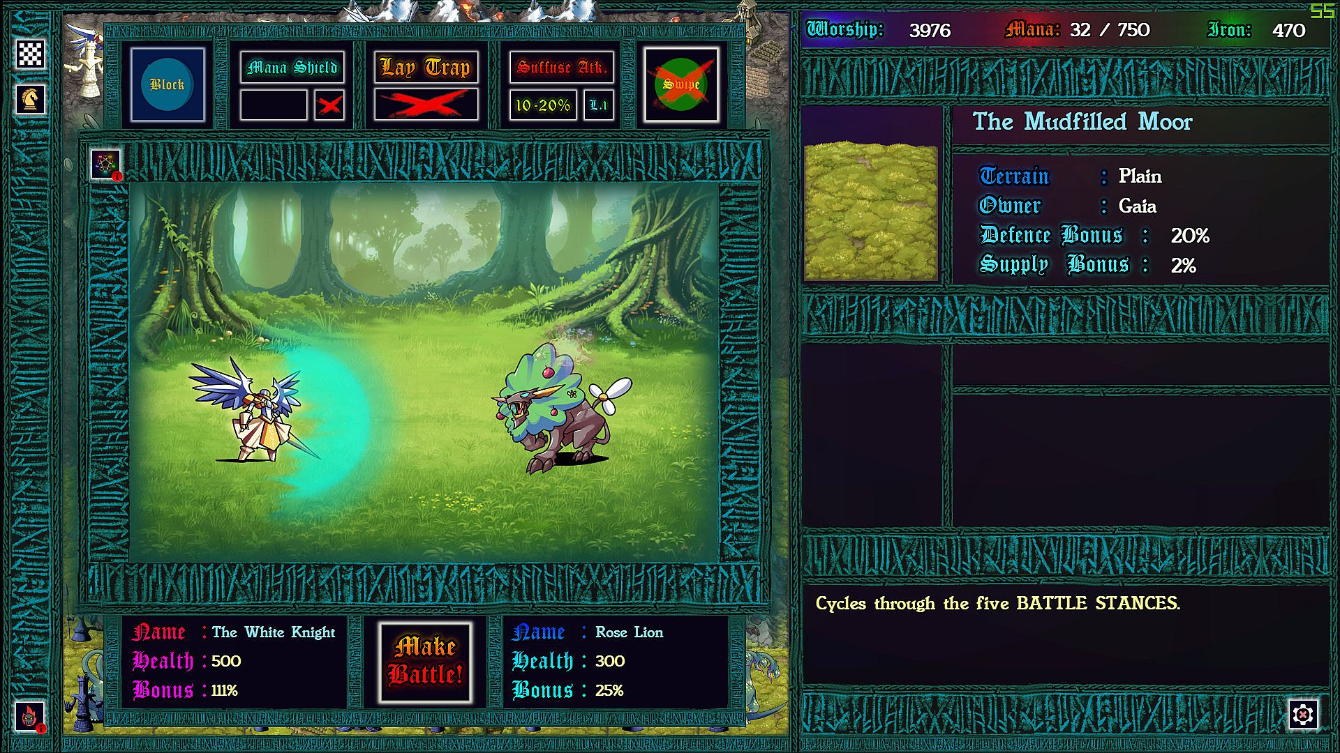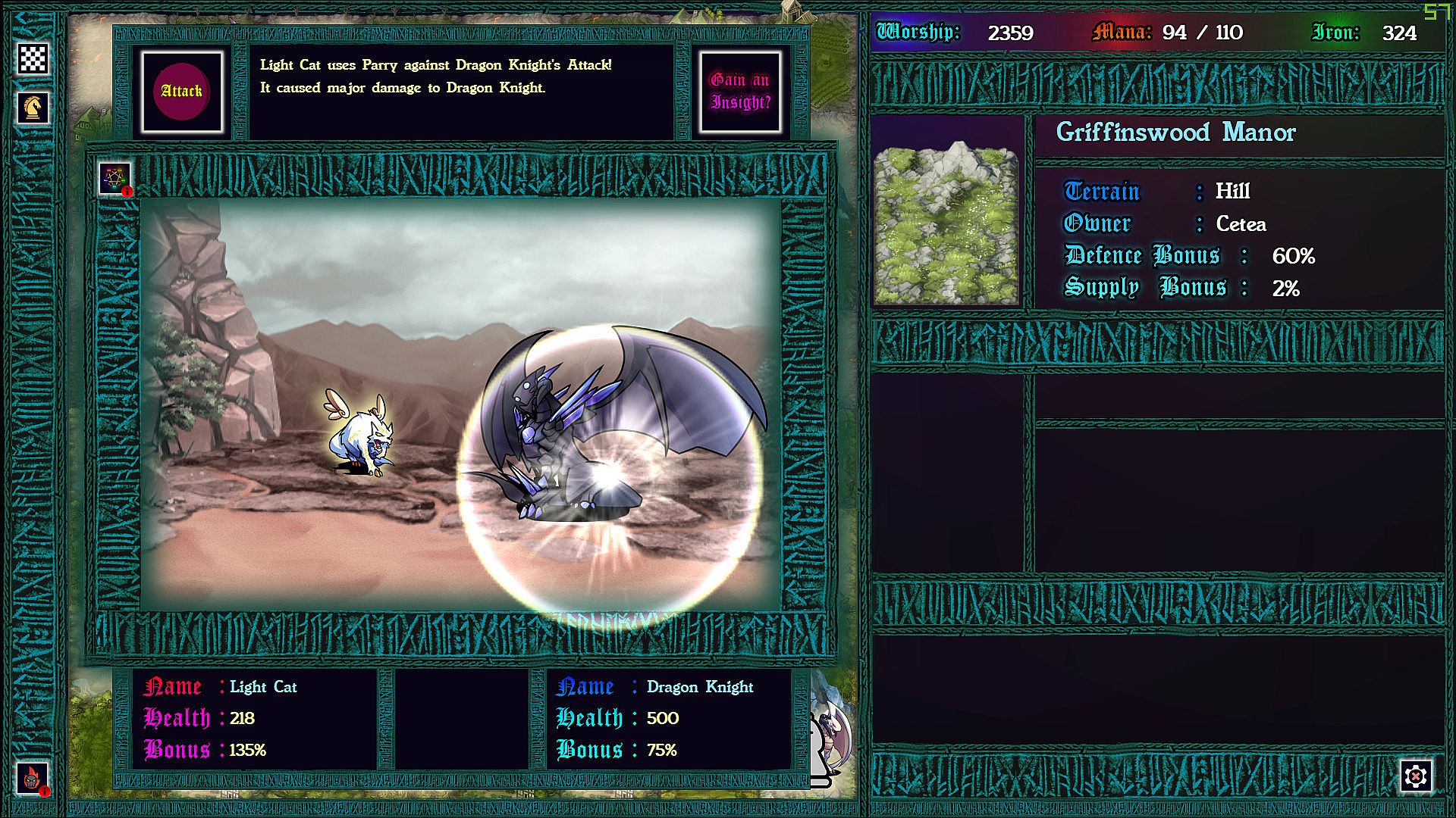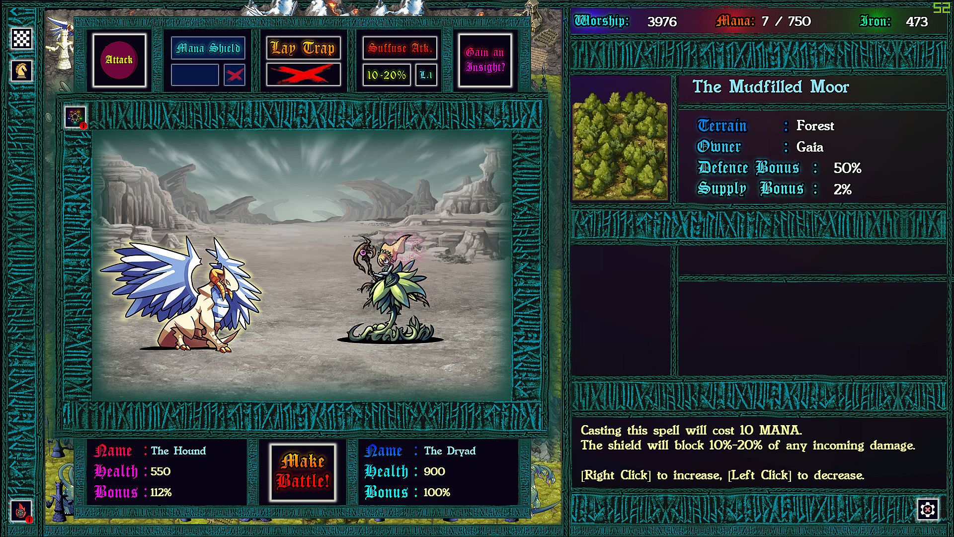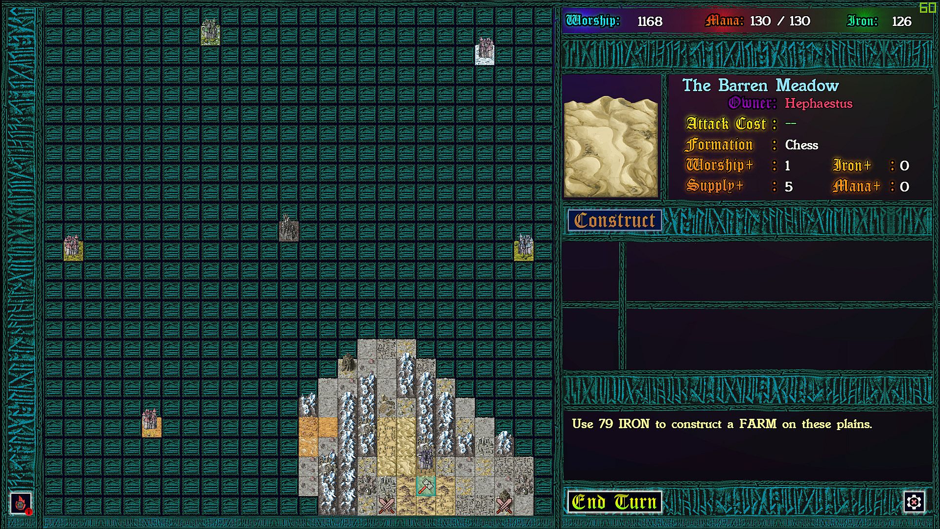 Each province taken requires a chess battle, but as you’ve never played before. Supply lines determine the size of your army so that battles can be vastly uneven. More dramatic still: each time pieces collide on the board, the defending god can intercede with an arbitration, causing an rpg style battle to ensue. In these battles strategic resources can be used to devastating effect, and with enough mana, iron, and worship, a pawn might even turn back a queen!