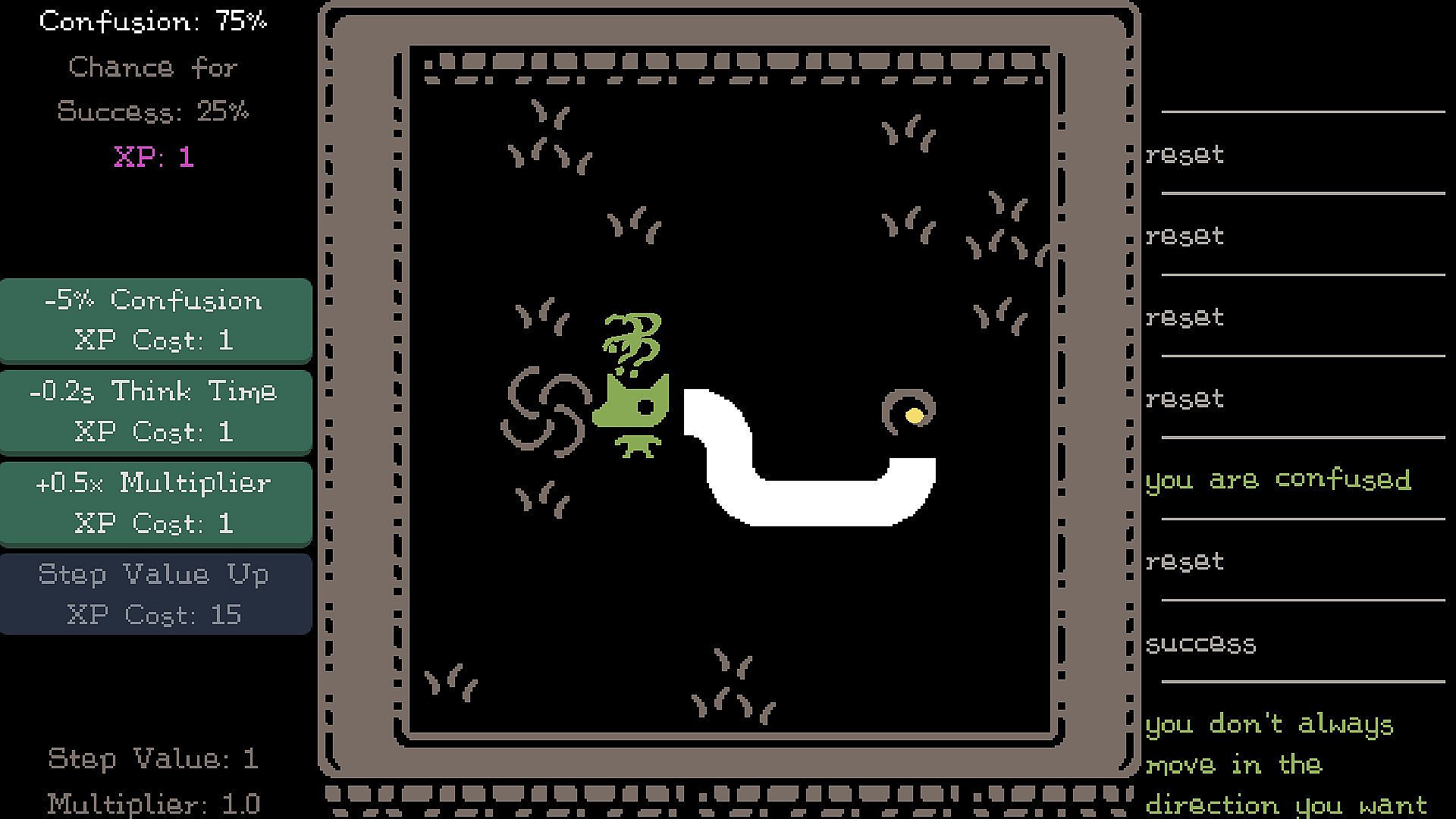 A cruel and simple movement clicker game. Starting with a 1-in-4 chance to move as planned, can you collect the Coin of Rehtaeh and escape in 10 steps? Rage, upgrade, persevere, and discover multiple endings. A child cried in frustration during playtesting.