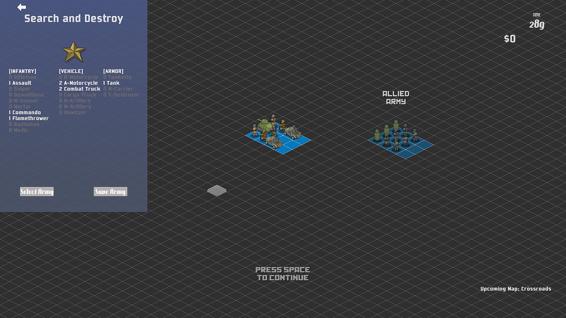 Construct your own armies to use in battle. Save up to six armies at a time to the steam cloud allowing you to access them from any computer or build your own armies on the fly with near limitless combinations possible.