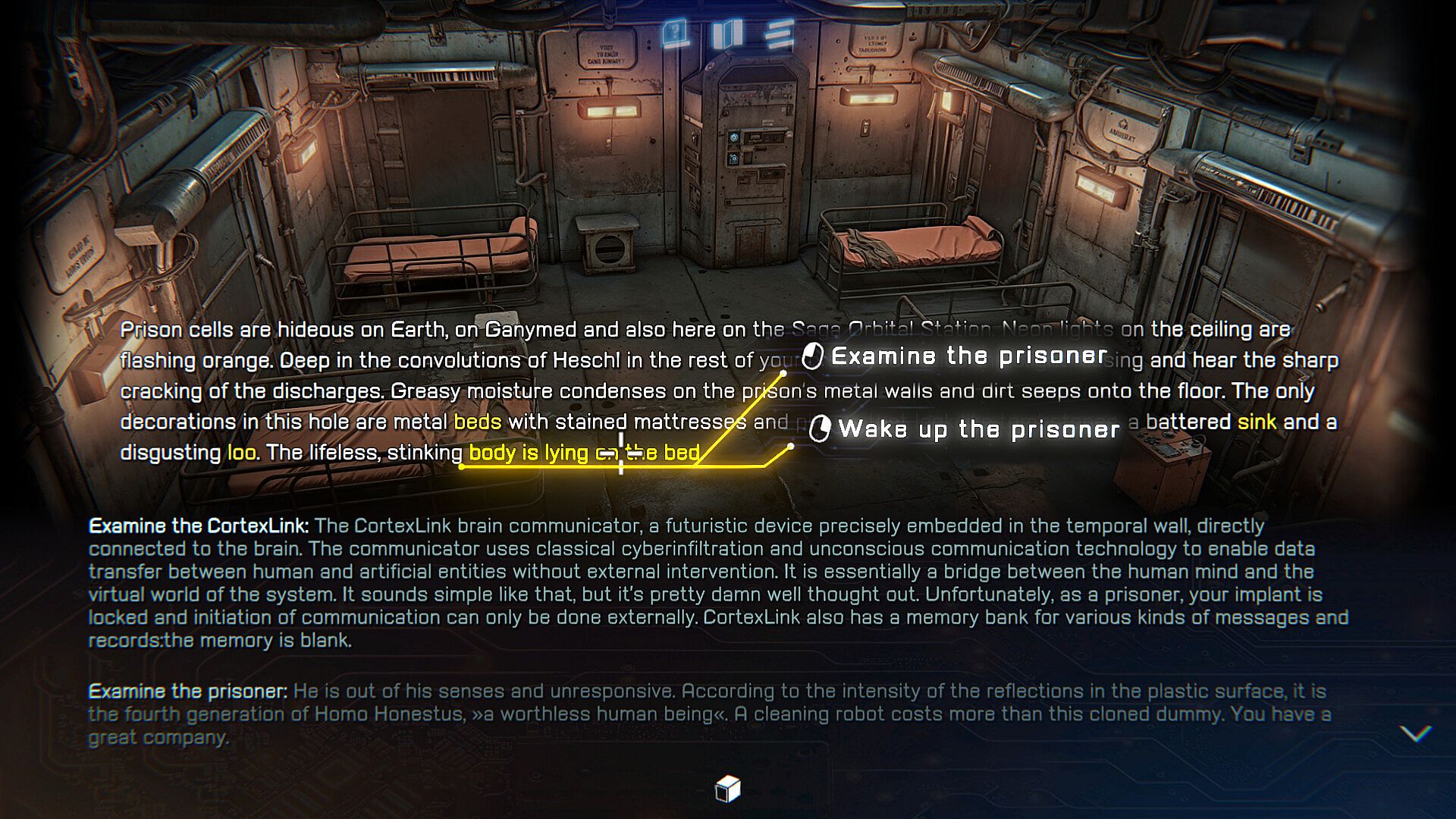 Simply click on the interactive link in the text and you can explore the environment, use and collect items and store them in your inventory. Dialogues are also an important part of the game, giving you important (and unimportant) information you need to complete the game.