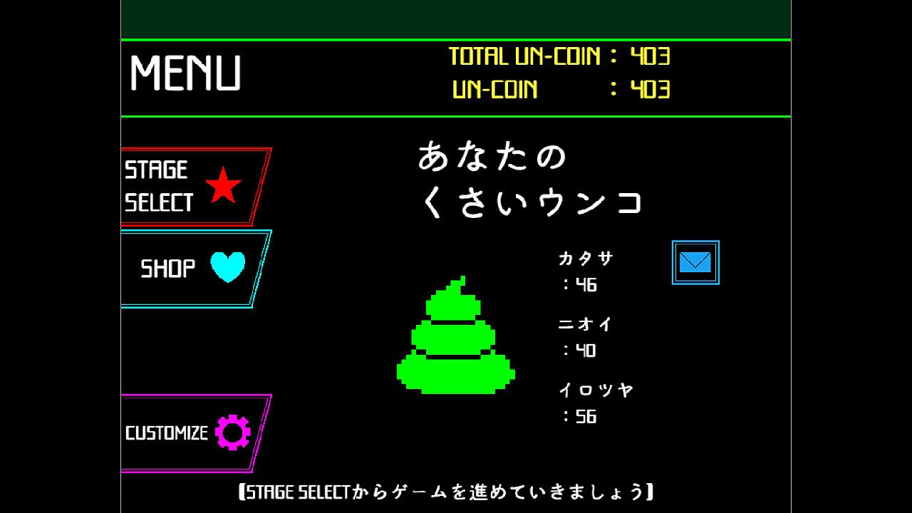 Spend the UN-COINs you collect in stages to spin a Gacha for customization items for your Unko, or to unlock even more challenging bonus stages.
