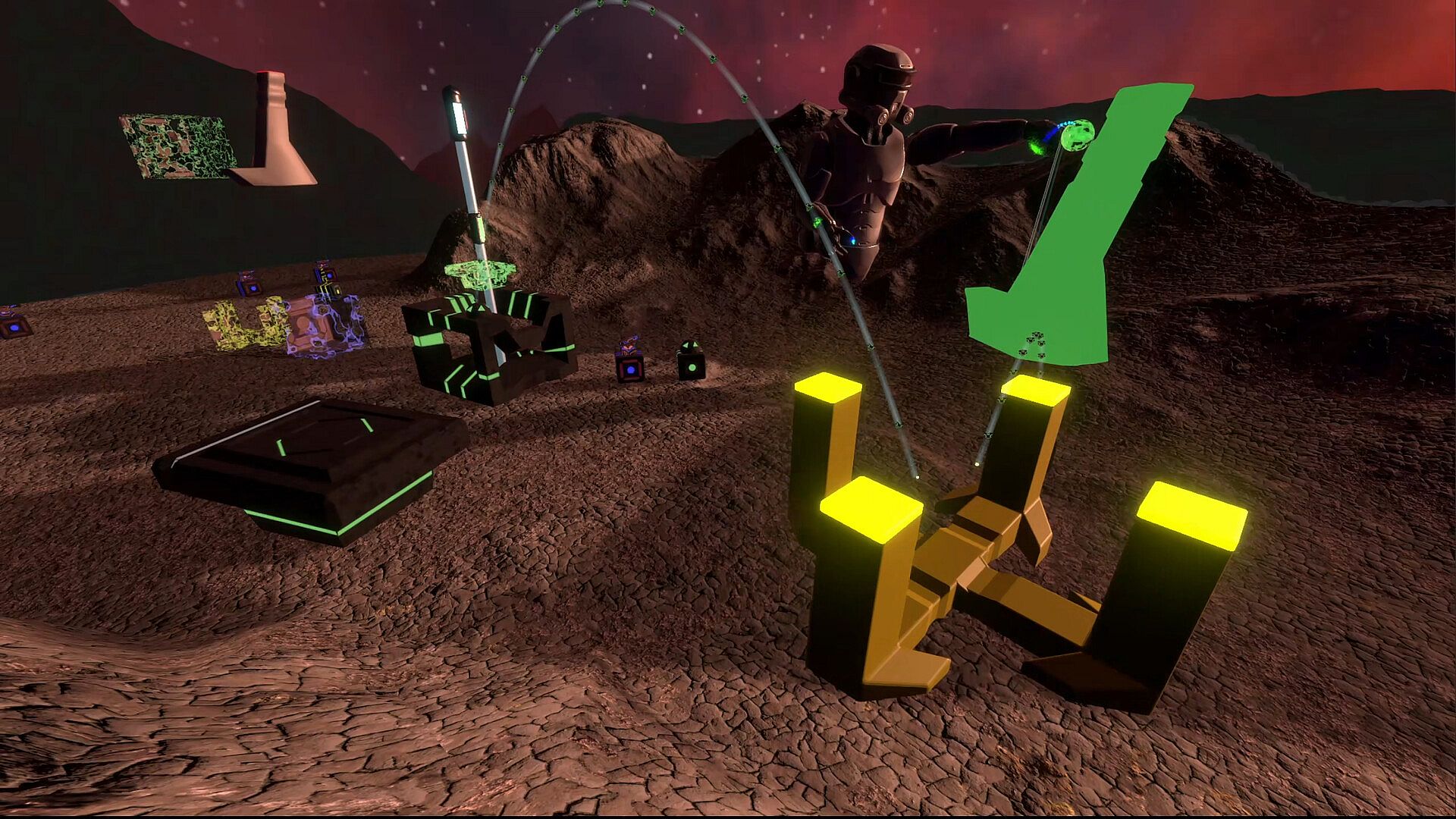 Your hands will be very powerful, but you can only use two of them. Making them the most valuable resource in your arsenal. Physically grab objects to interact with them. Throw your units to move them to the right area. Construct a unit by dragging its build icon onto the battlefield from a factory. You can also use your hands to scale, rotate and move yourself. In extreme cases you can also pickup light enemy units and move them out of range.