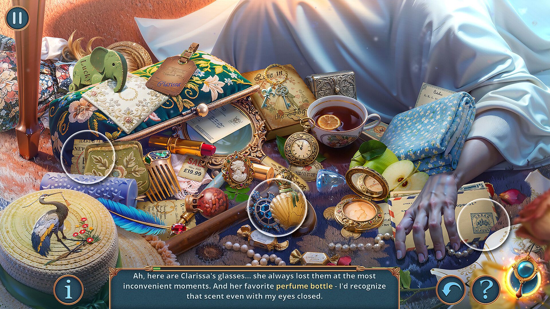 Explore atmospheric hidden-object scenes set in cottages, gardens, teahouses, greenhouses, and shadowy English lanes.