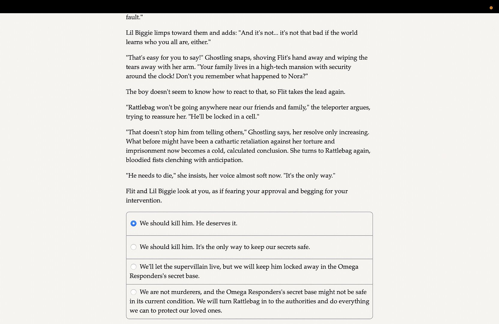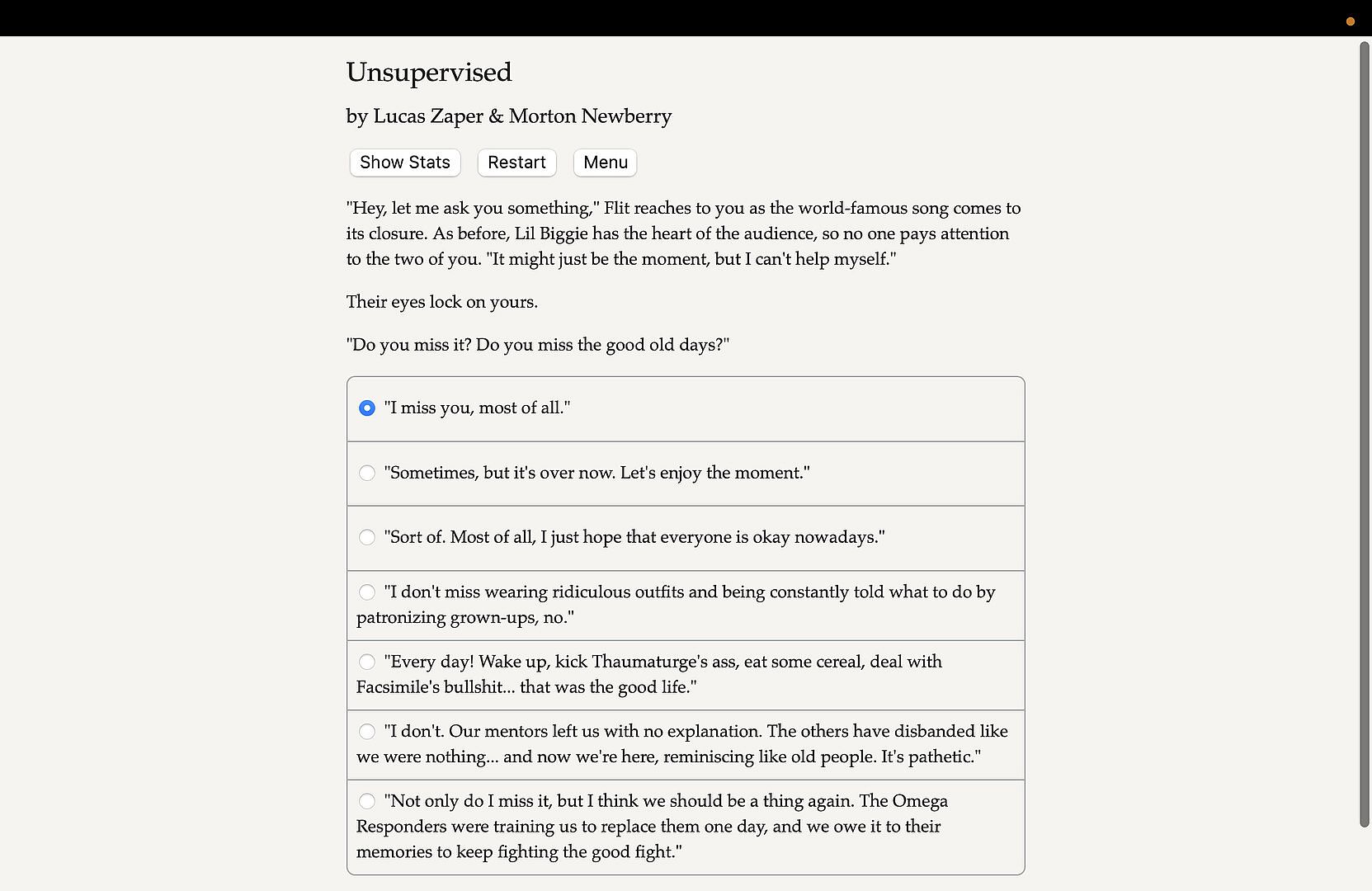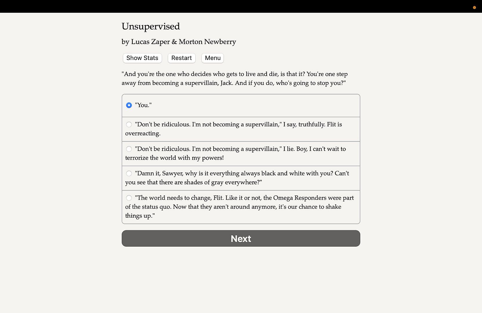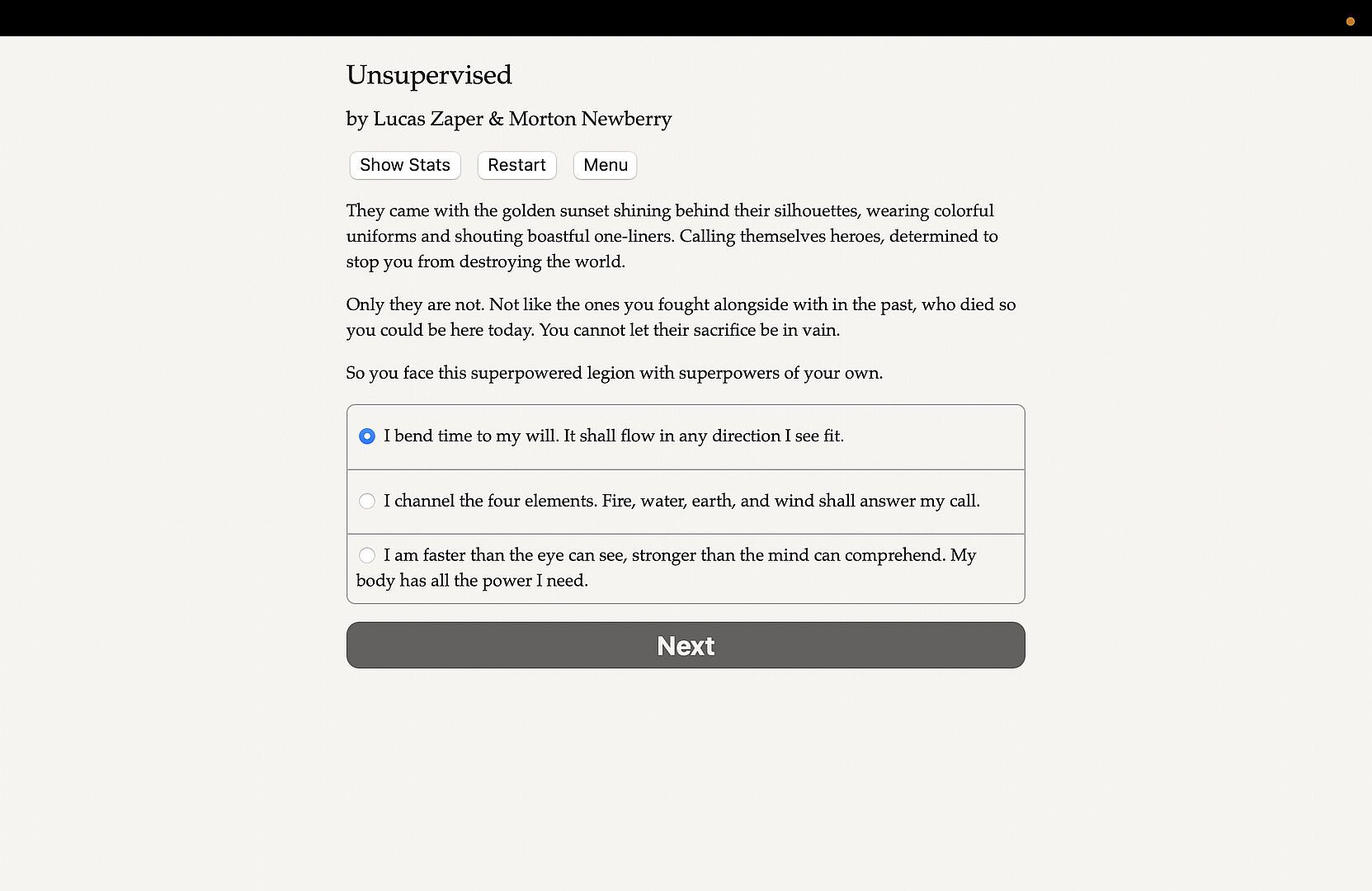 Unsupervised is a 660,000-word interactive superpower novel by Lucas Zaper and Morton Newberry, where your choices control the story. It’s entirely text-based—without graphics or sound effects—and fueled by the vast, unstoppable power of your imagination. Which is not as cool as an actual superpower, but you get the idea.