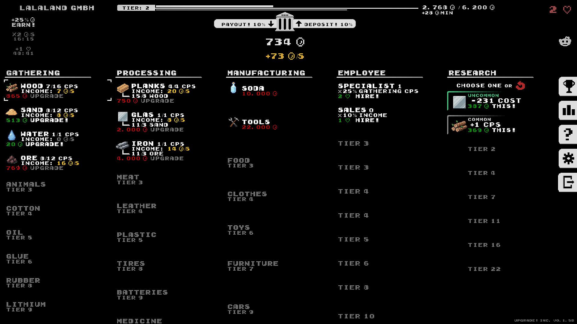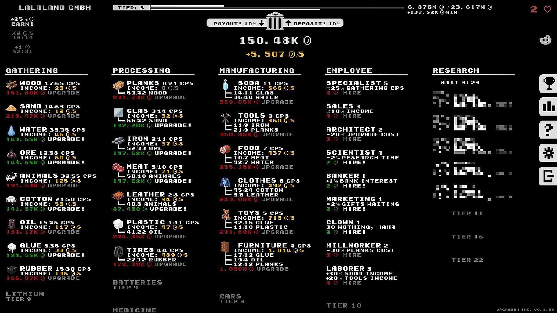 Build your company from a single operation into a profitable enterprise. Invest in production lines, upgrade your facilities, and hire employees for powerful bonuses. Dive deeper by unlocking powerful research projects of varying rarities to gain significant advantages and accelerate your growth.