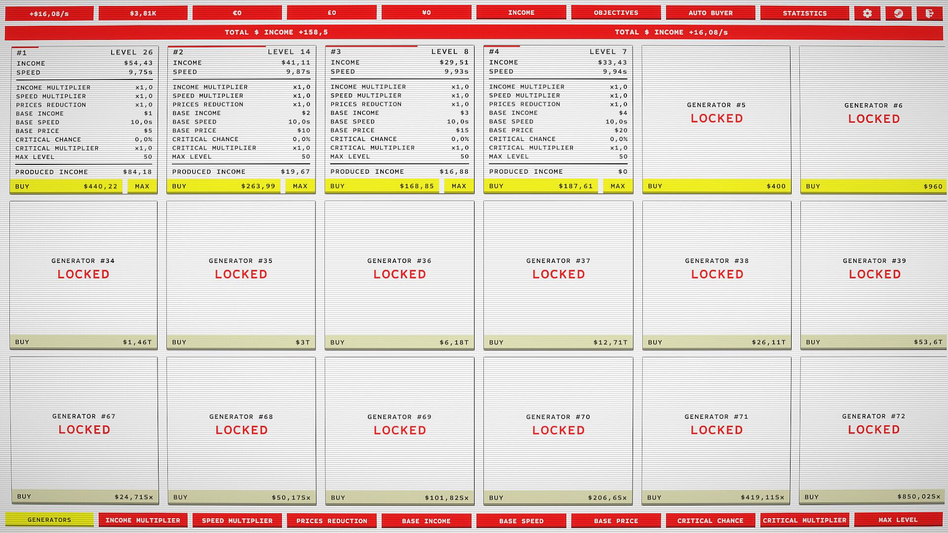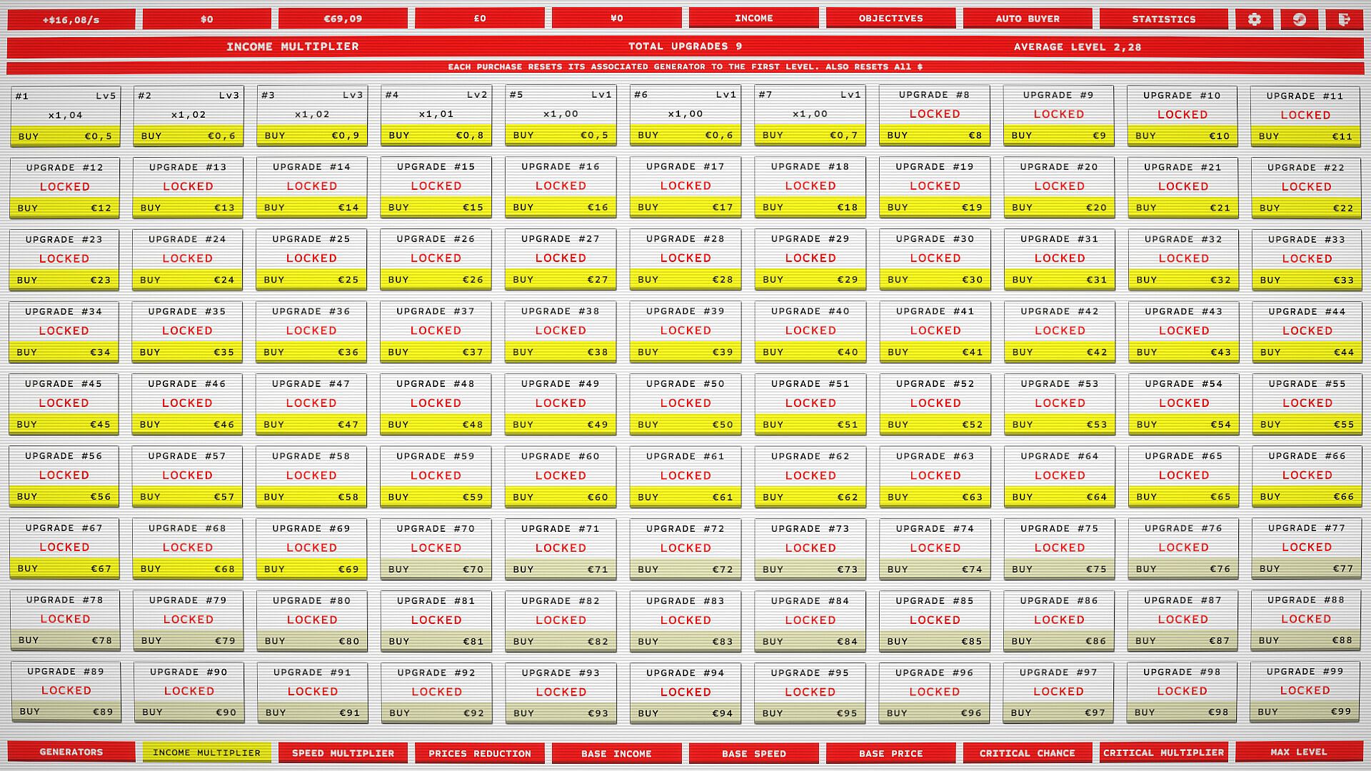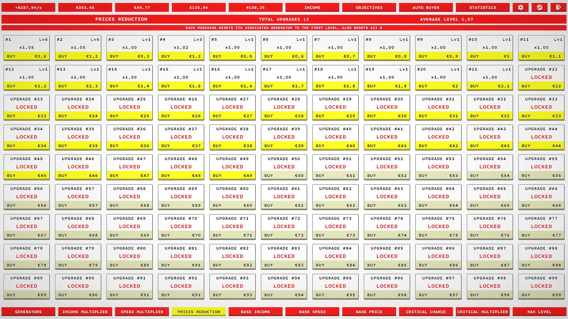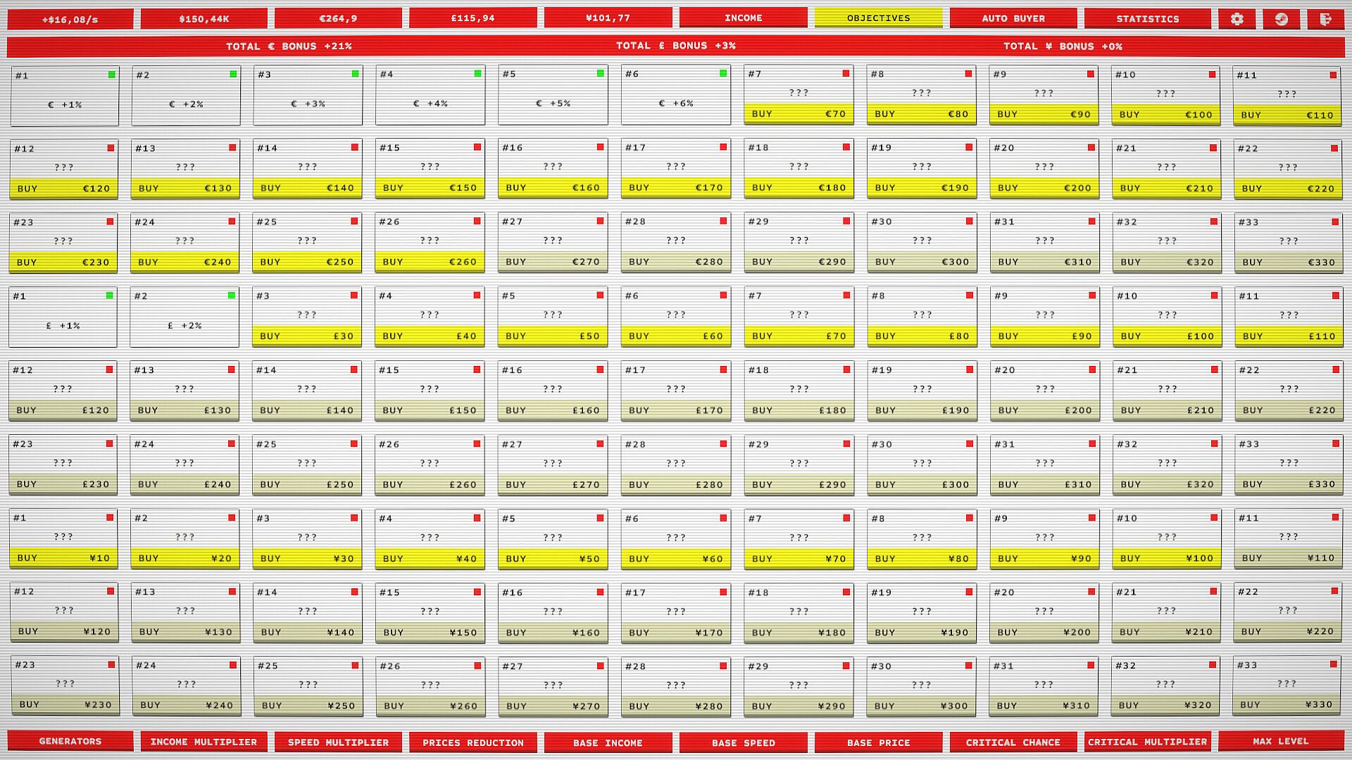 You start with 99 income generators. Optimize your profits by upgrading each one individually. Use up to 10 special prestige upgrades per generator by performing a localized reset. Invest in special currency generators and find the optimal strategy to complete every goal and challenge!