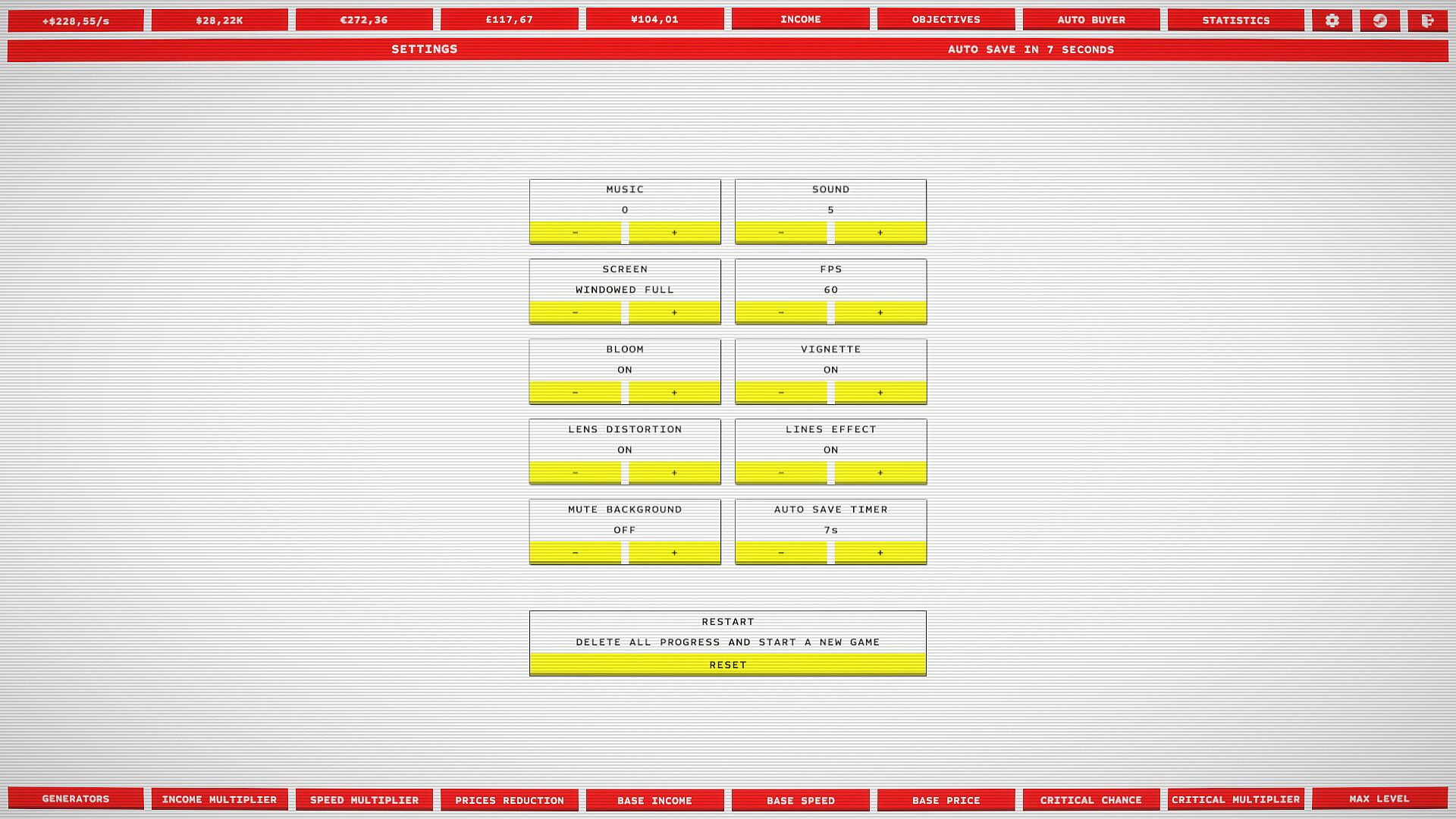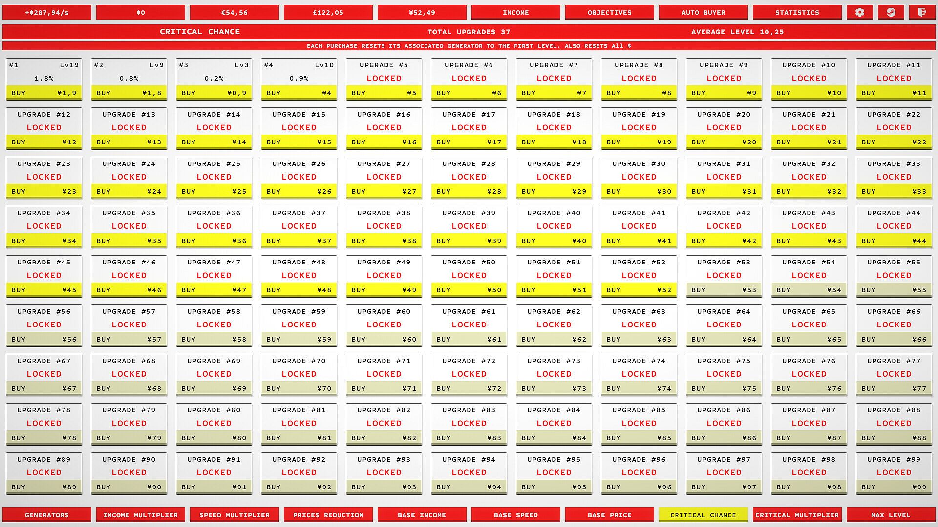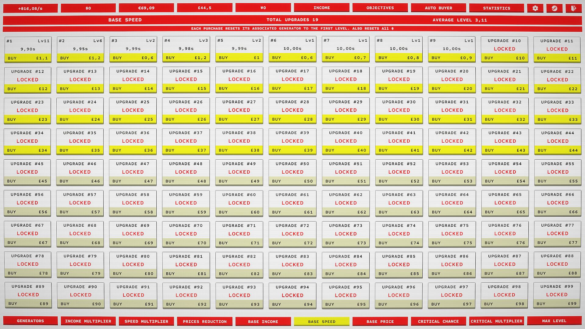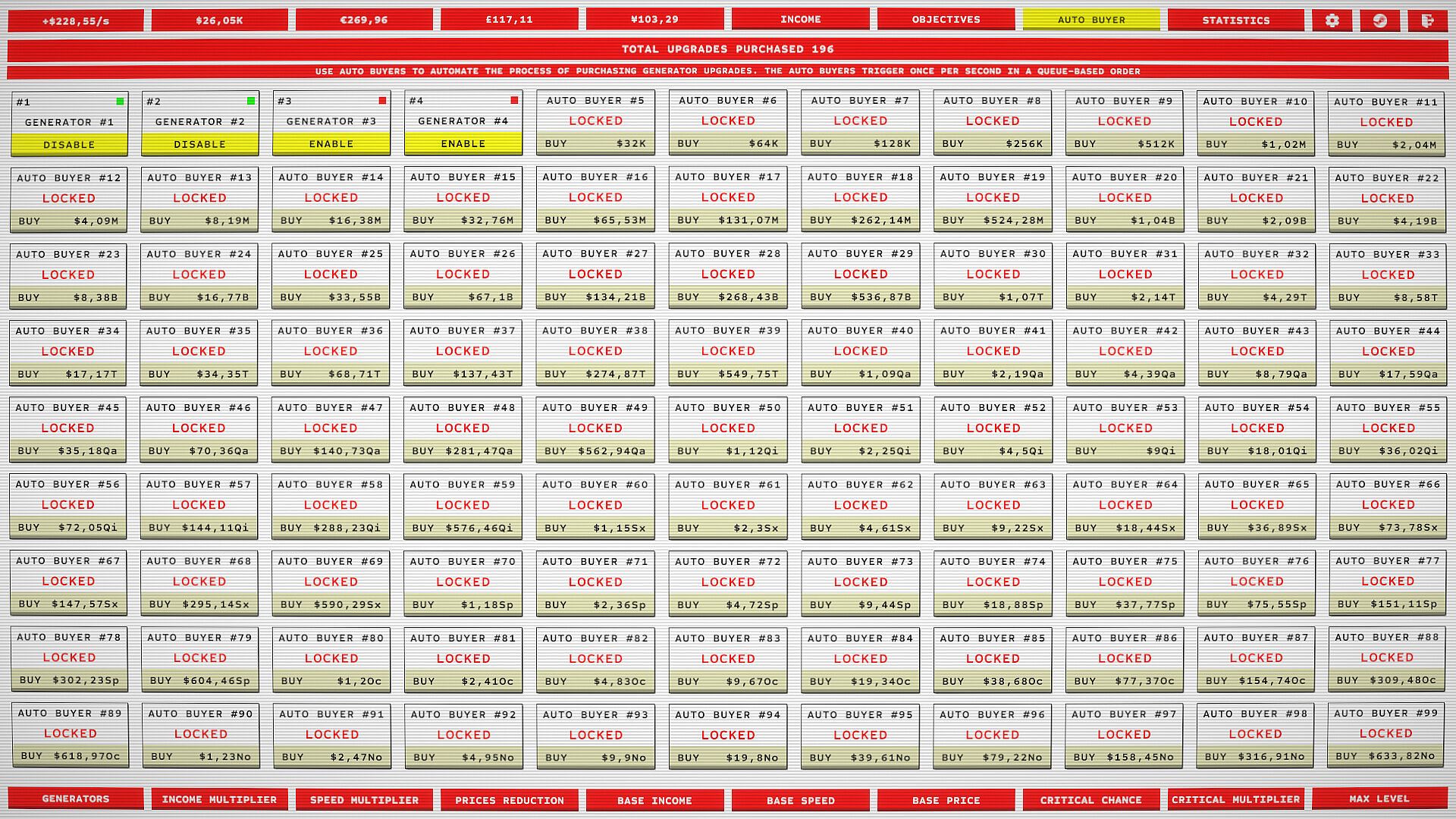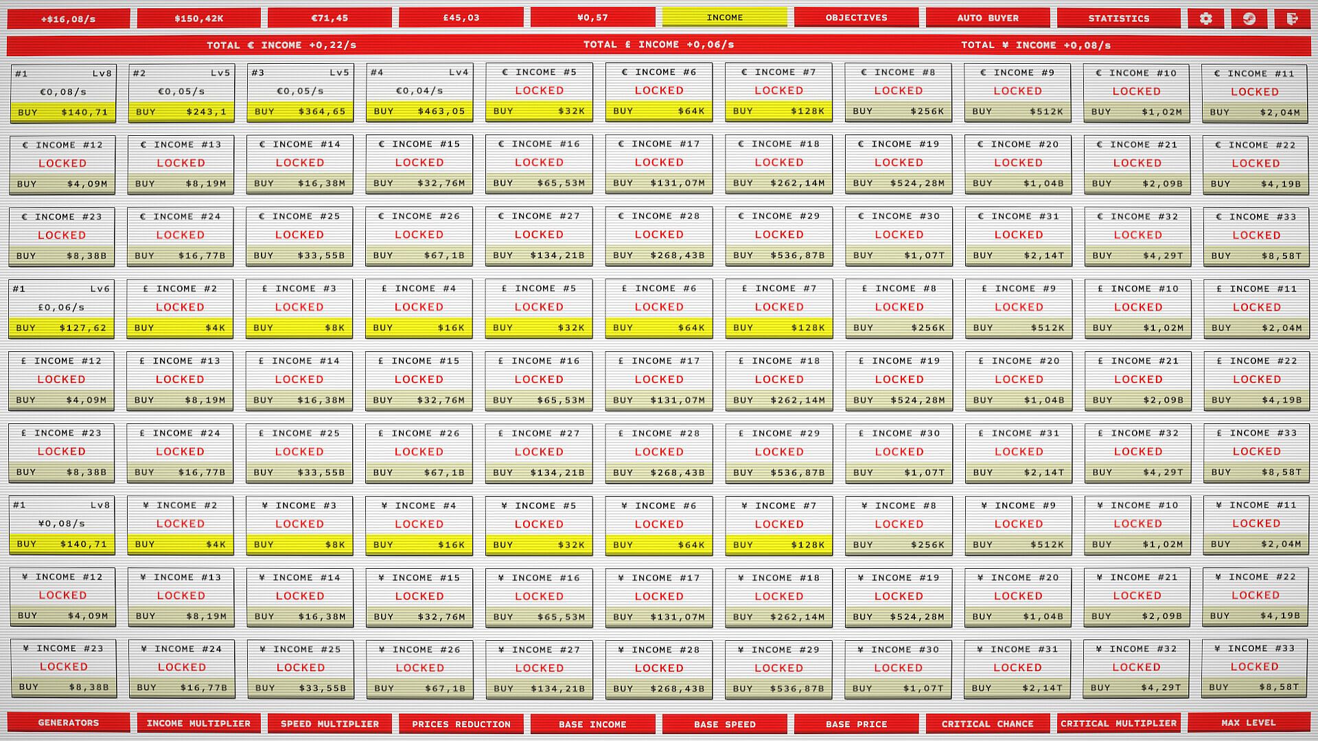 You start with 99 income generators. Optimize your profits by upgrading each one individually. Use up to 10 special prestige upgrades per generator by performing a localized reset. Invest in special currency generators and find the optimal strategy to complete every goal and challenge!