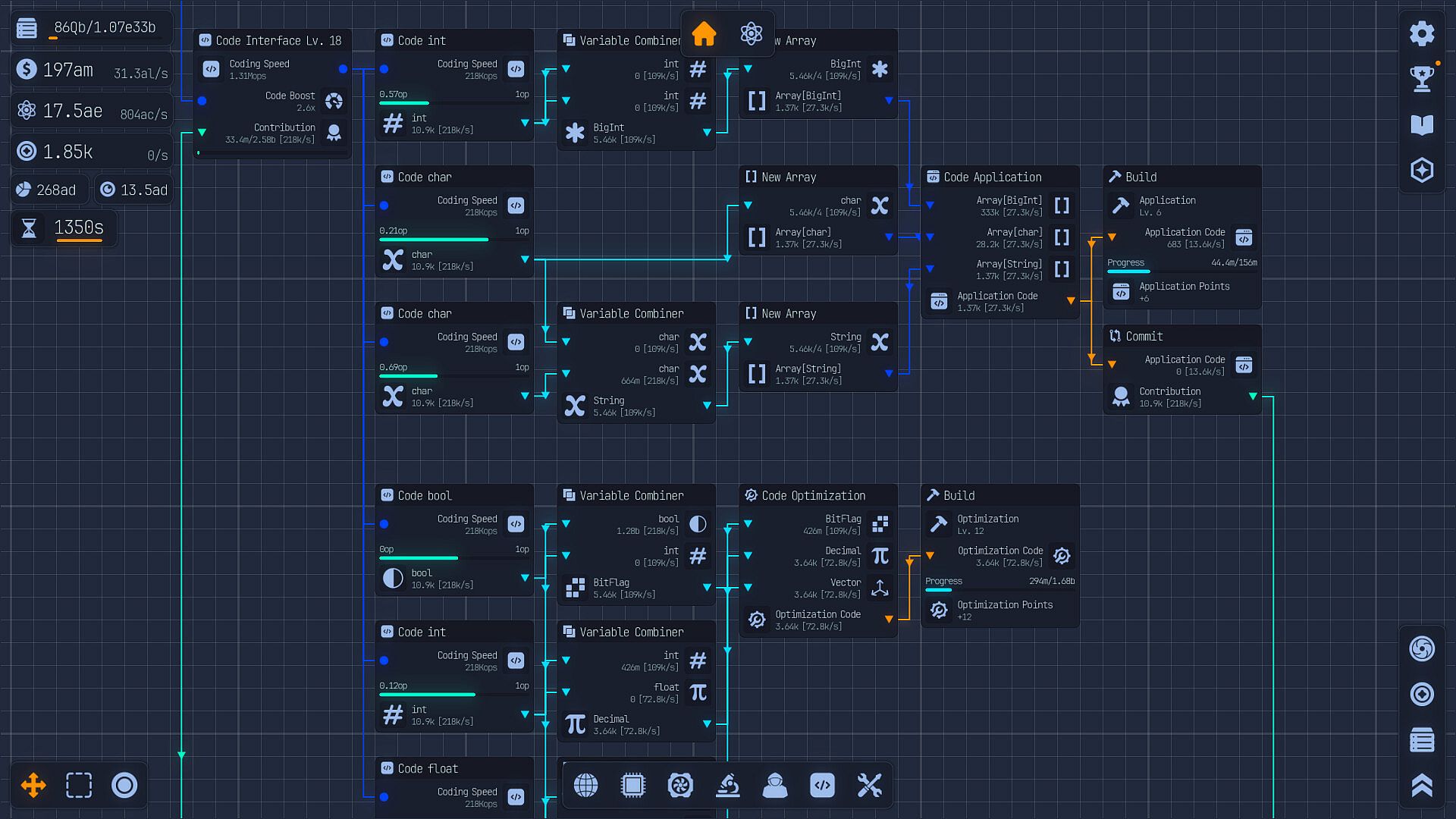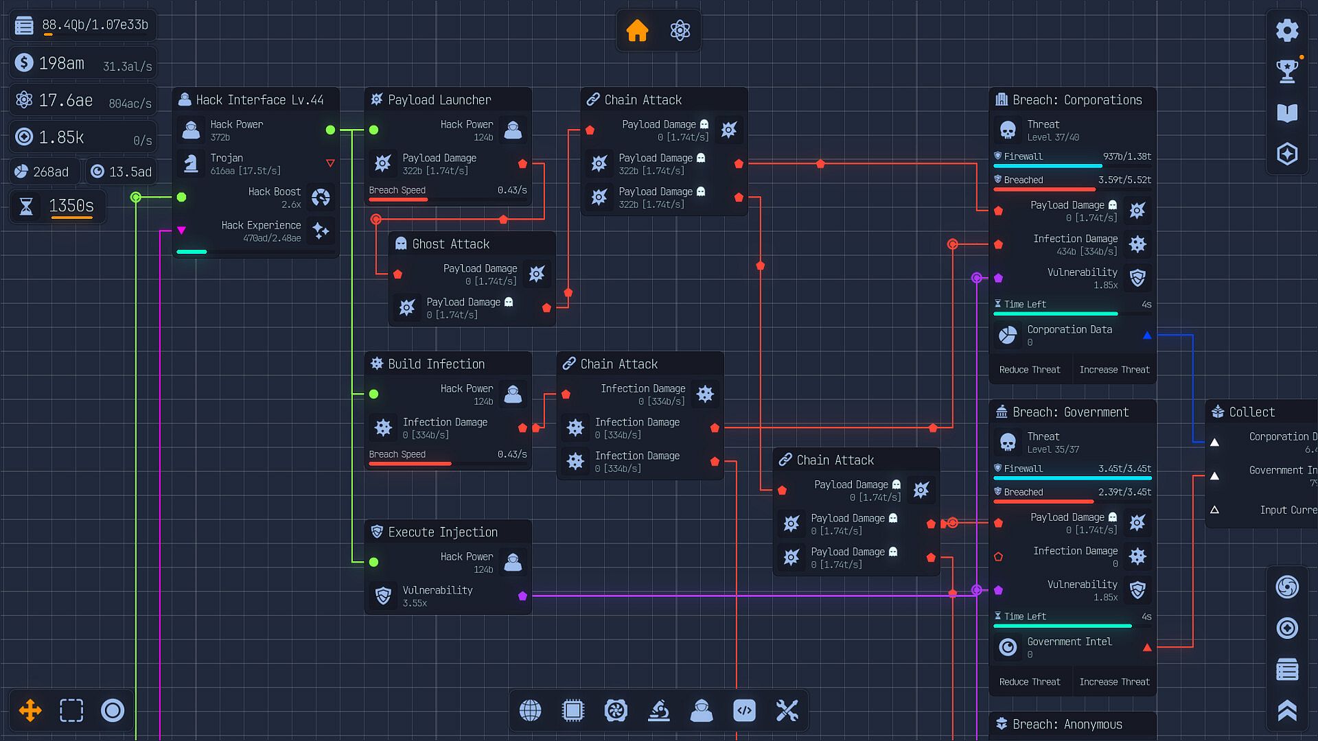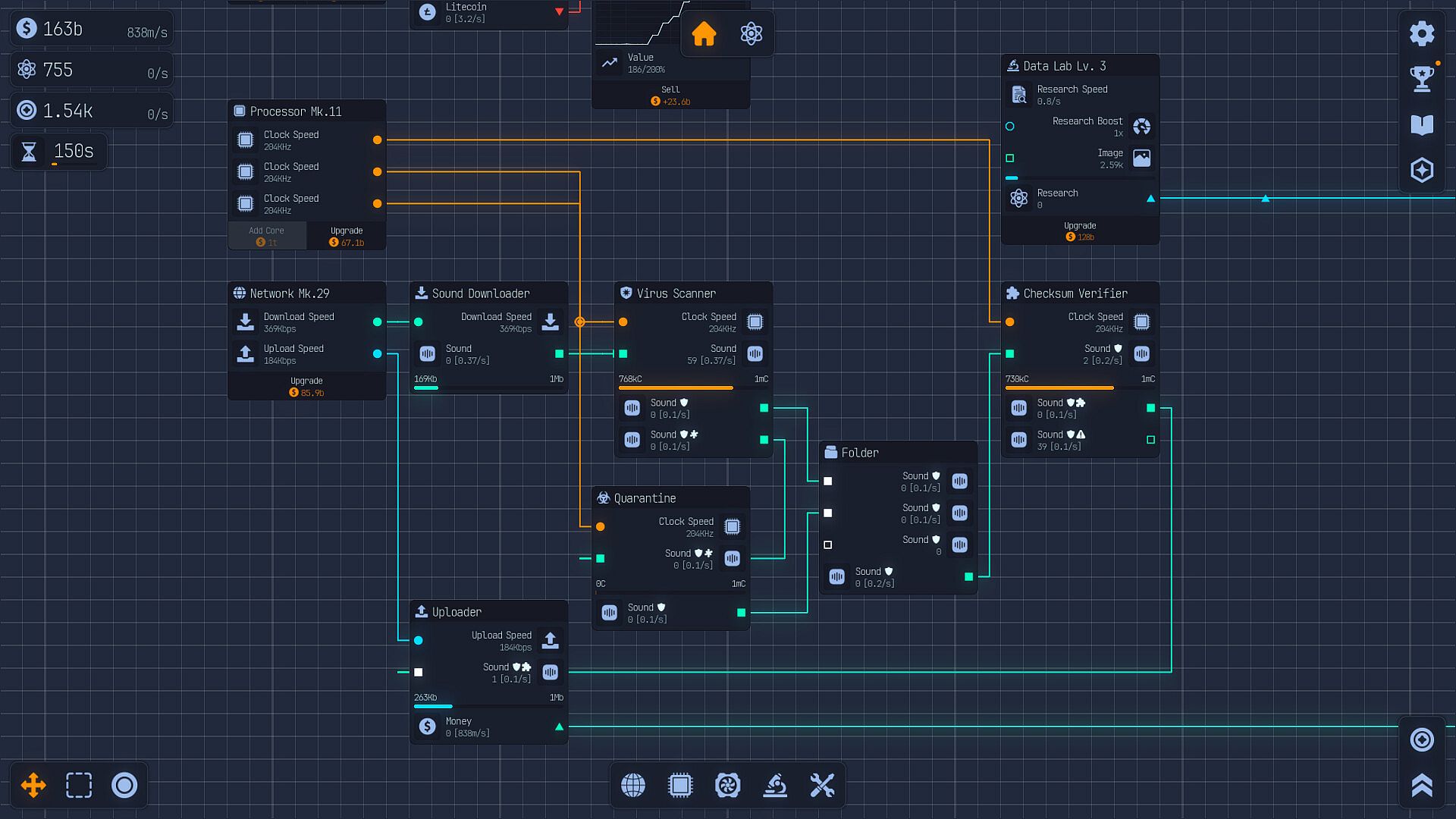 Welcome to the Labs! In Upload Labs you are tasked to save the universe from the inevitable heat death. Use your ingenuity and power to build optimized systems using a node-based system. These nodes are window-like interfaces representing components and processes within your computer. You will connect nodes from output to input to control resource flow and data pipelines