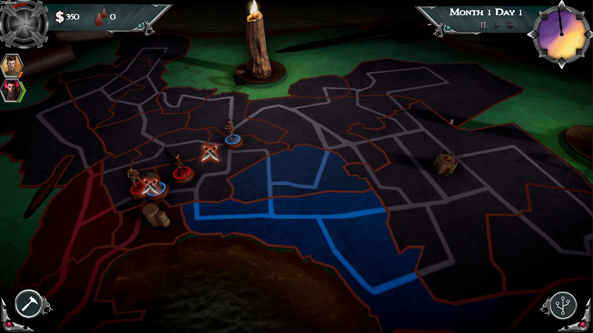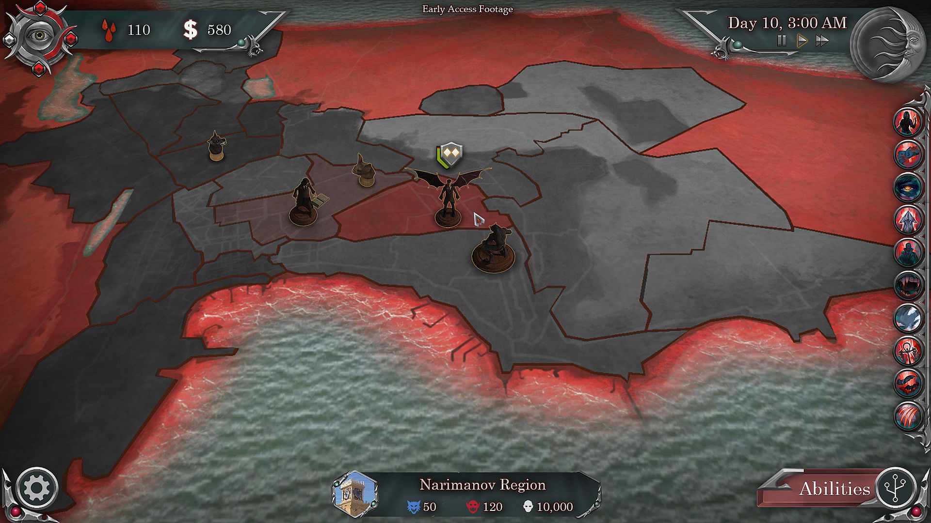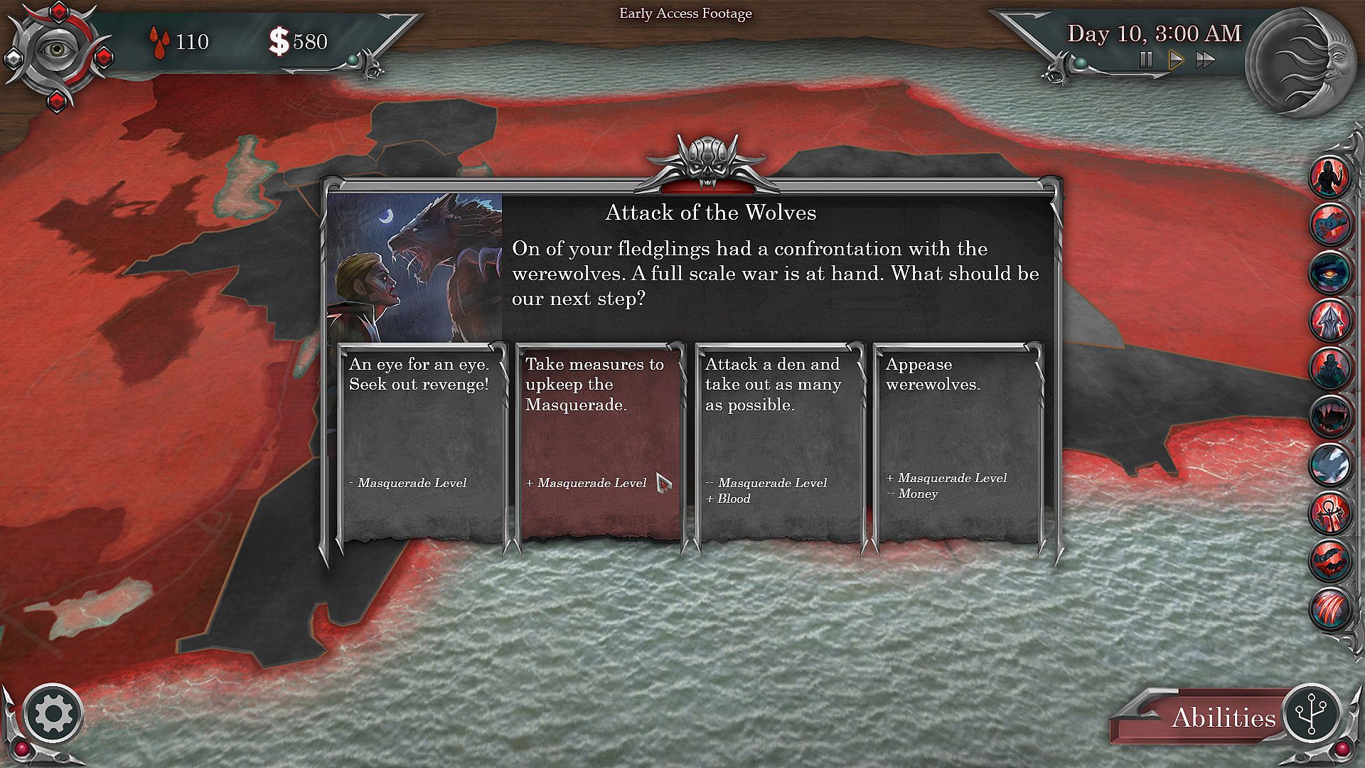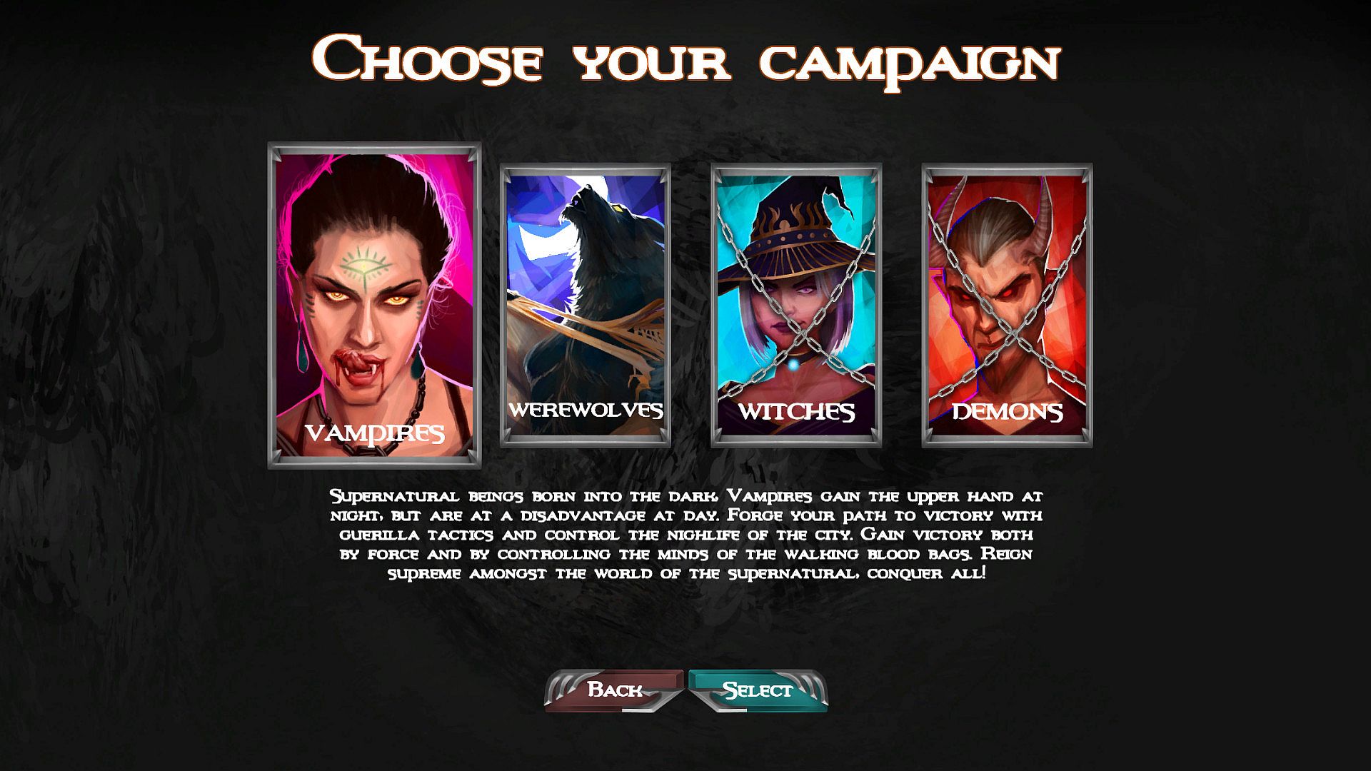 In UF: Vampires vs Werewolves you first choose one of the Supernatural factions, like Vampires or Werewolves with the goal of conquering different cities of the world (there will be more factions with upcoming updates). You play a 1v1 real-time strategy battle where you control your units to capture regions of the map. The player will have to manage their resources, and balance early-game aggression via spamming units on board with the late-game combo abilities that can annihilate the units very easily. You will be able to buy buildings in each region changing what kind of resources that region provides you with. In addition to the abilities, units, and buildings the game features lore-rich events that will introduce new characters, and will force you to make difficult decisions that will lead to game changing consequences. The variety in the combination above will make each gameplay unique, and will increase the replayability of the game.