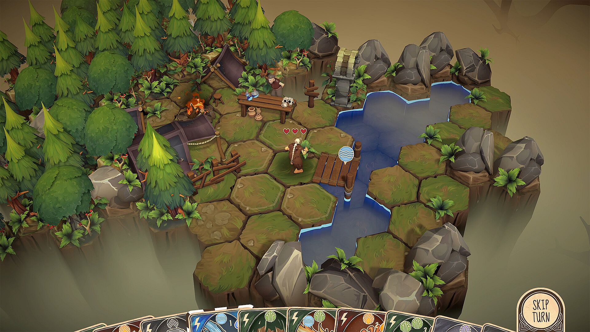 • Use hexagonal tiles with elemental resources (fire, water, wood, stone, and air) to cast powerful spells.