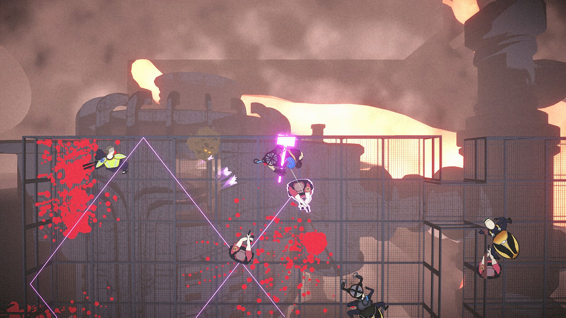 Utopium is a skill-based smack and dash, where every swing of your sledgehammer doubles as a teleporting trick-shot. 3D factory environments tower over hand-drawn 2D characters to the tune of boiler-suit beats. Discover the secrets of the factory and its fallen as you smash your way toward the CEO's palace to enact bloody vengeance.