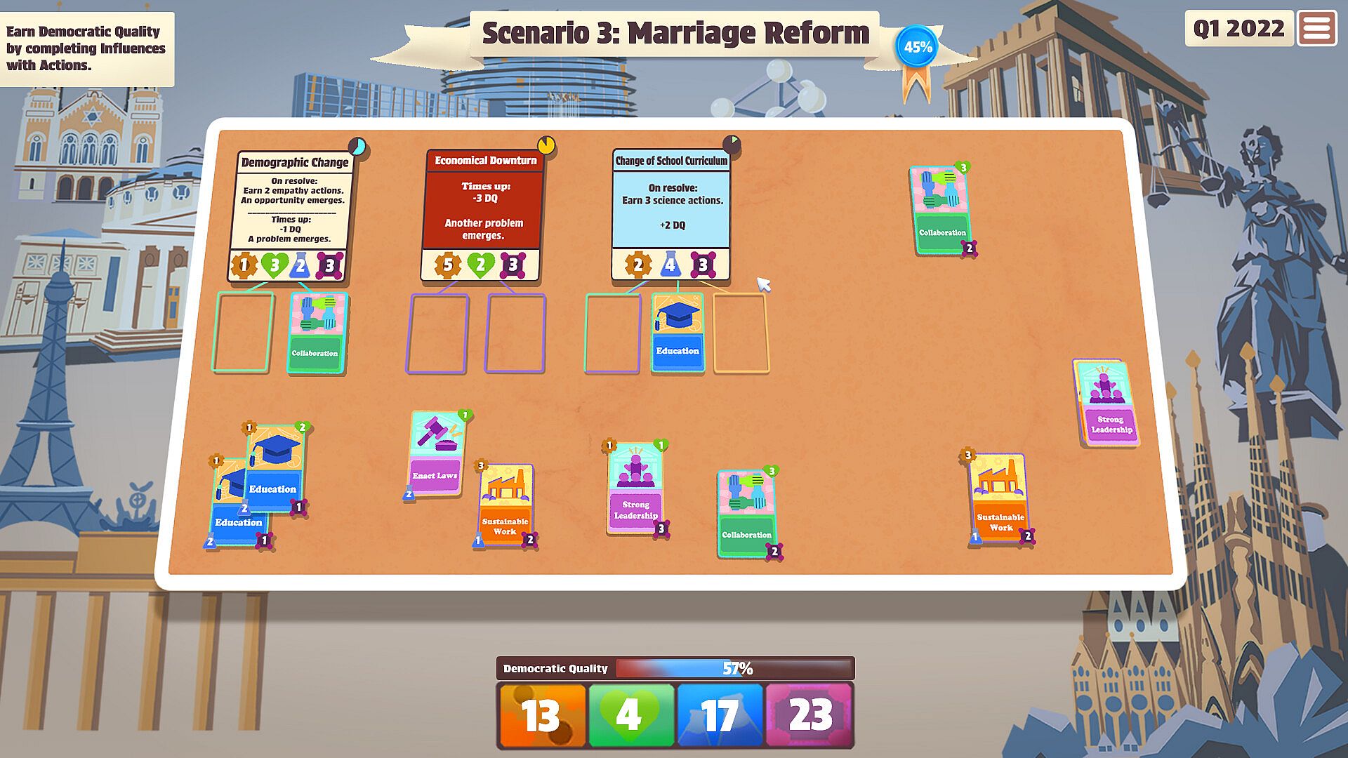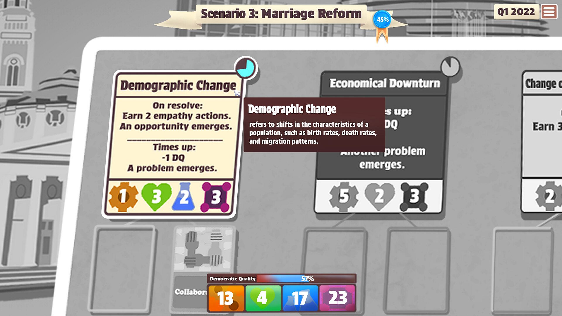 The entire game is played with cards on a board. Each quarter, you'll see new challenges appear.