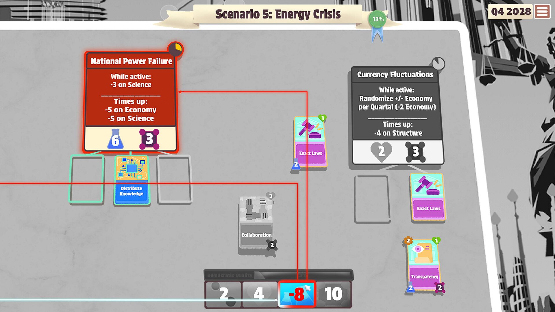 A simple card-based system: Draw action cards and drag them onto problems or opportunities to resolve them.