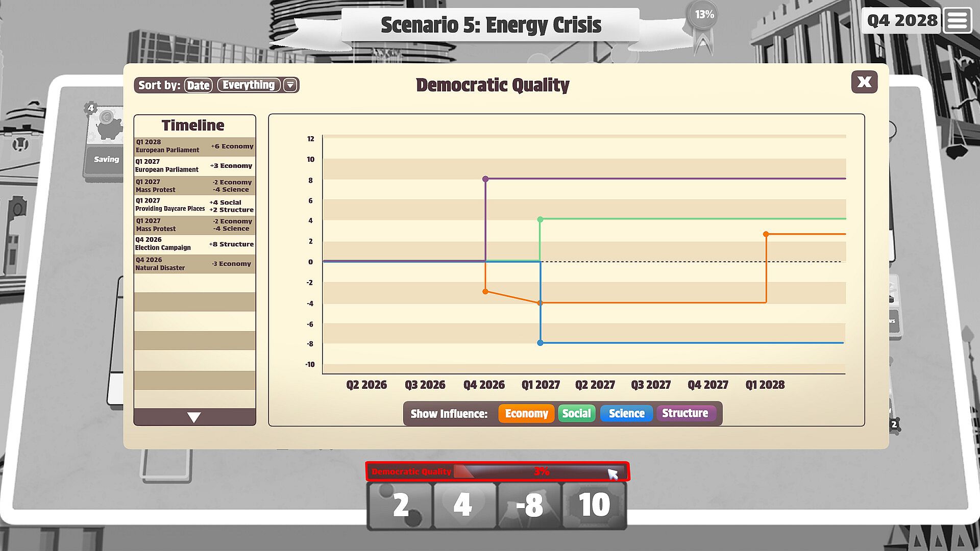 Inspired by European democracy: Explores themes of social responsibility, economic policy, and political trade-offs in an interactive way.