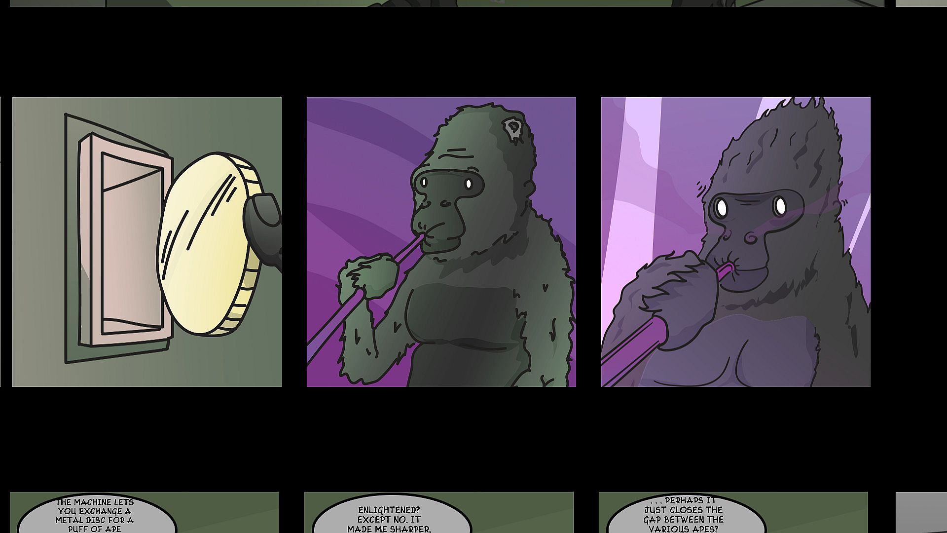 vApe Escape is a point-and-click adventure in a science fiction comedy setting. The player takes control of an innocent ape who must escape the sad destiny of becoming a vape dispenser machine for the wealthy hipsters of the universe.