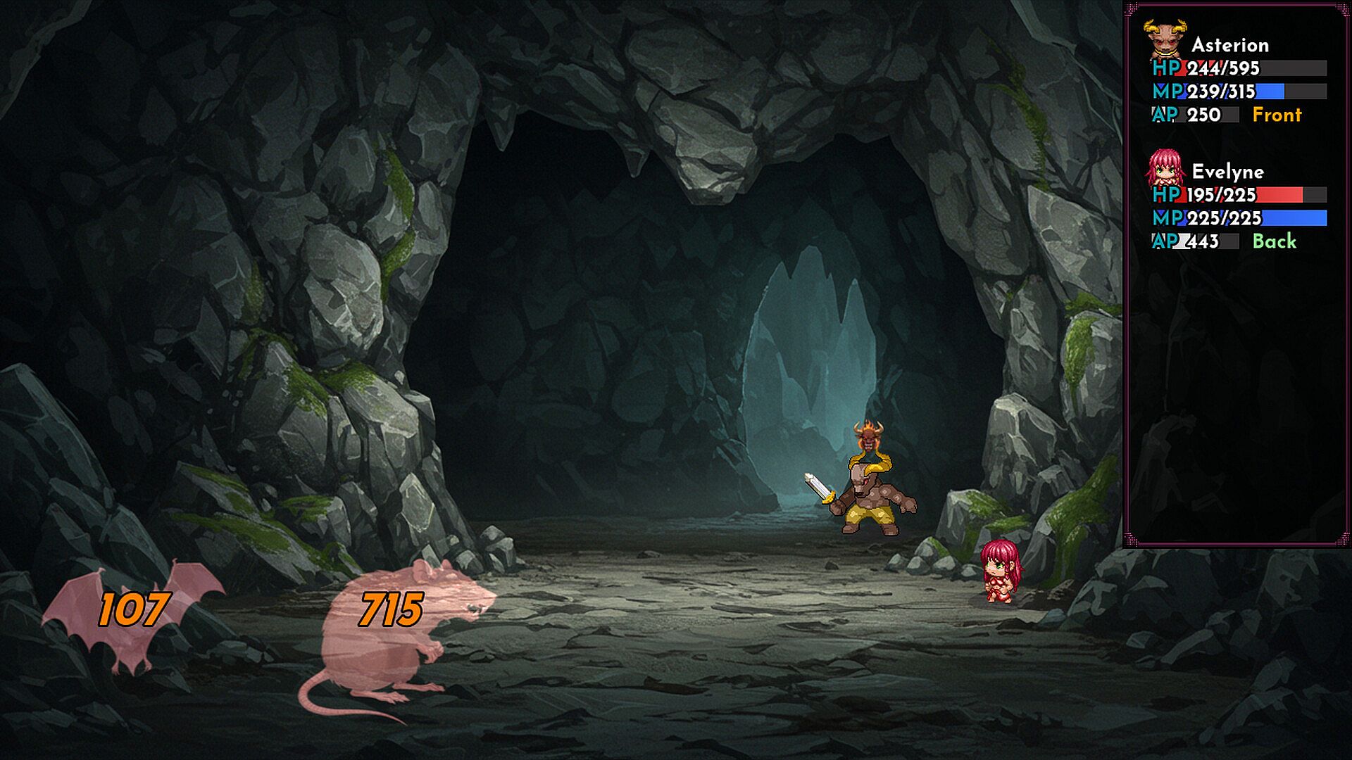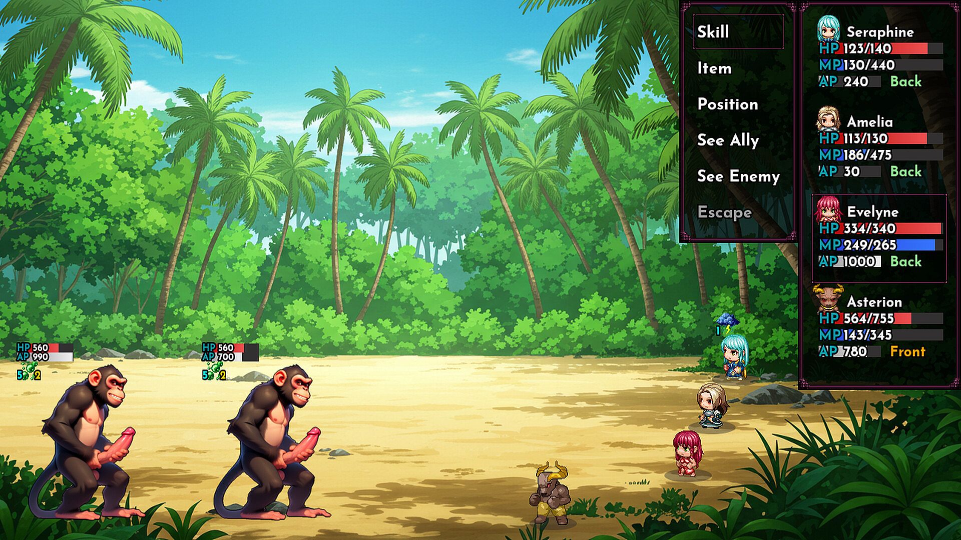 Defeat enemies through strategic turn-based combat using diverse skill combinations. Rape weakened enemies to grow stronger.