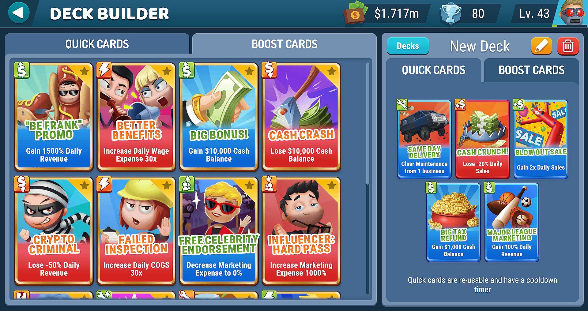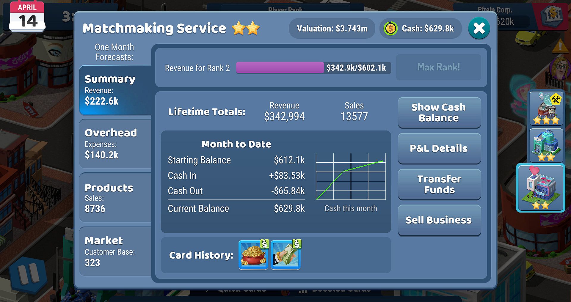 Compete against friends and rivals in this esports-style multiplayer game by playing cards that disrupt opponents or strengthen your own companies. Start with a dog walking business in Fortune Springs to learn basics like setting prices, wages, and card play against bots. Advance to Mapleburgs for quirky expansions like llama and alligator walking, then tackle Brickyard challenges with theaters, flower shops, and hovercraft services before claiming top ranks in futuristic The Palms. Upgrade your HQ from an RV to lavish options and climb to the Venture Tower penthouse. Reinvest earnings to grow enterprises from mini-golf and pizza parlors to drone delivery and robot factories. Casual strategy fans who enjoy simulation-style business battles and multiplayer lobbies will find a perfect fit.