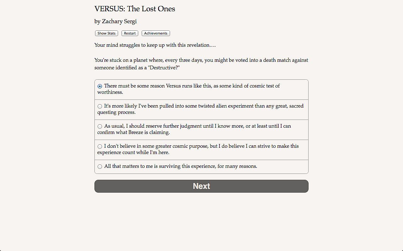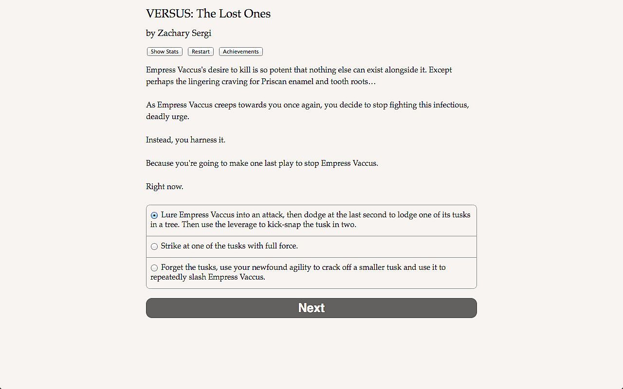 Versus: The Lost Ones is a thrilling 123,000-word interactive novel by Zachary Sergi, author of our best-selling Heroes Rise trilogy. Your choices control the story. It's entirely text-based--without graphics or sound effects--and fueled by the vast, unstoppable power of your imagination.