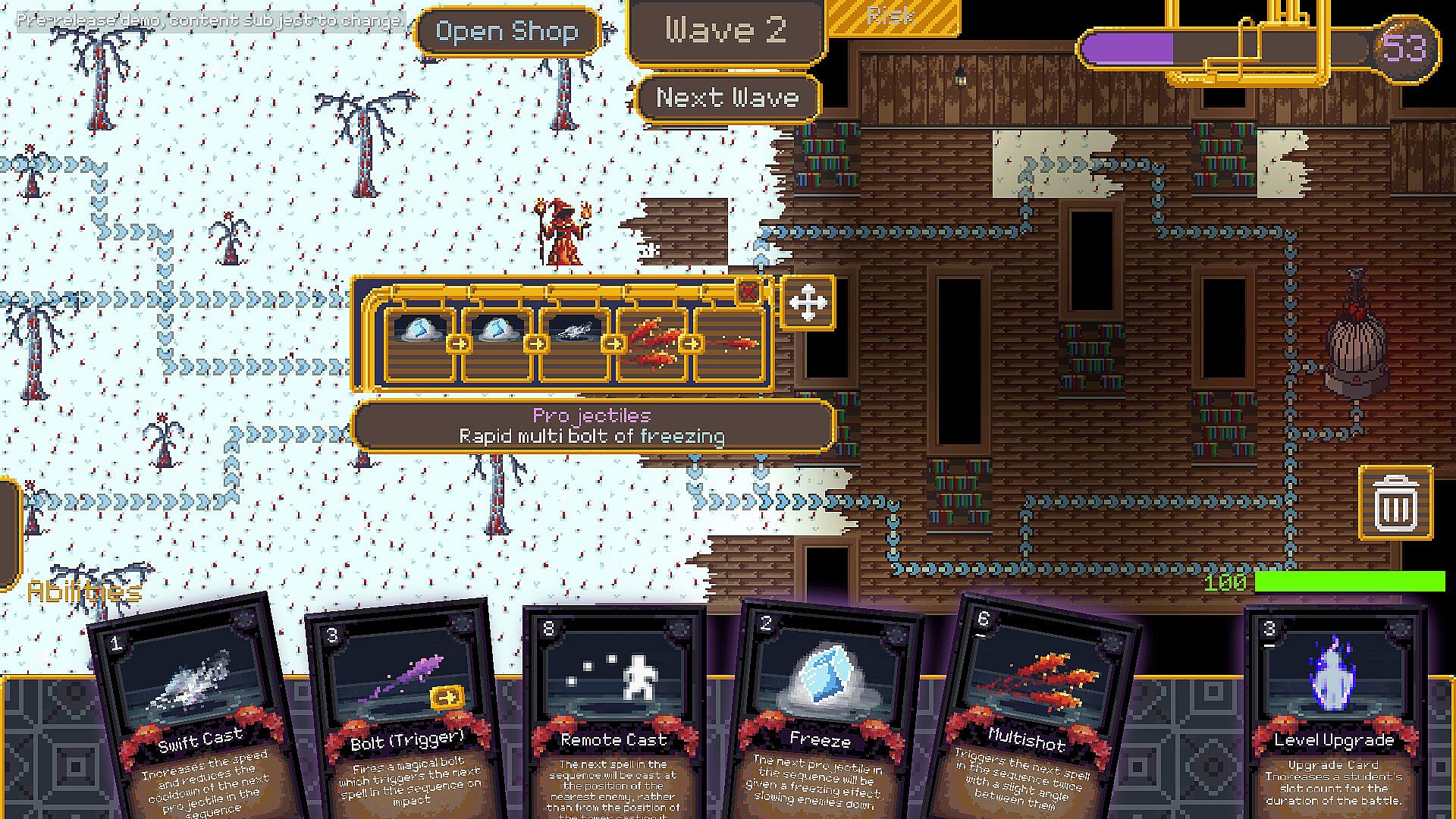 Modifier spells modify the fired projectiles with effects like swift-cast and freeze-shot.