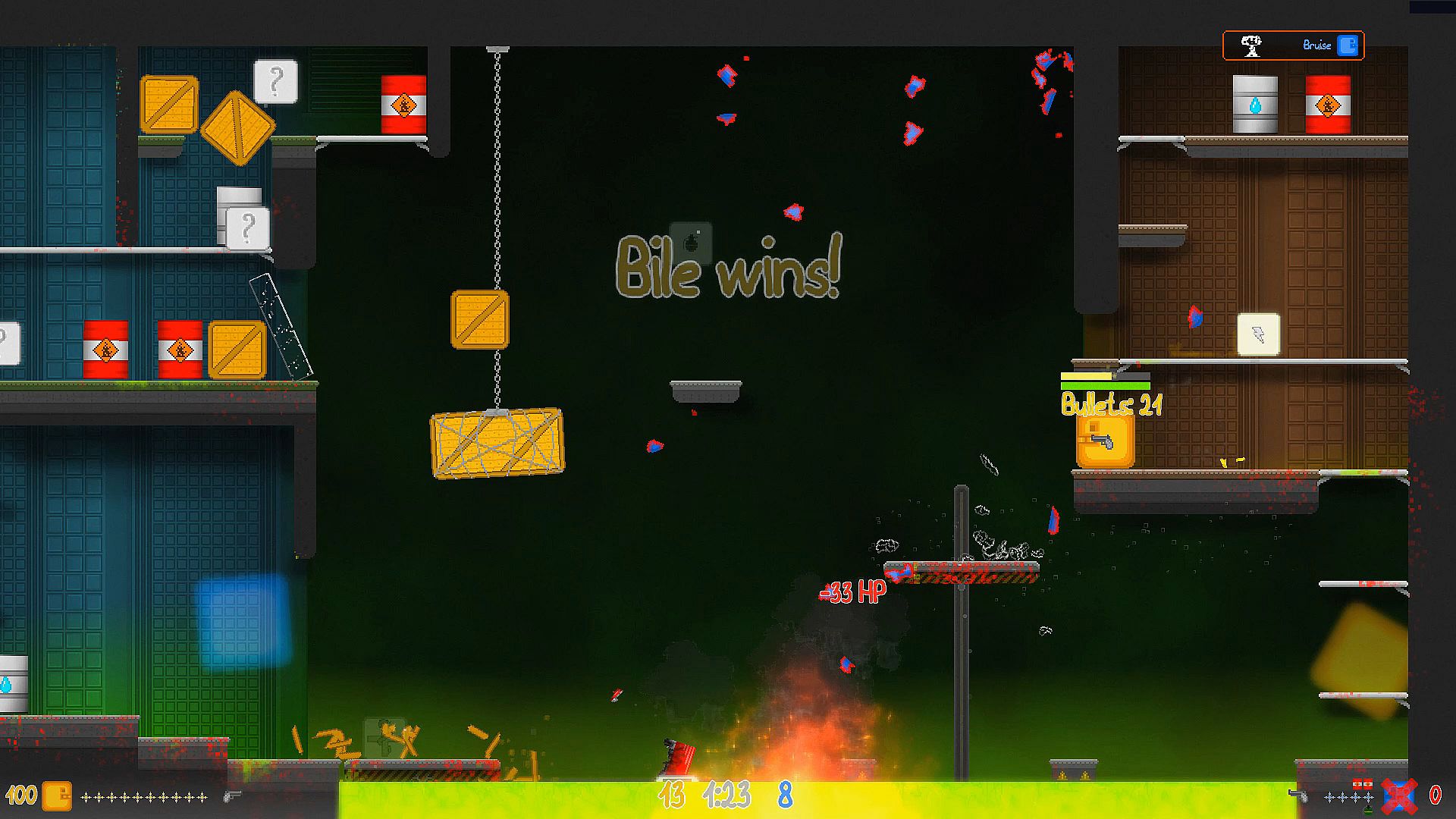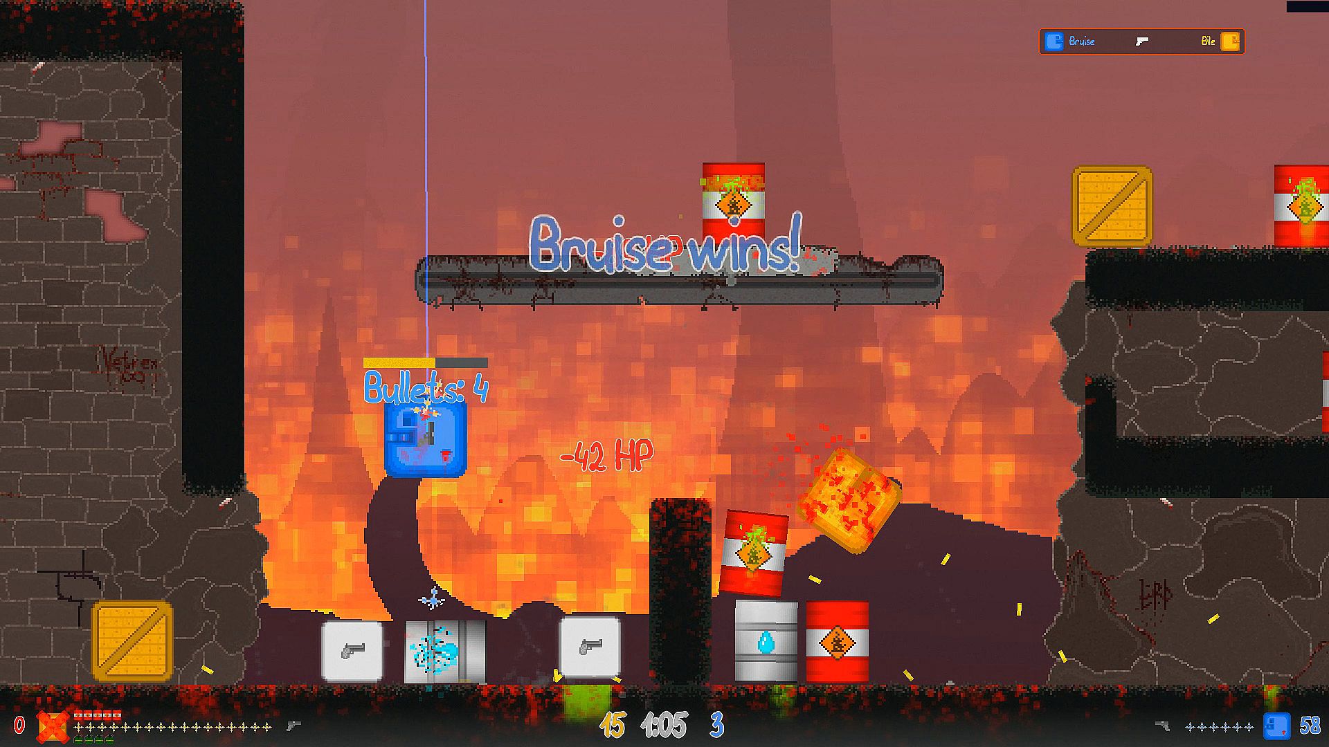 Competitive - the game lasts a maximum of 30 rounds, the winner is the one who reaches 16 wins , or draw 15 and 15 . The player's rebirth after death occurs after 3 seconds, that is, there is a chance of a draw in the round if the opponent also dies at this time. Also in this mode there is a timer for 1.5 minutes , after this time the player with the least amount of health dies (armor does not count). If everyone's health is the same, then both players die.Deathmatch - the game lasts a maximum of 61 rounds, the winner is the one who has superiority over the opponent by 8 wins , or the one who first reaches 31 wins. The player's rebirth after death occurs almost instantly, but there is still a chance that both players will die at the same time. In this mode the spawn frequency of weapons, ammunition, boxes and barrels has been increased . In this mode, the game is more dynamic, so you won't get bored, fun is guaranteed to you)