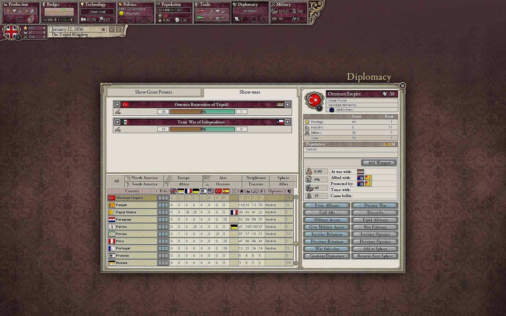 Carefully guide your nation from the era of absolute monarchies in the early 19th century, through expansion and colonization, to finally become a truly great power by the dawn of the 20th century.
